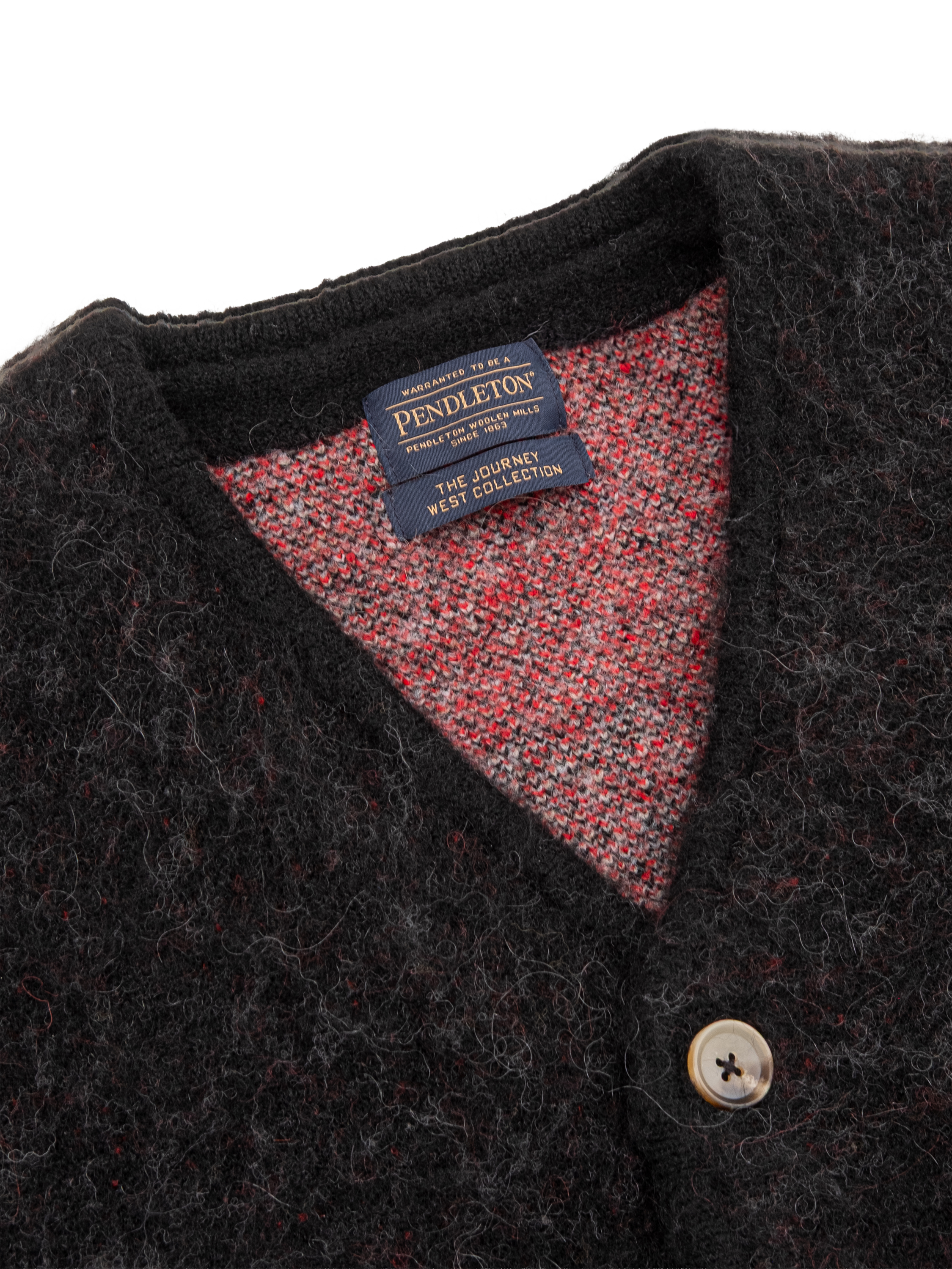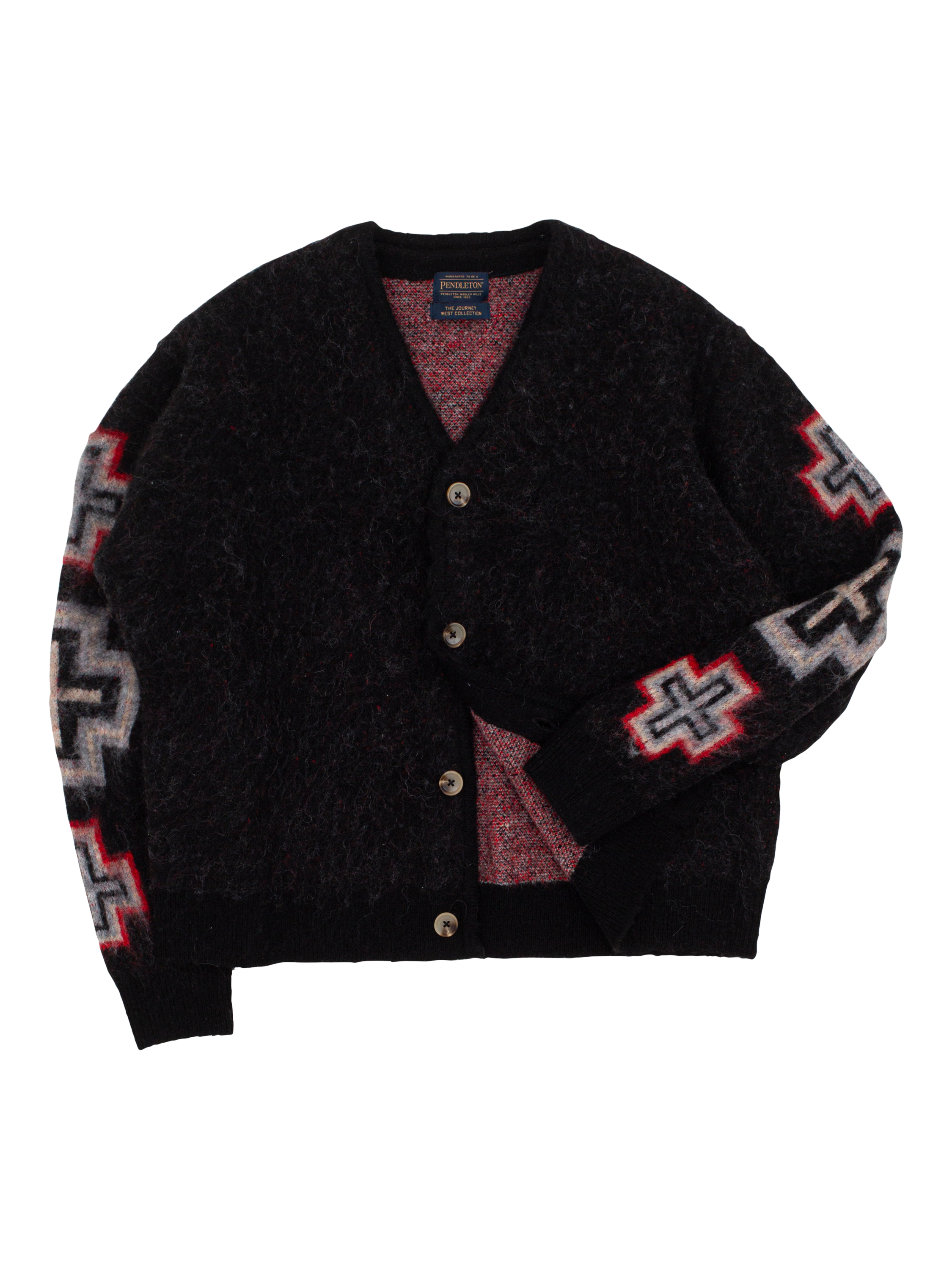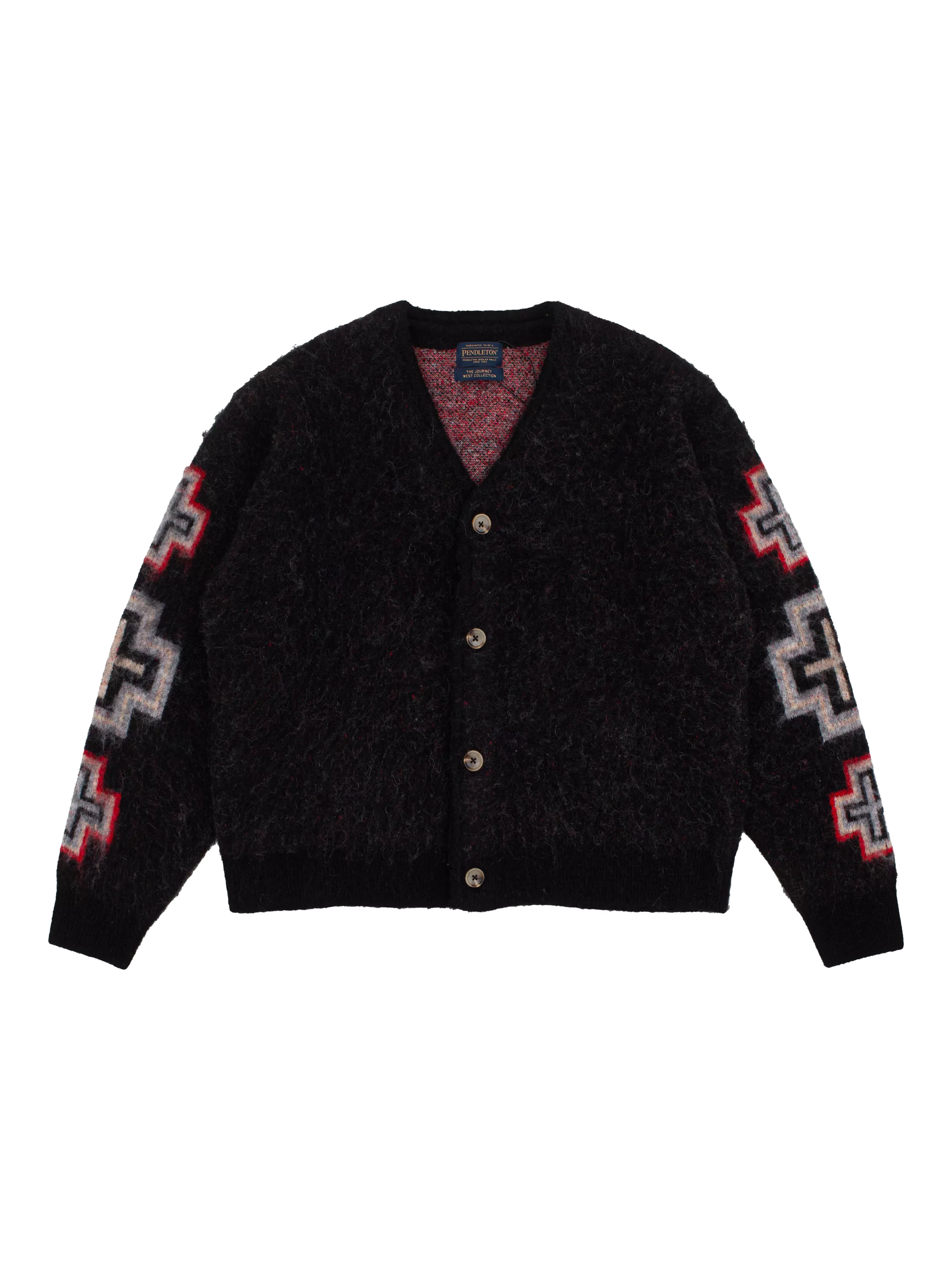 The iconic Pendleton style San Miguel is inspired by mid to late nineteenth-century Native American weaving traditions and the influence of Spanish missionaries in the Southwest of the USA. The design's roots are in the traditional banded Chief Joseph pattern, which evolved into a nine-element layout. This V-neck cardigan is made with luxurious wool and mohair in the blend, for warmth and softness.