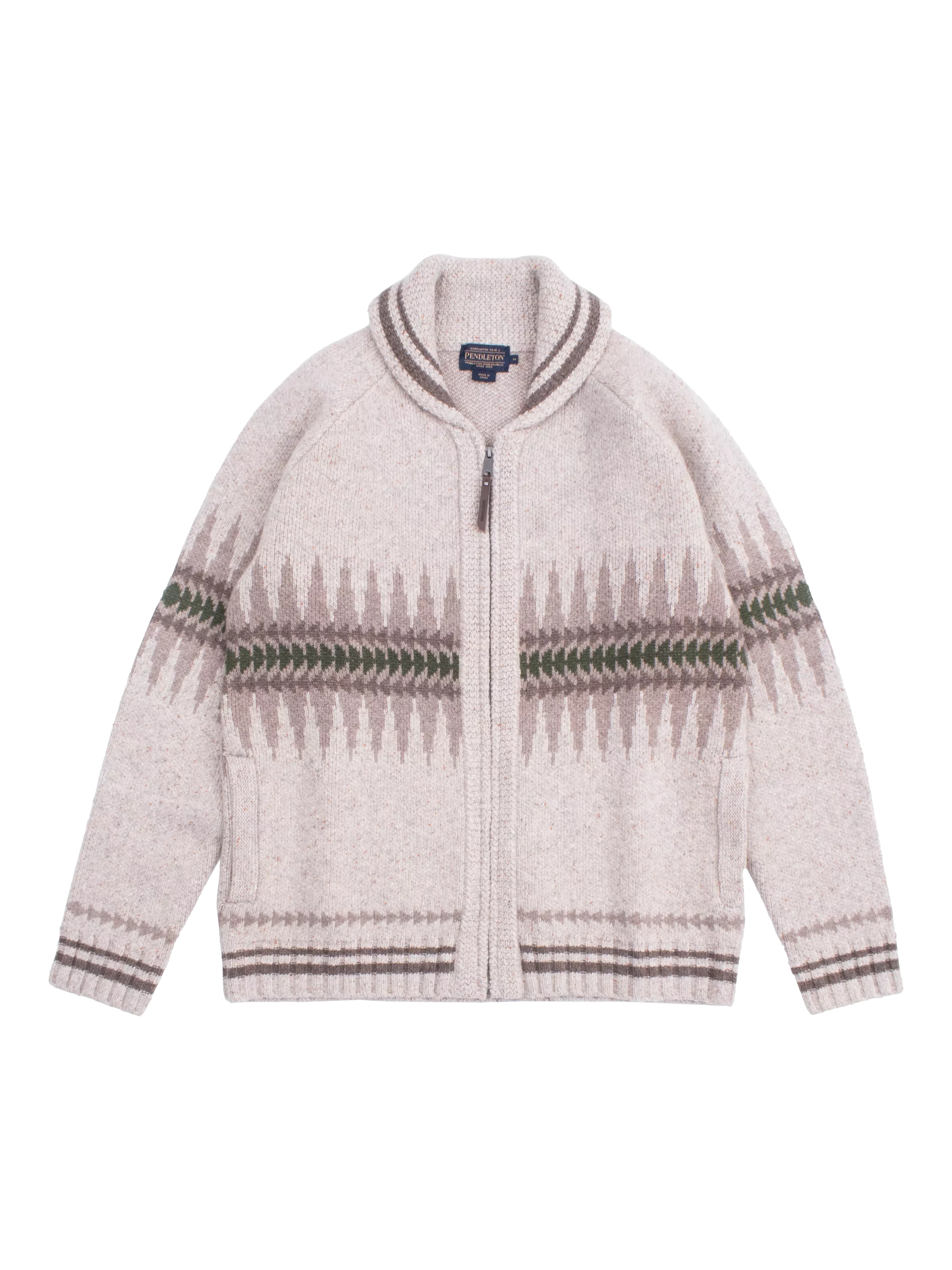A jumper with a vintage inspired sawtooth pattern, sporting a buck motif on the back. Featuring a shawl collar, side seam pockets, ribbed collar, cuff, hem and pockets, and a leather zipper pull.