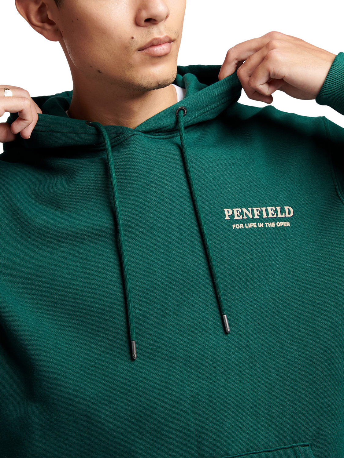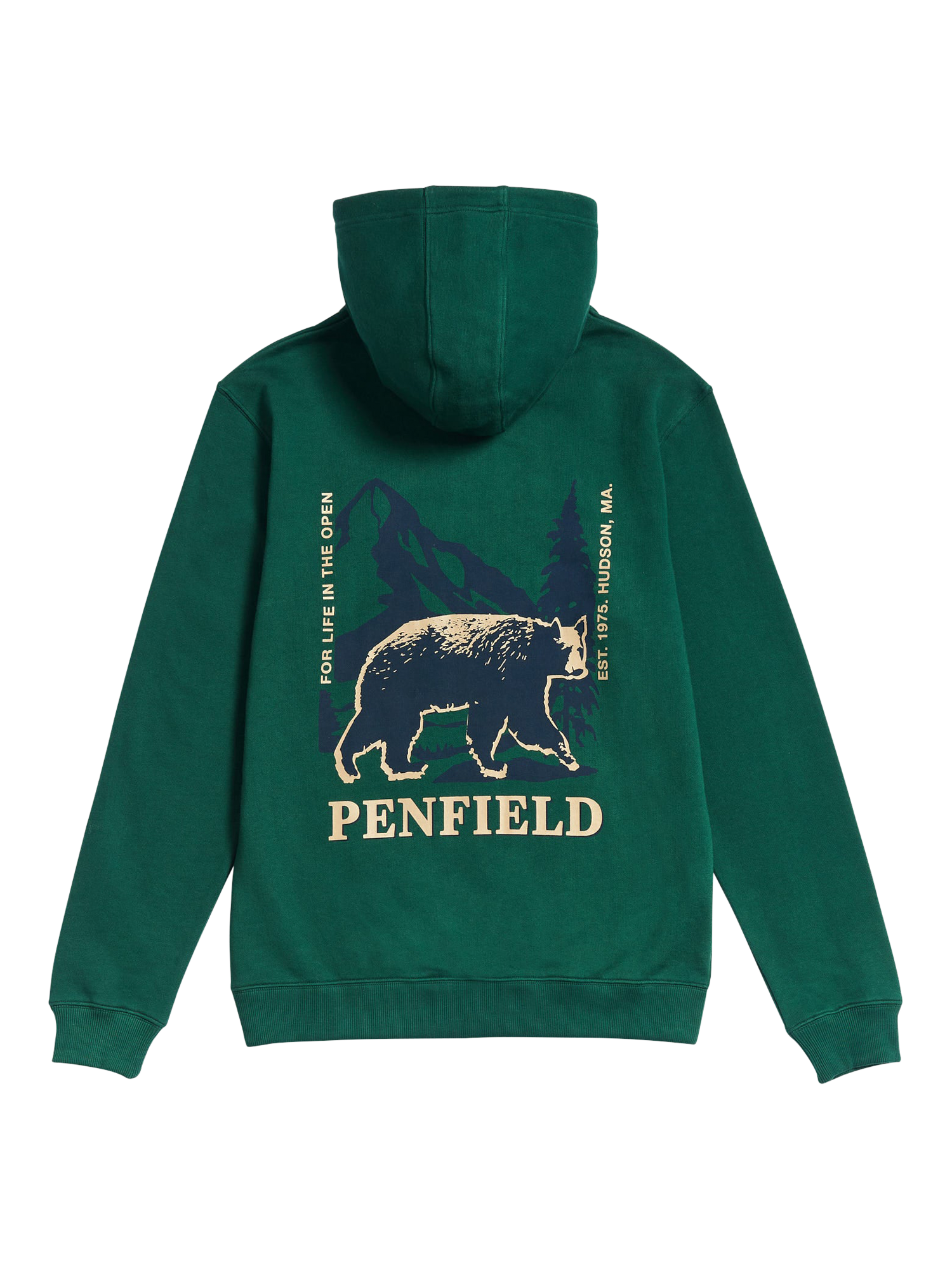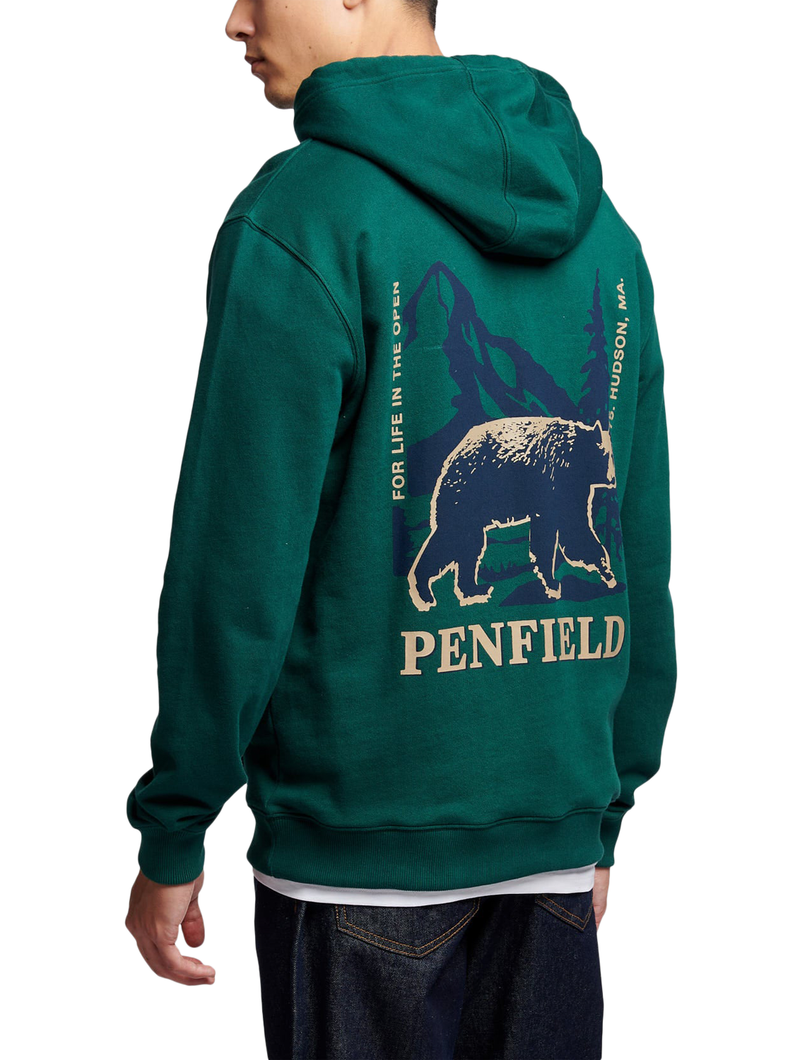 Crafted from 350gsm cotton blend loopback sweat fabric, it offers breathability and softness. The relaxed fit, ribbed hem, and cuffs provide a refined silhouette, while the 3-piece hood adds warmth. A small logo on the chest and a large black bear graphic on the back celebrate Penfield's heritage whilst a woven logo tab at the hem adds authenticity.
