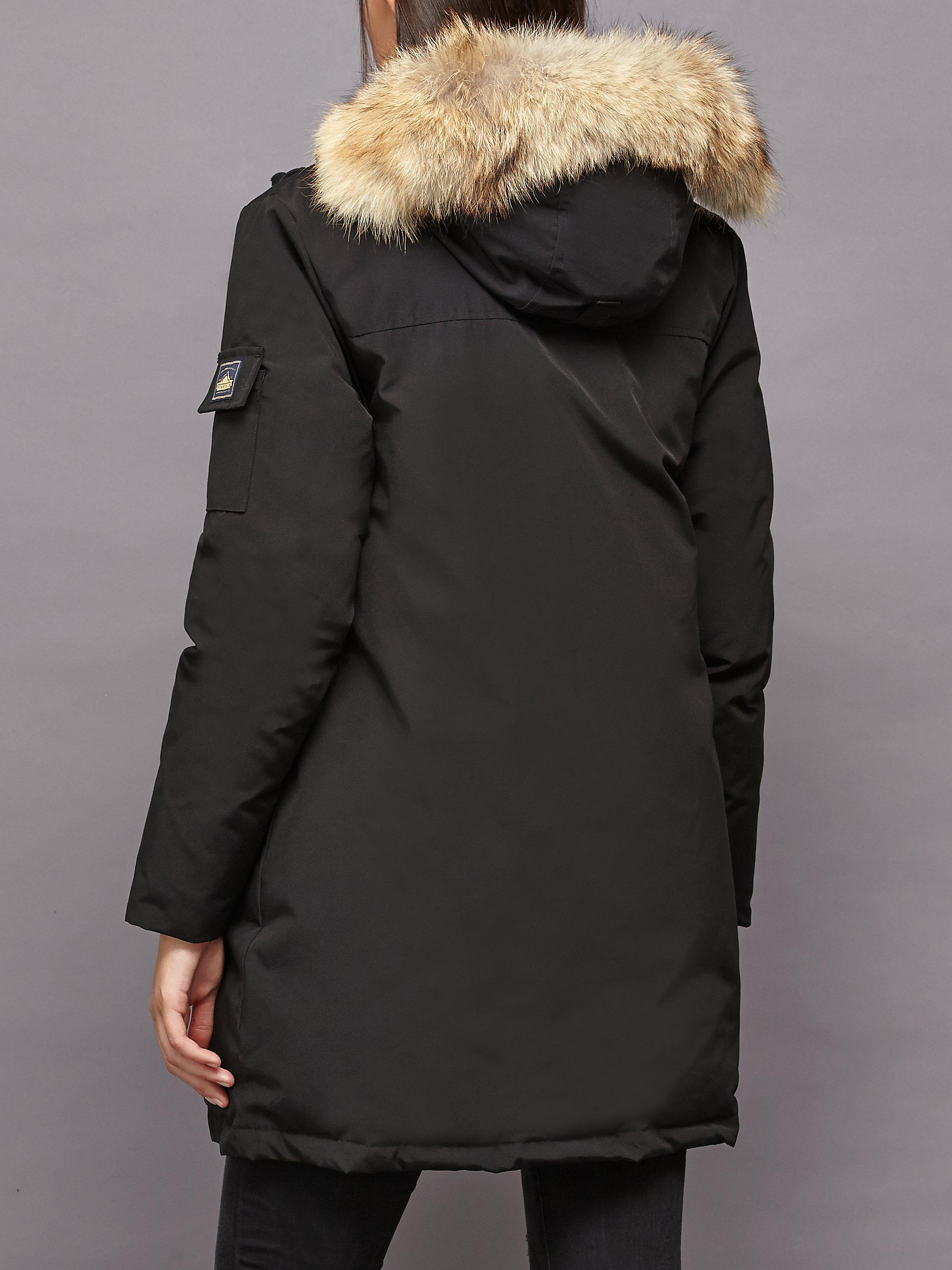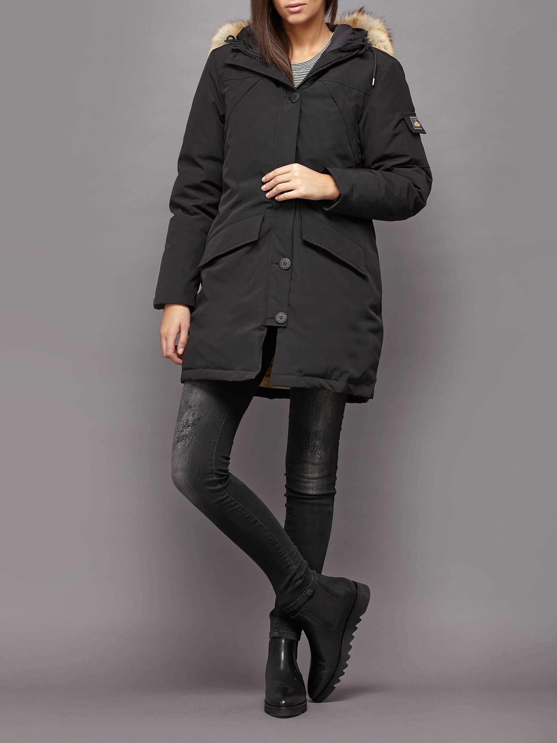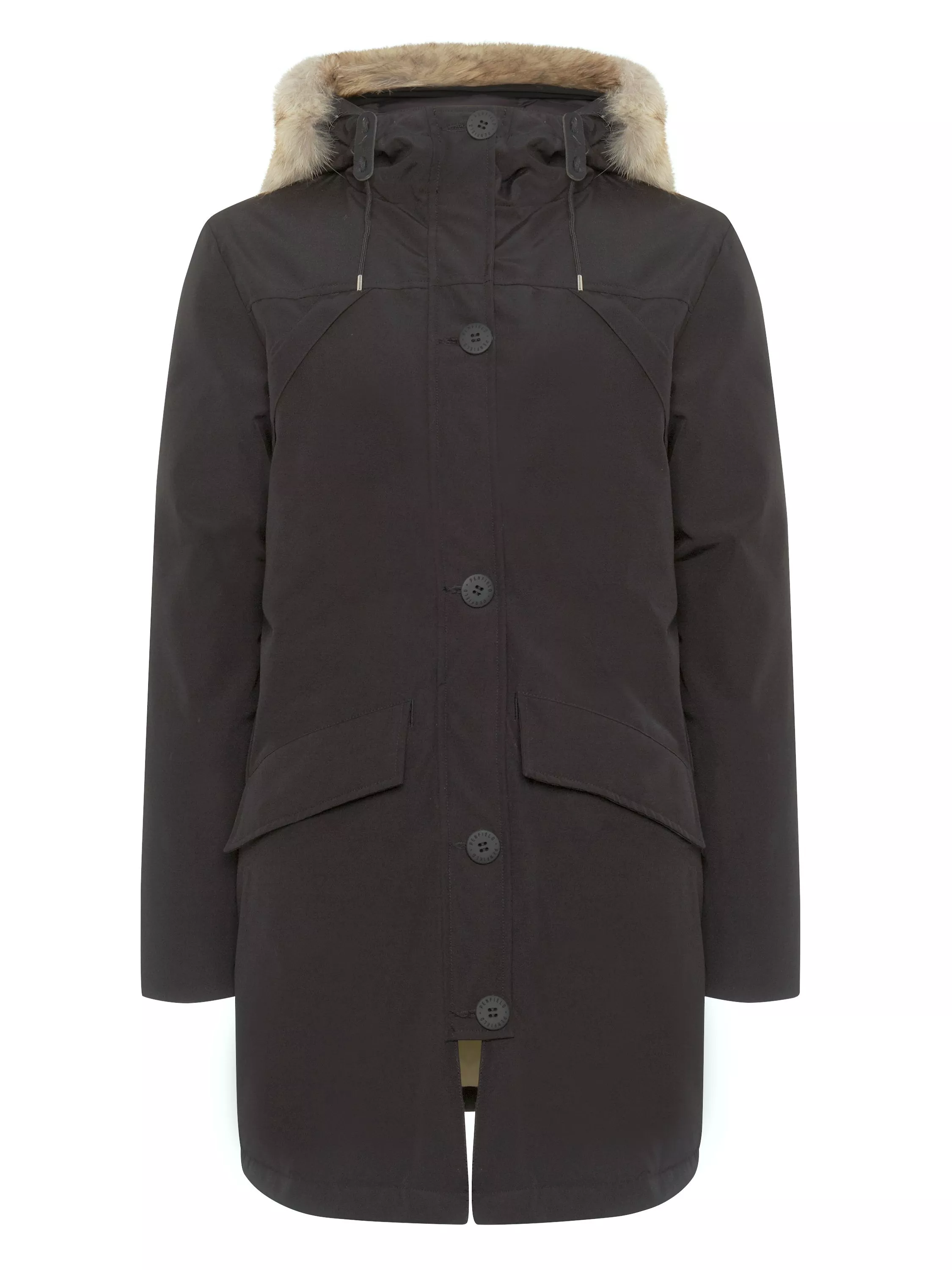 With its gorgeous cut, this water resistant and windproof jacket features a button down storm flap with an inside 2-way zip, a fully adjustable hood with rubberised cord locks and faux-fur trim; and 2 lower patch pockets and 2 zip chest pockets.