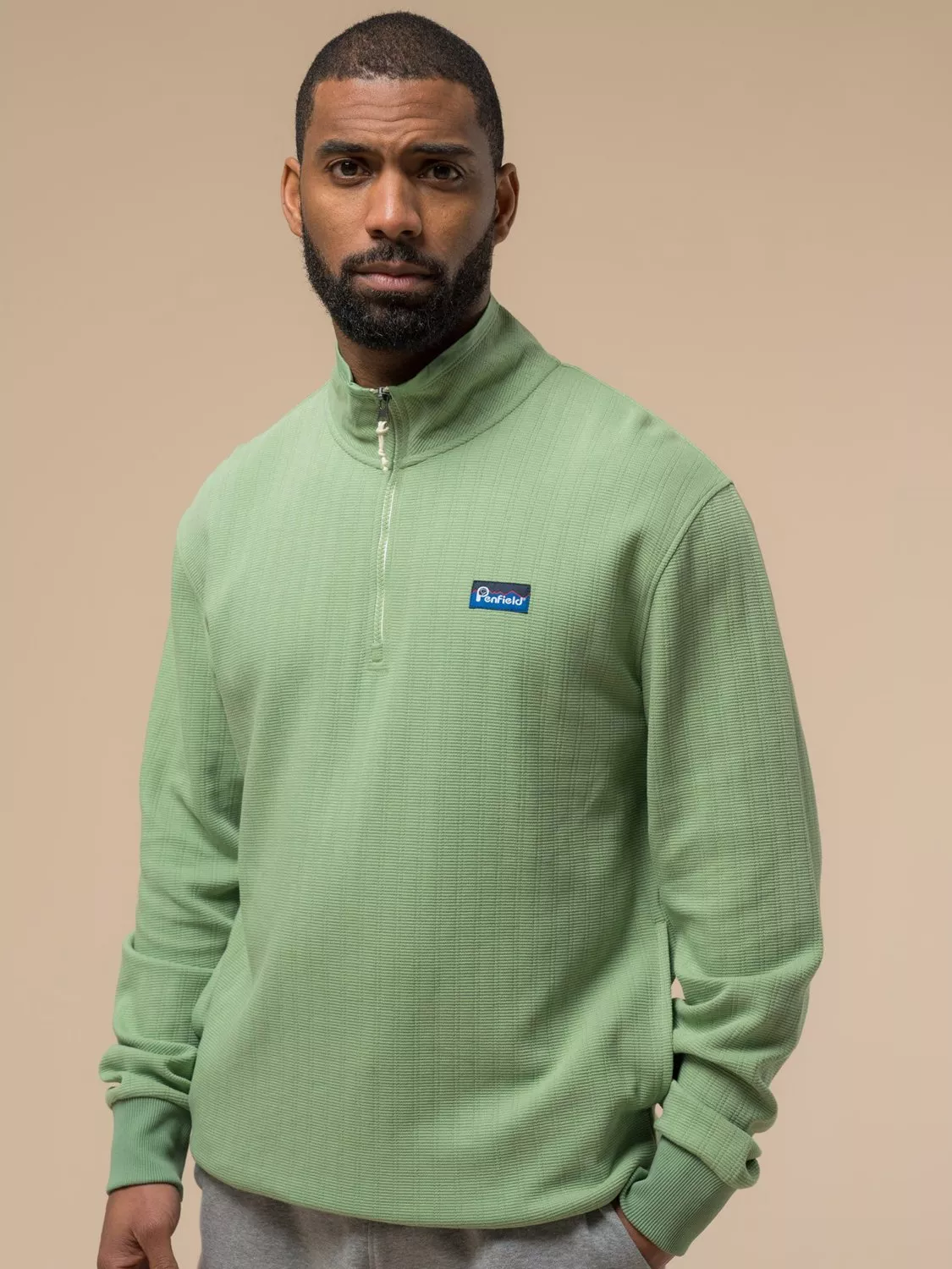 Designed for both comfort and style, the Textured Stripe Half Zip Funnel features a 100% cotton textured weave with a durable nylon Taslon funnel neck. Its half-zip closure provides versatile styling, while side seam pockets and ribbed trims ensure practicality and a secure fit. Finished with a distinctive vintage garment wash, this top is perfect for layering with chinos or dark denim.