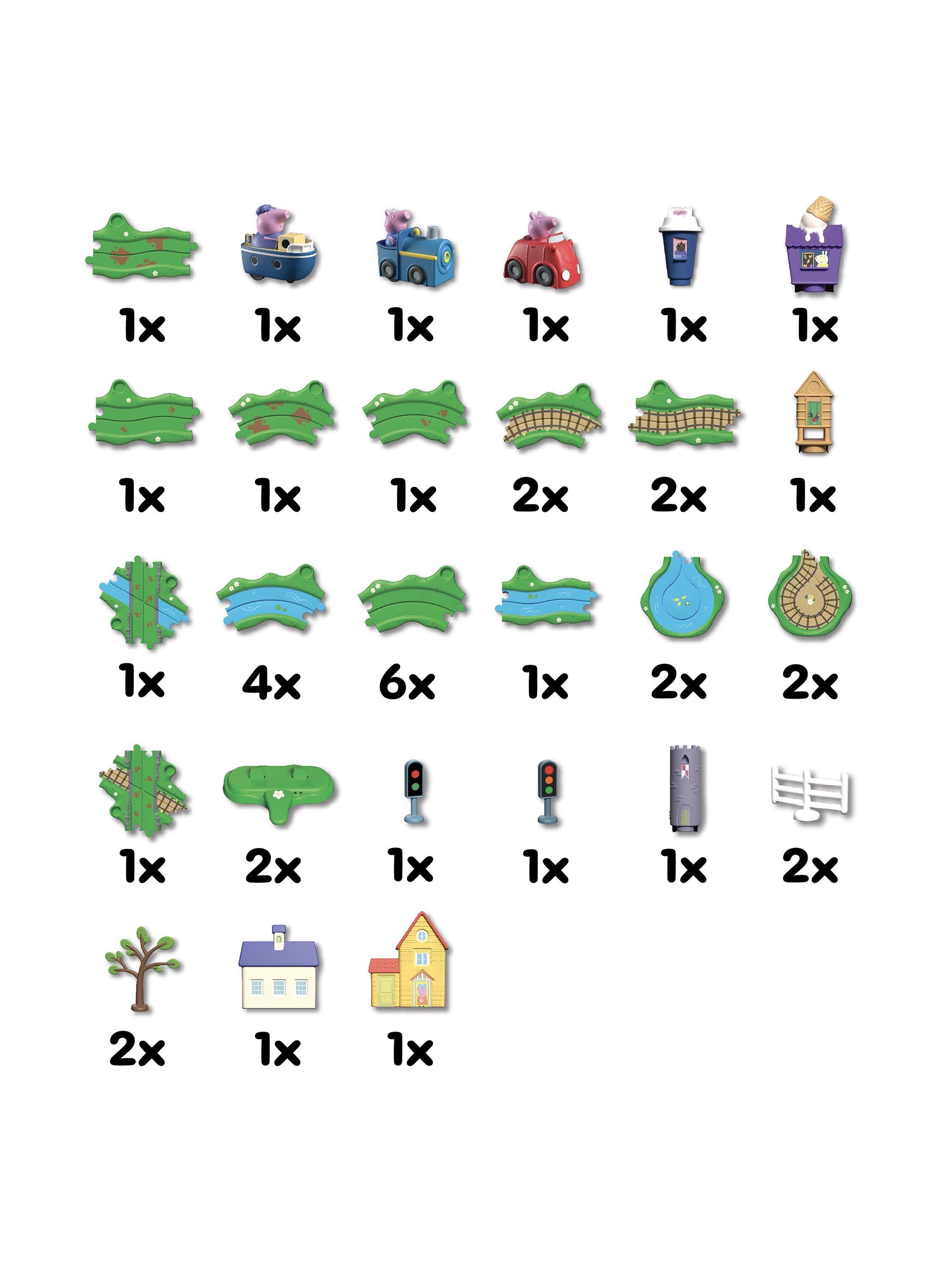 Peppa Pig Whizz-Around Peppa’s Great Big World Set features Peppa’s Red Car, George’s Little Blue Train, and Grandpa Pig’s Boat, along with road track, train track, river track, accessories, as well as Peppa’s House and Schoolhouse buildings, with motion activated sound effects! The track is connected using an easy jigsaw system which is perfect for small hands to put together. Customise the track with accessories. Put the vehicles on the track, press the top, and watch them go! As the car passes the house or school, you will hear tunes, phrases and sound effects!
