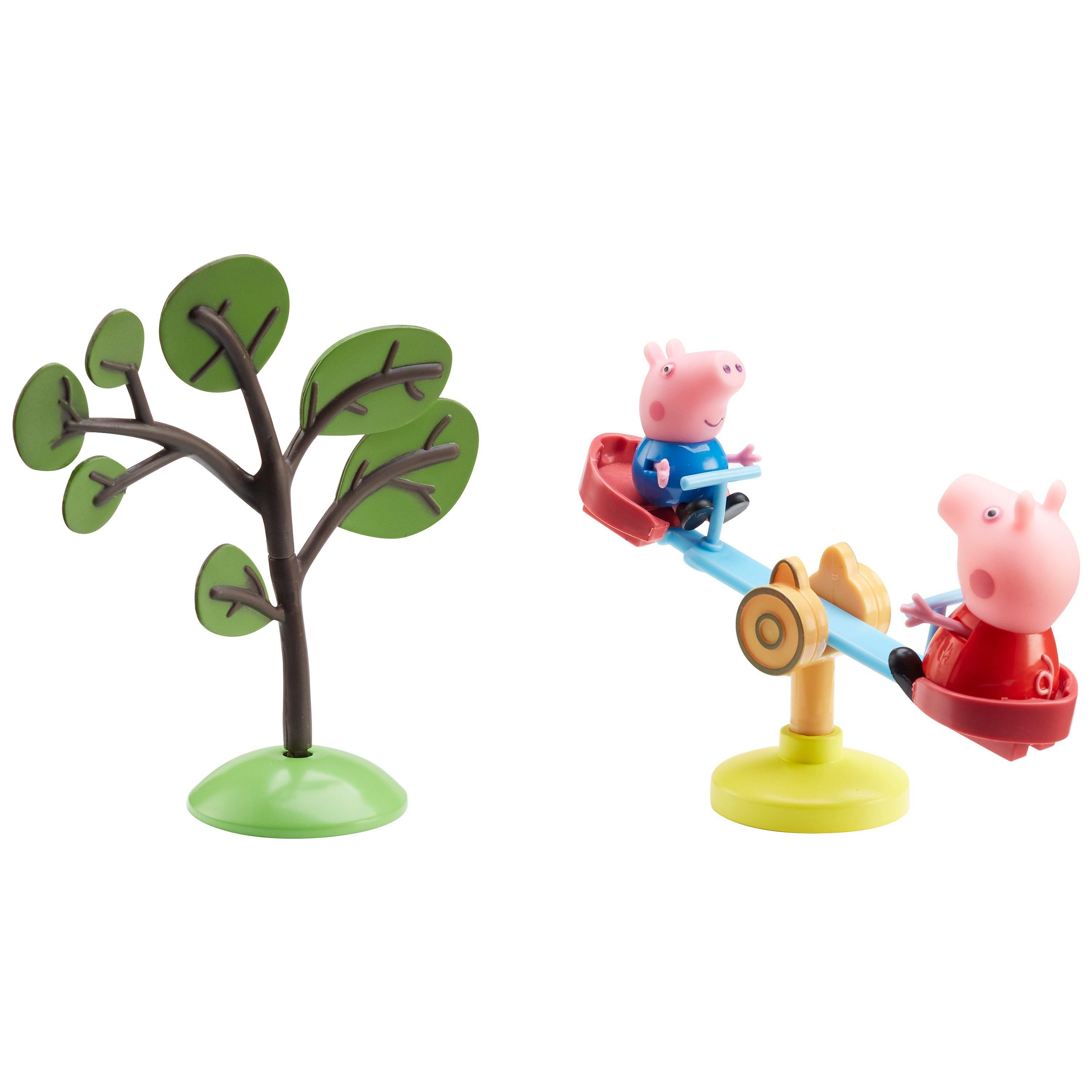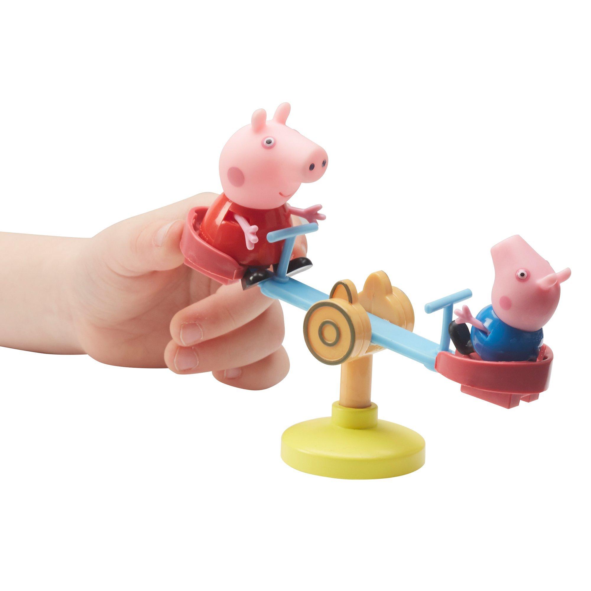 Peppa's house opens up and inside there are four rooms and plenty of furniture for her to enjoy. She can also play on the see-saw with George in the garden.