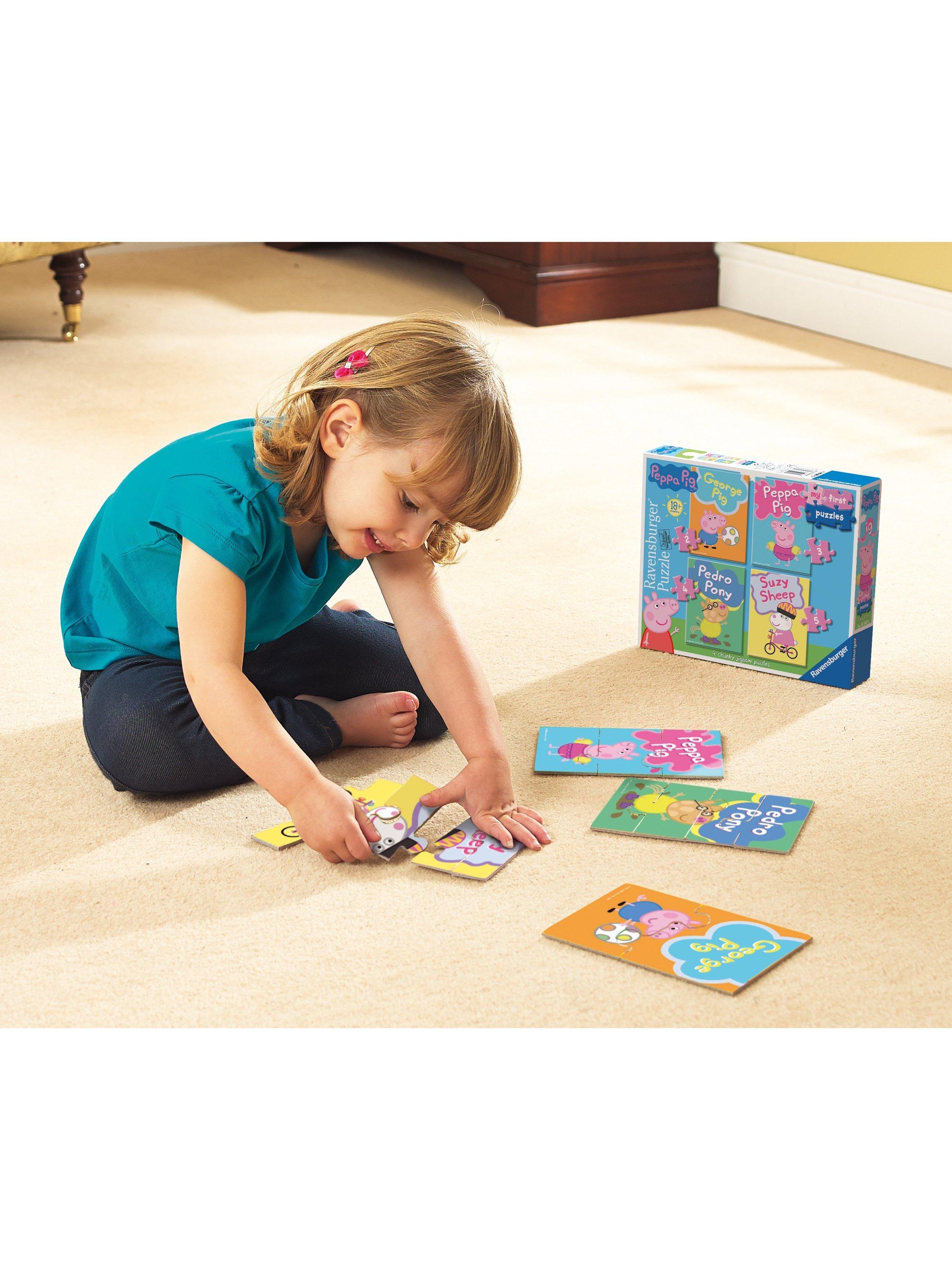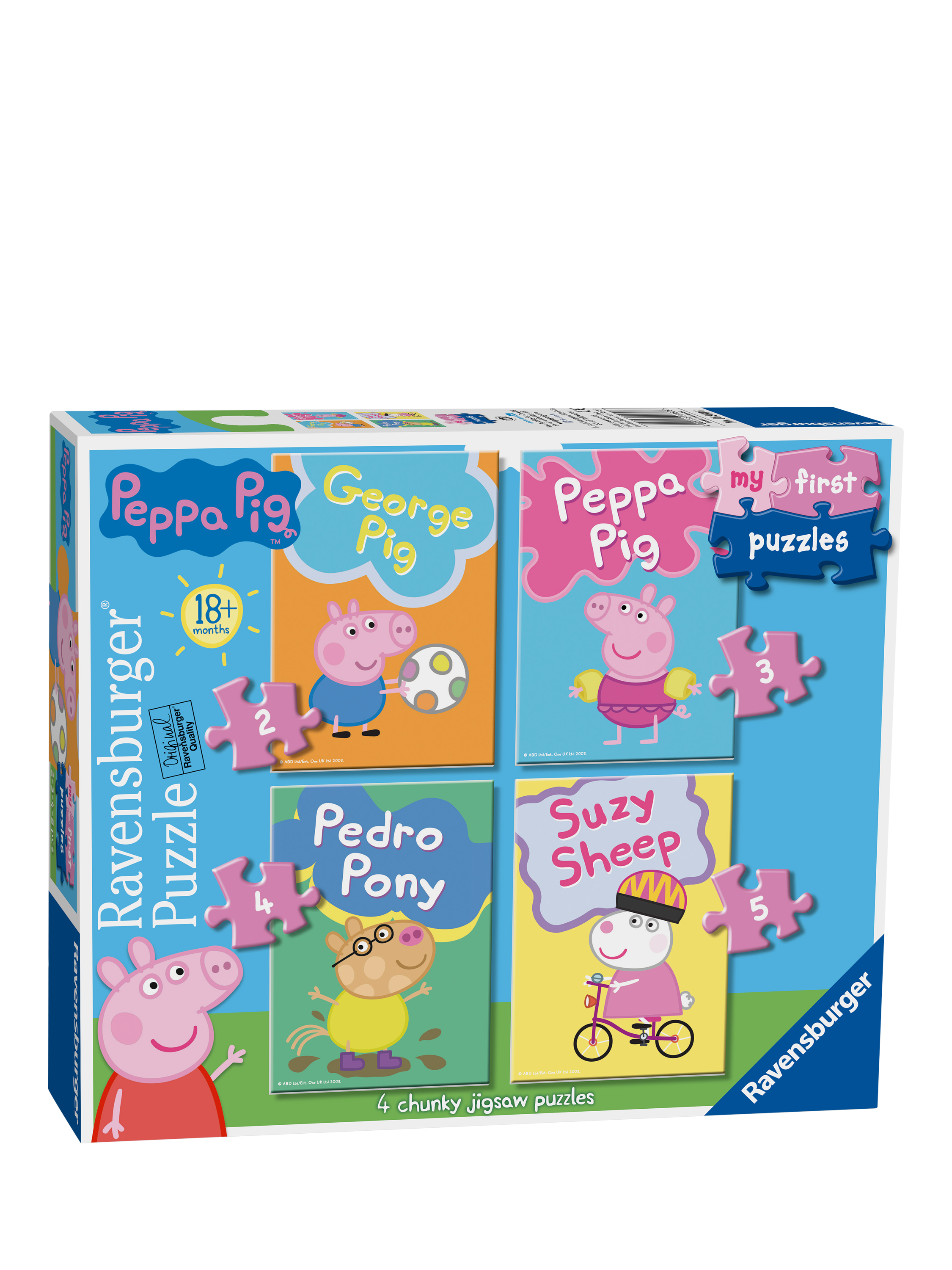 Four bright and colourful My First puzzles specially designed for children. Each puzzle shows the popular Peppa Pig characters, including Peppa Pig, George Pig, Pedro Pony and Suzy Sheep. The 2 piece shows George Pig playing football, the 3 piece shows Peppa Pig about to go swimming, the 4 piece shows Pedro Pony splashing in a muddy puddle and the 5 piece shows Suzy Sheep riding her bike.