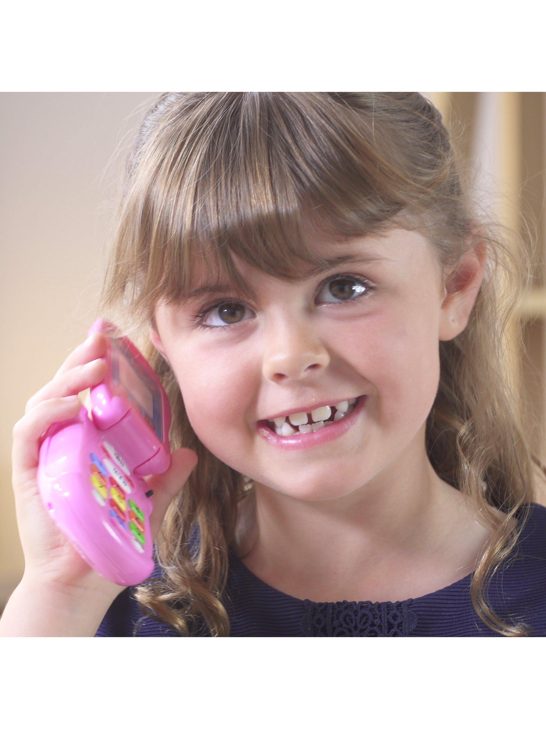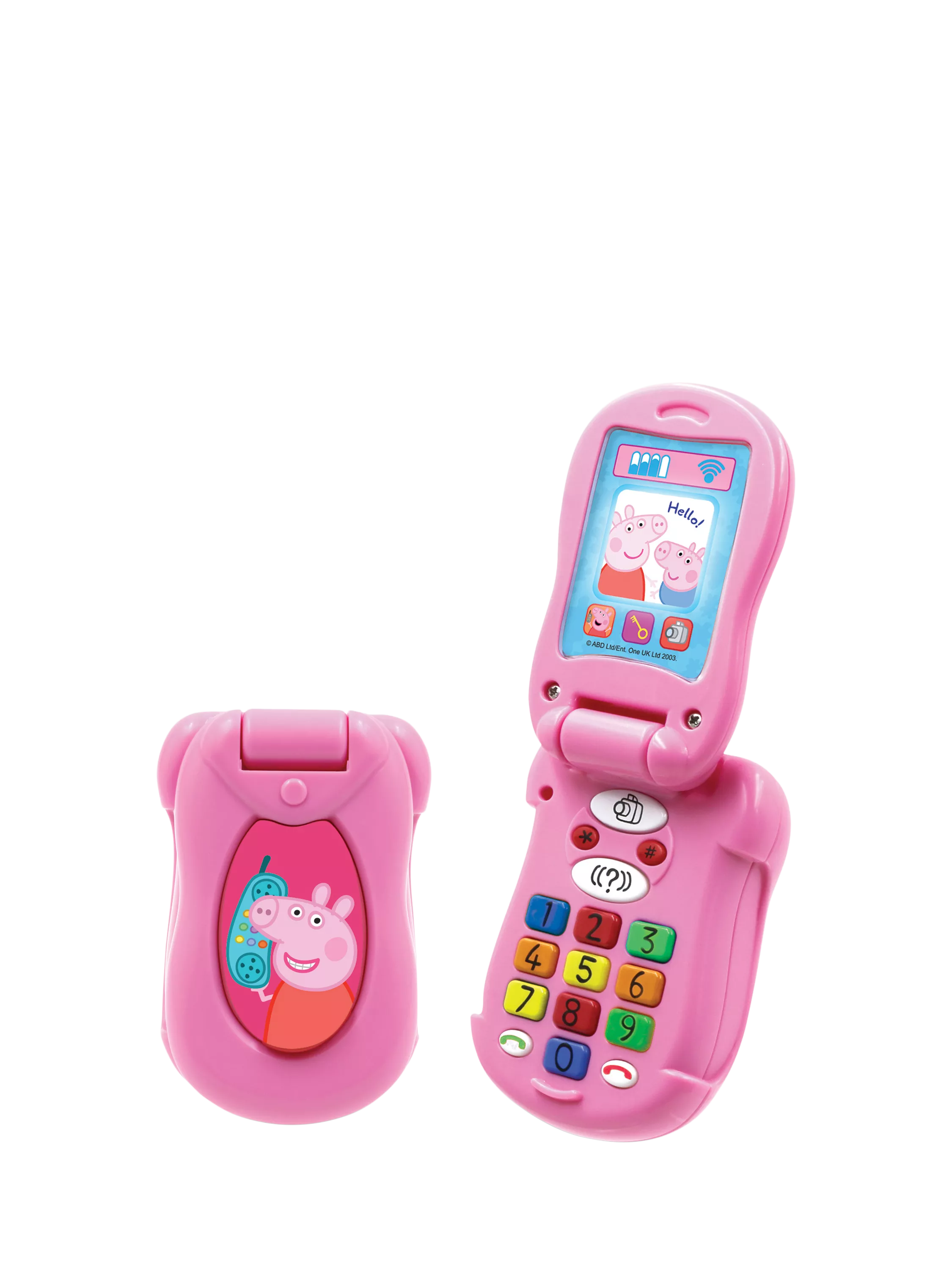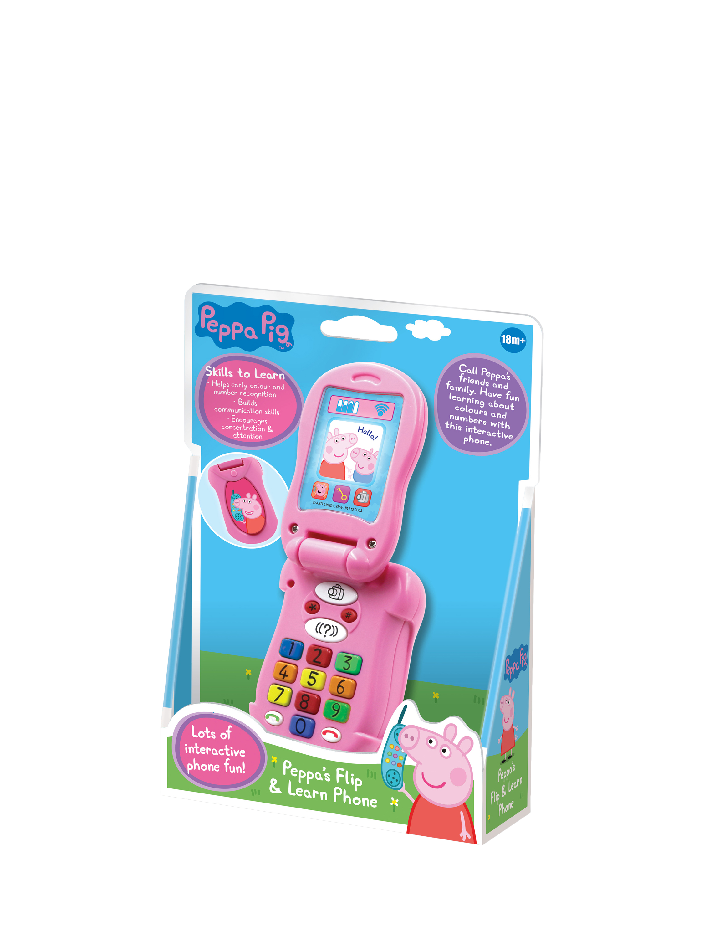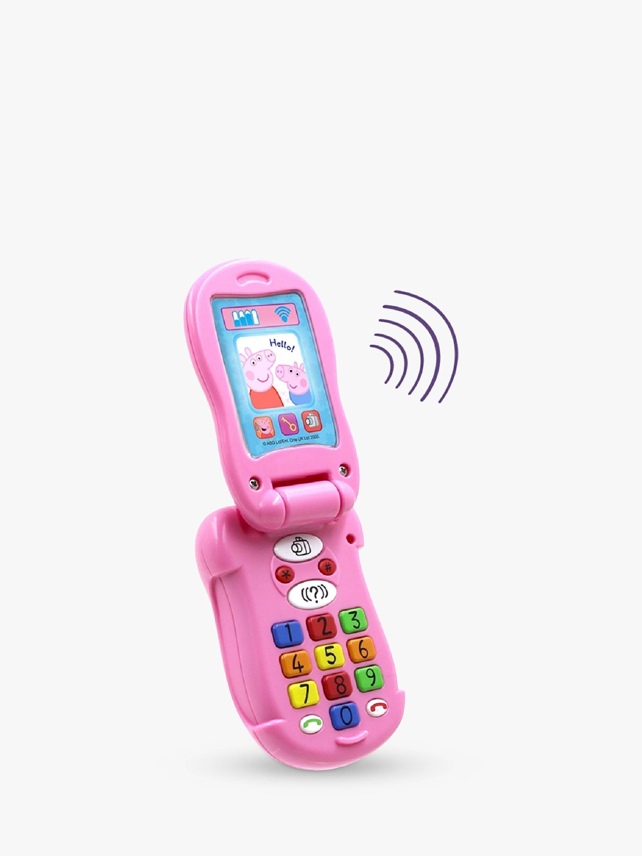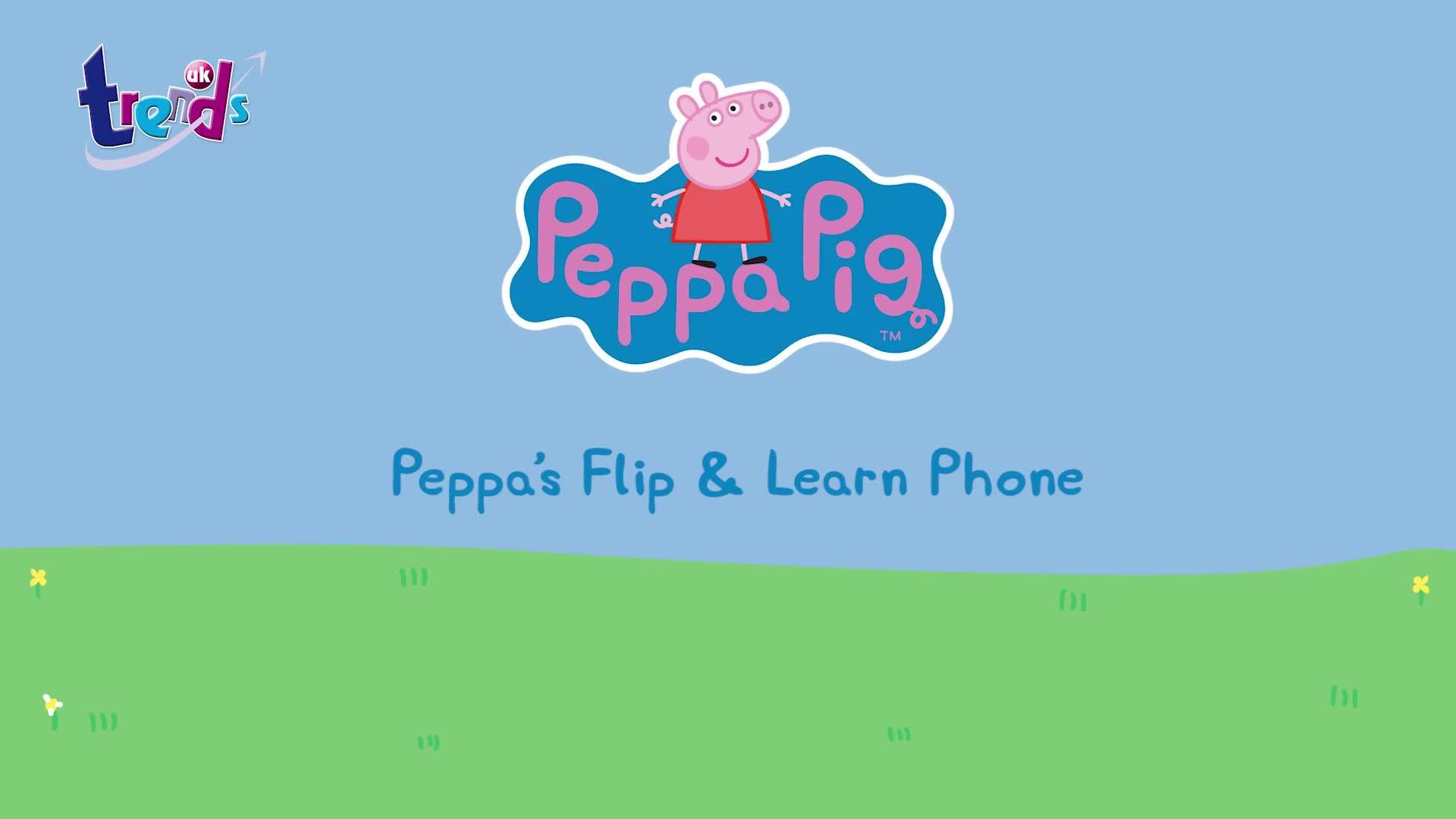 Make and receive calls with Peppa's Flip & Learn phone. Dial the multi-coloured buttons to listen to Peppa and other favourite characters from the popular TV series respond, including Rebecca Rabbit, Suzy Sheep and Candy Cat. Play along with Peppa's fun quiz and use the number keys to answer. You can even pretend to take photos with the camera button. Also features fun sound effects and the Peppa theme tune.