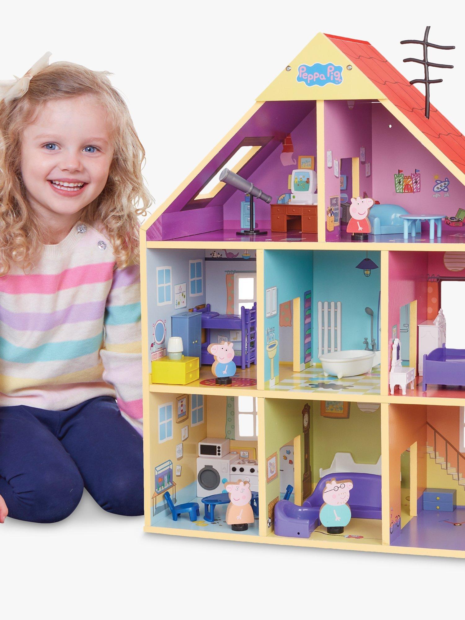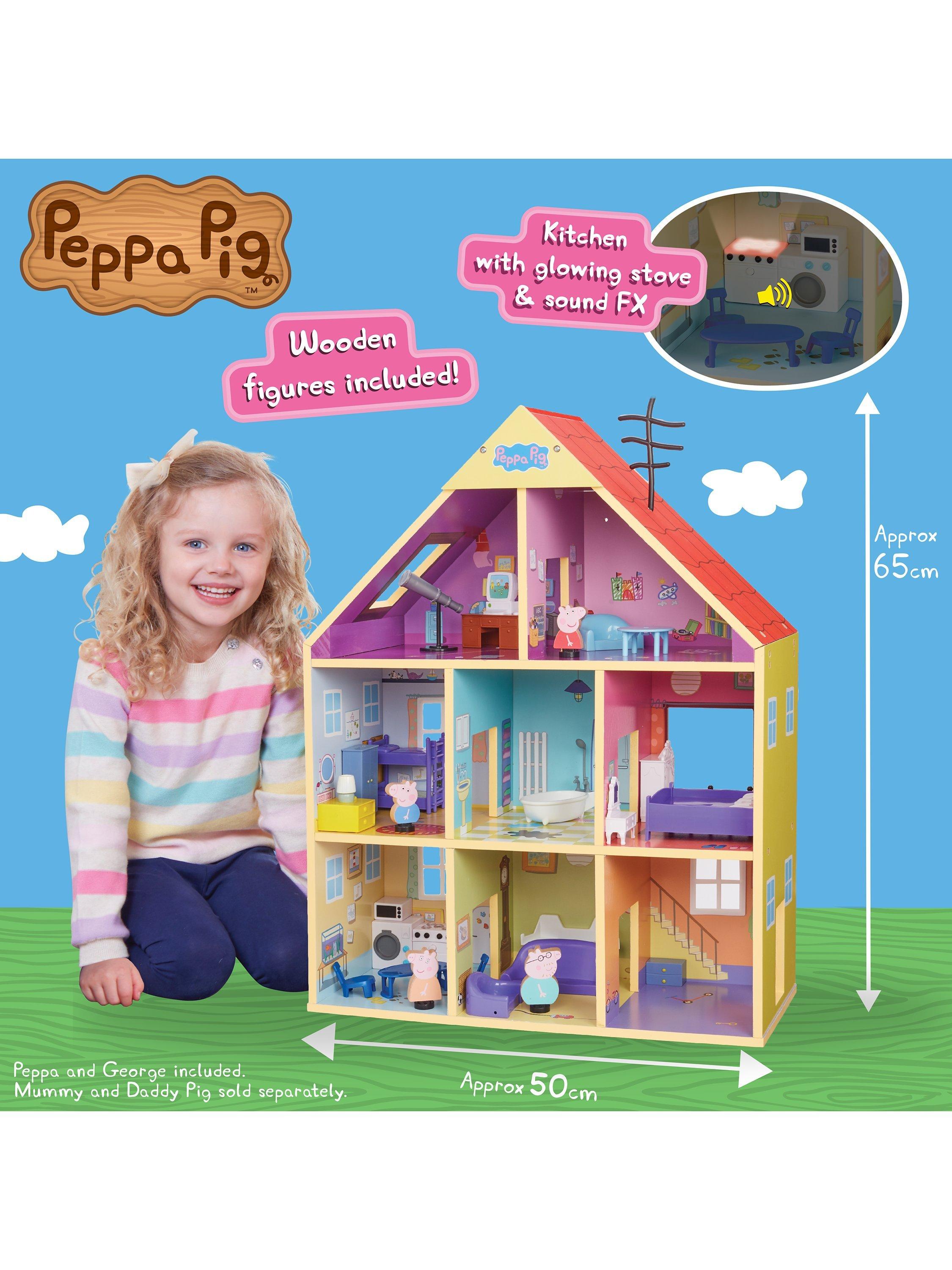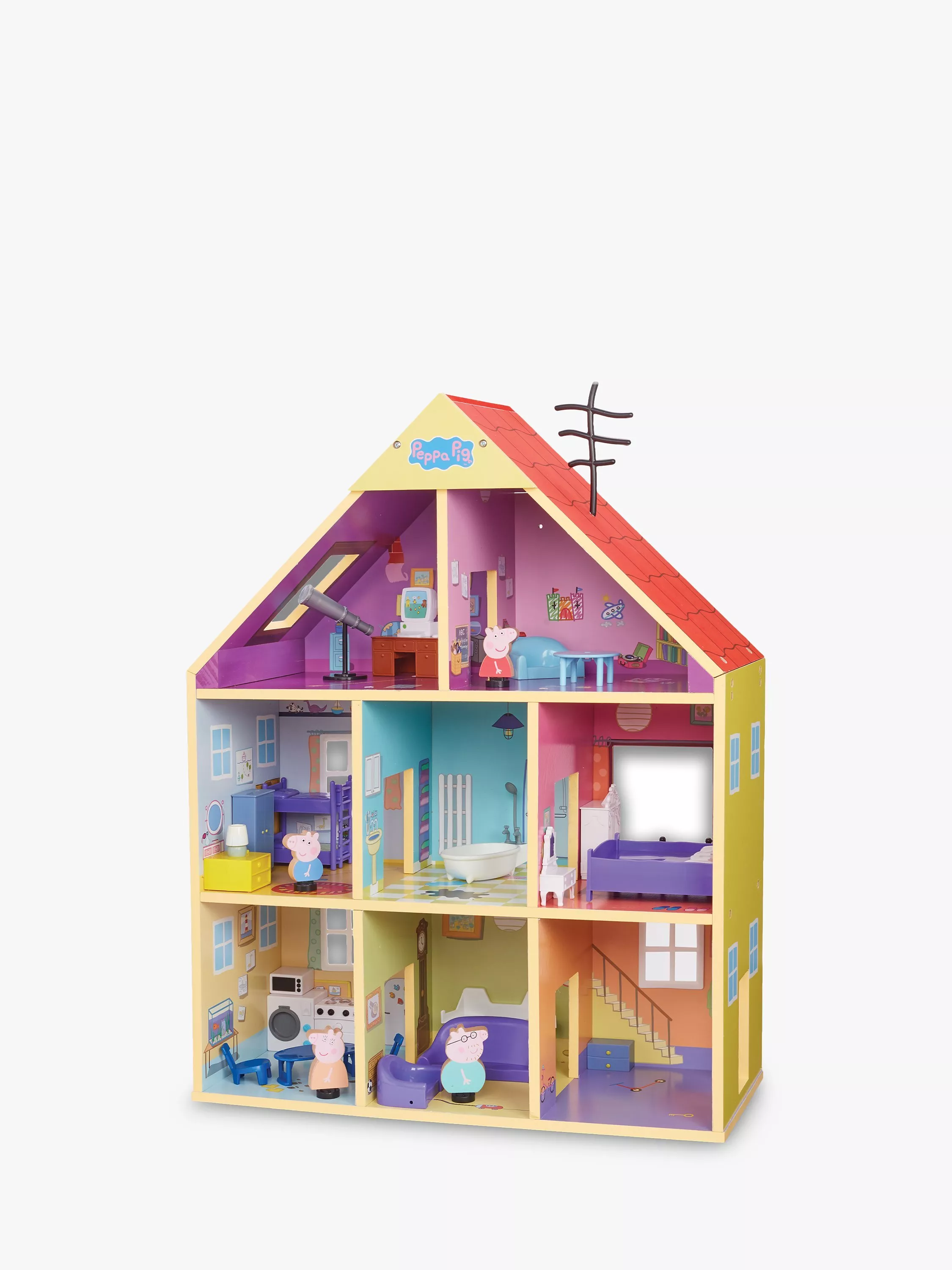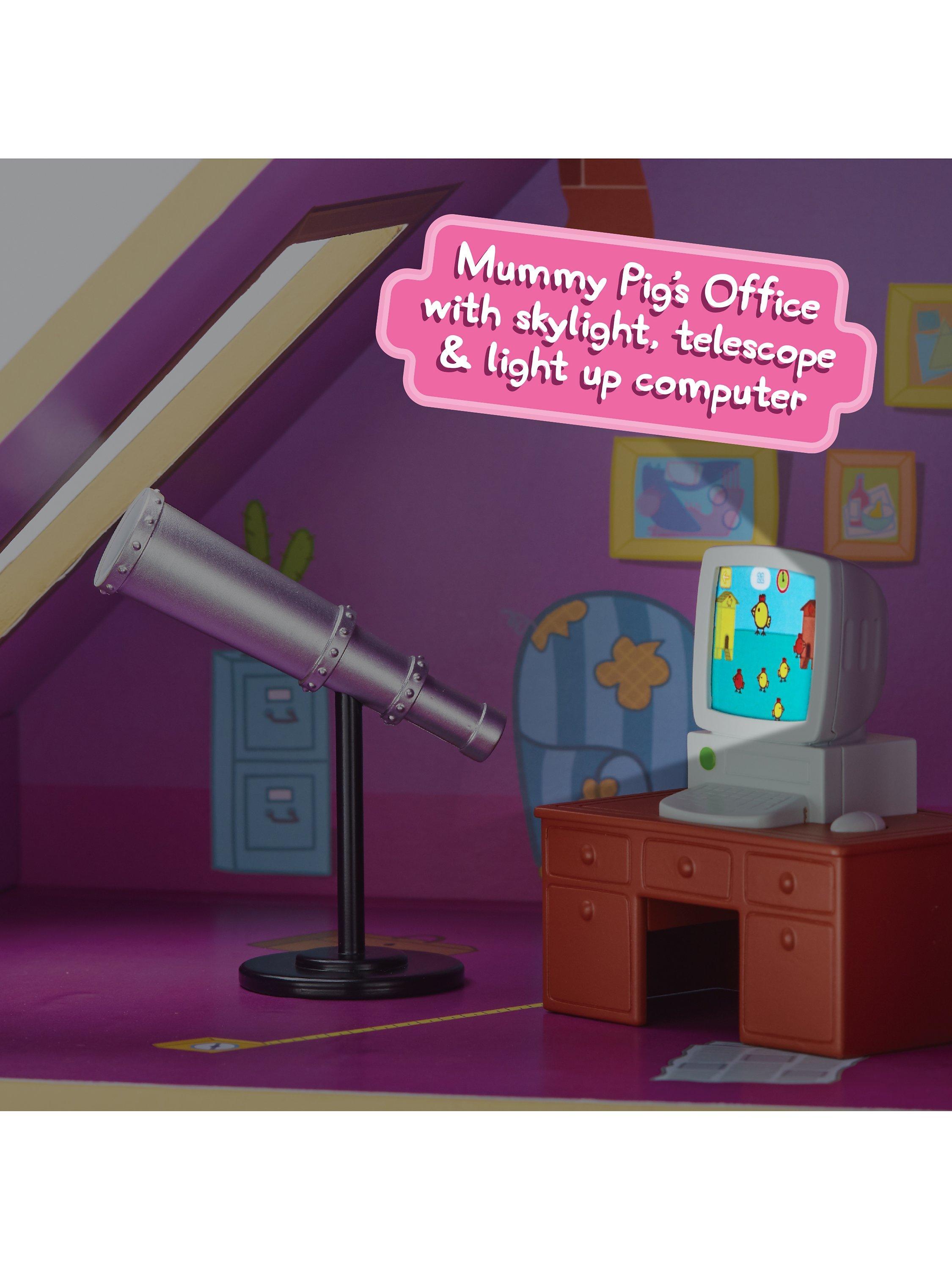 This wooden playhouse is ideal for all Peppa Pig fans who want to recreate popular scenes! The house comes with additional effects such as Mummy Pig's office with skylight, telescope and light up toy computer! House includes eight rooms.