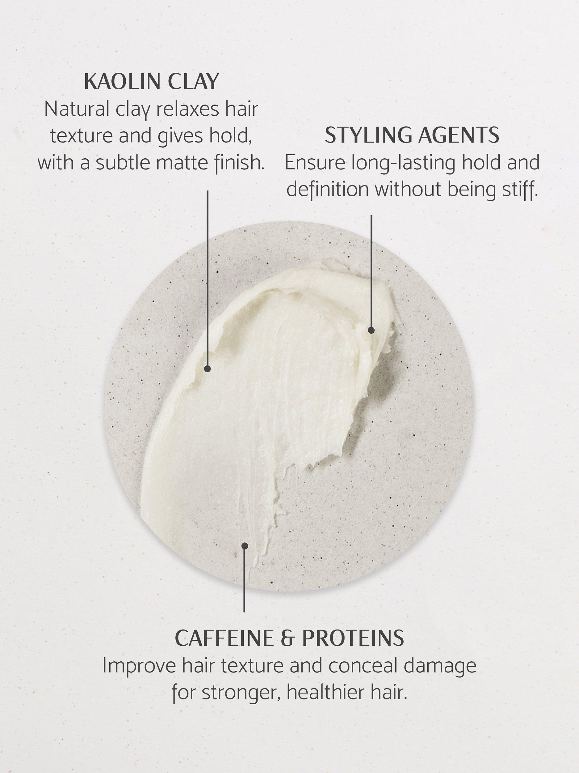 Kaolin Clay, a lightweight, all-natural clay, works to relax hair texture for soft and manageable locks, with a subtle matte finish. Expert styling agents help to retain the shape of your style throughout the day, ensuring long-lasting hold and definition. Enriched with caffeine and proteins, this multi-tasking hair wax also helps to protect the hair, for strands that feel stronger and healthier.