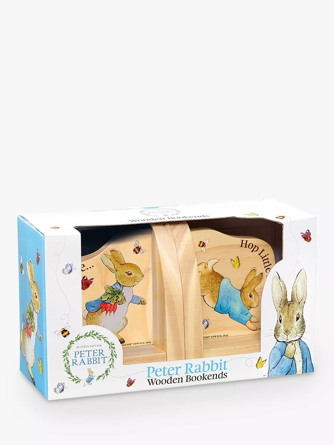 One bookend features Peter collecting carrots surrounded by butterflies and bees, with the quote "Once Upon a Time". The other features a hopping Peter with the message "Hop Little Rabbit Hop!"