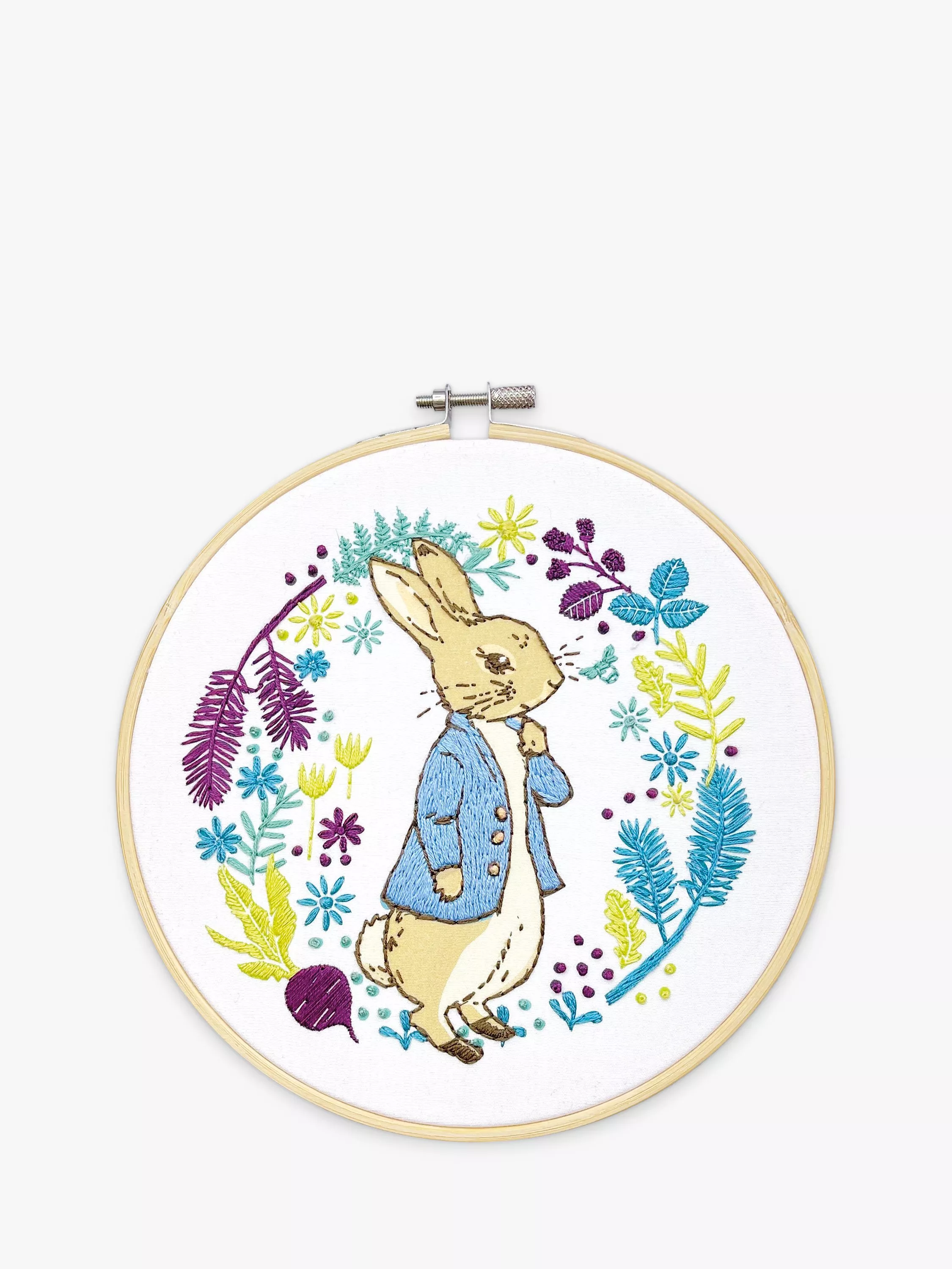 He fills the centre of the hoop and is surrounded by a glorious wreath of blue, teal, green and purple flowers and leaves. Aimed at beginners, you'll find great joy creating this embroidery kit designed under license from BEATRIX POTTER™ ©.