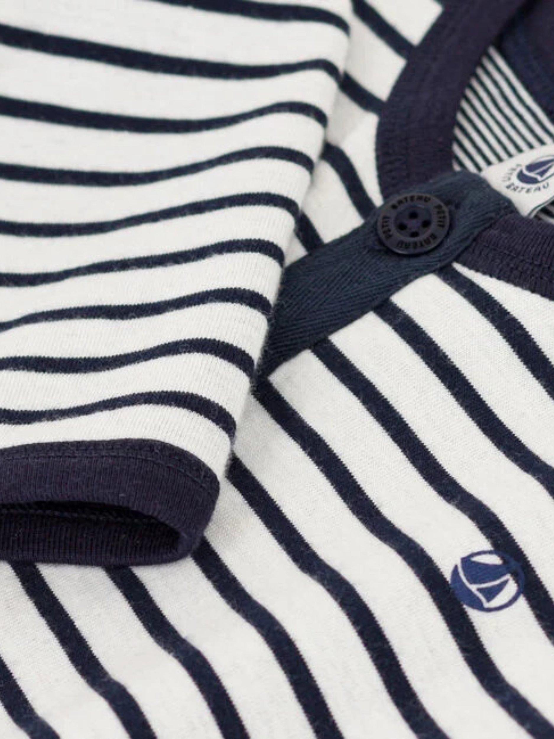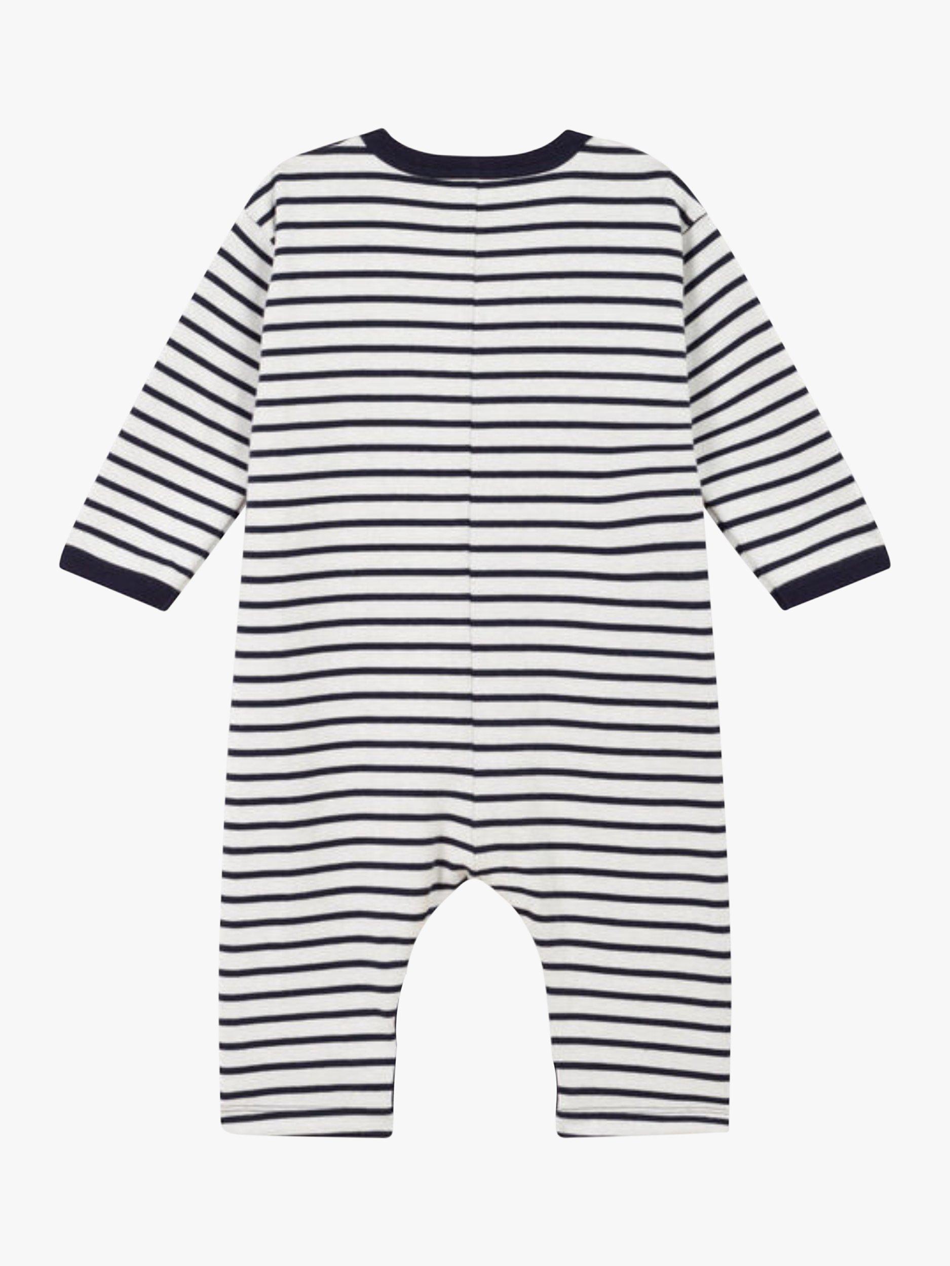A soft thick jersey jumpsuit that's soft and comfy for baby to wear. Featuring Petit Bateau's iconic sailor stripes, it has a button placket on the front for a modern look. Plus, there's poppers on the crotch - handy when getting baby dressed.