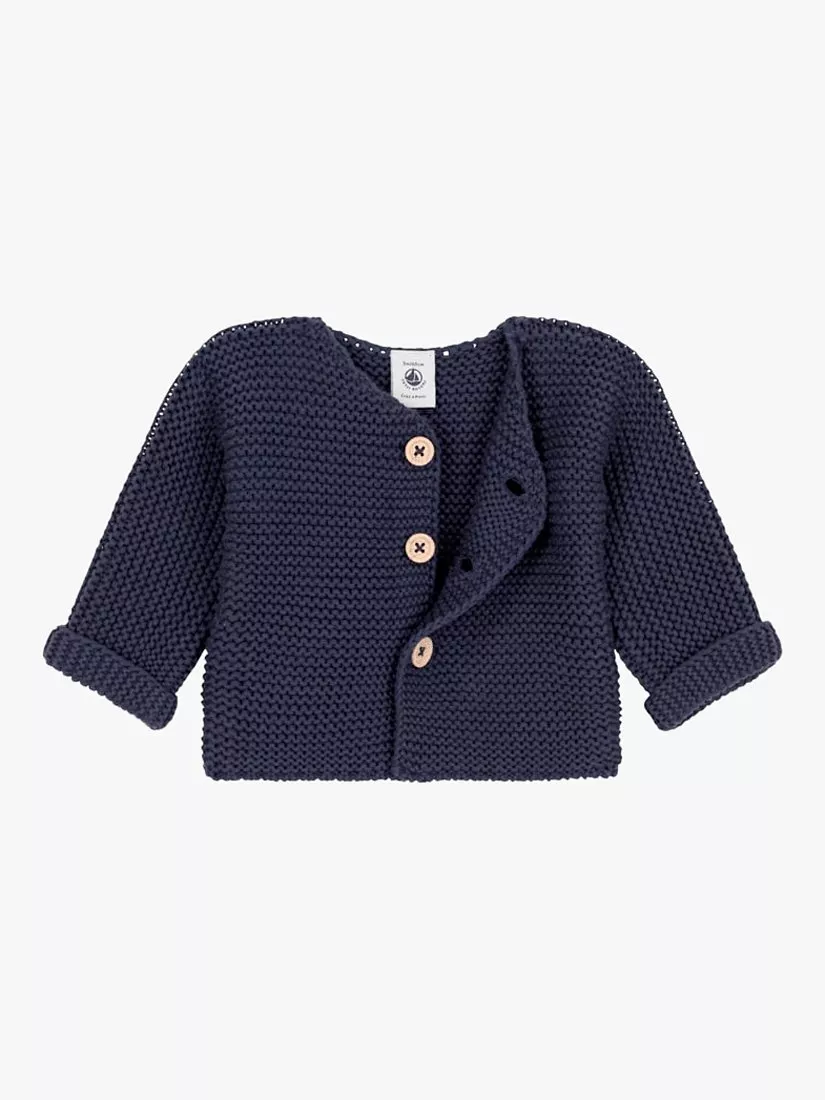 An organic cotton knit cardigan, with buttons to make dressing easy.