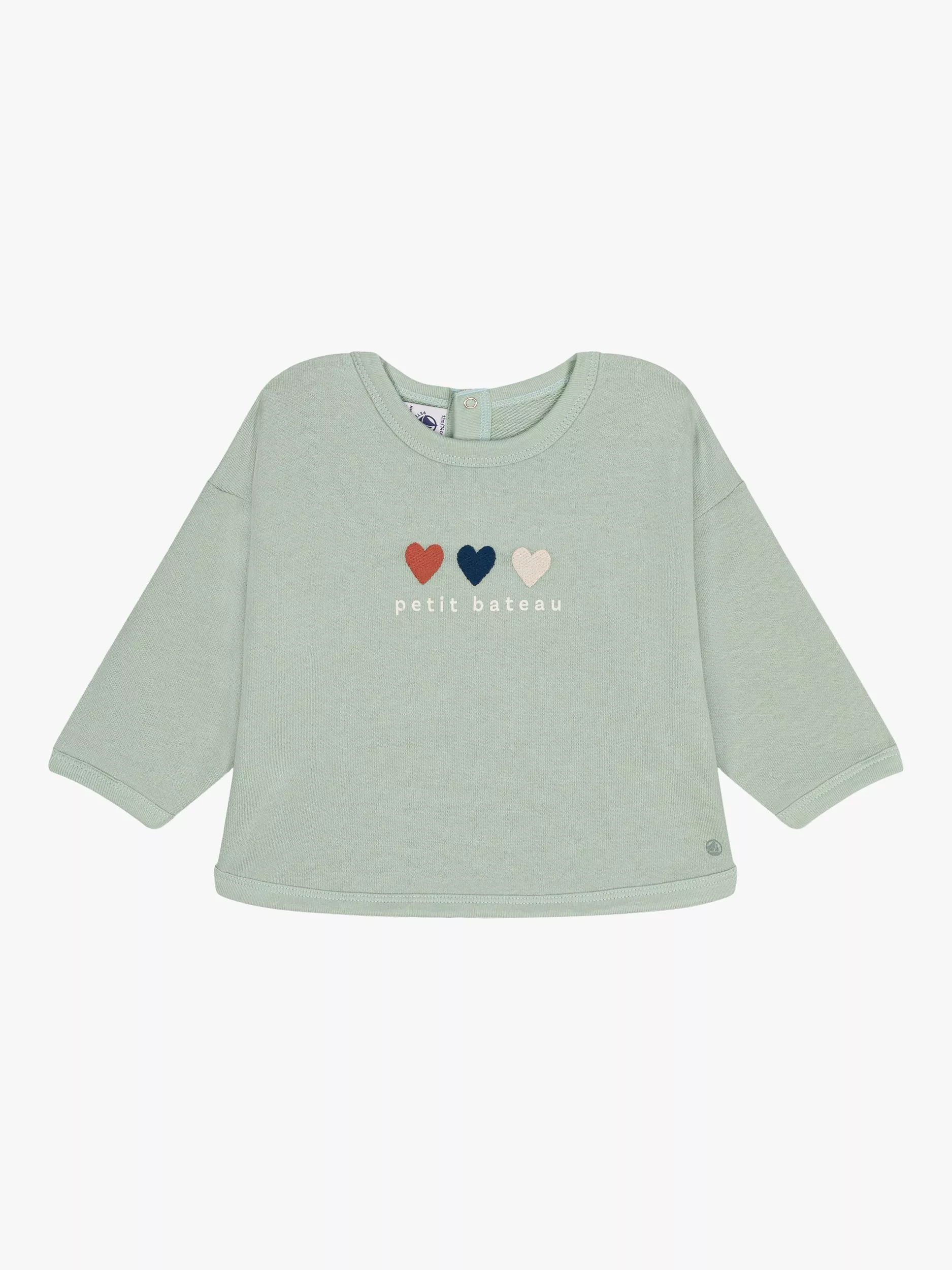 This cute unisex sweatshirt made of fleece, is soft and warming for maximum comfort. Featuring three pretty embroidered hearts for the Petit Bateau big family! The poppers on the back are really handy when you're getting your baby dressed.