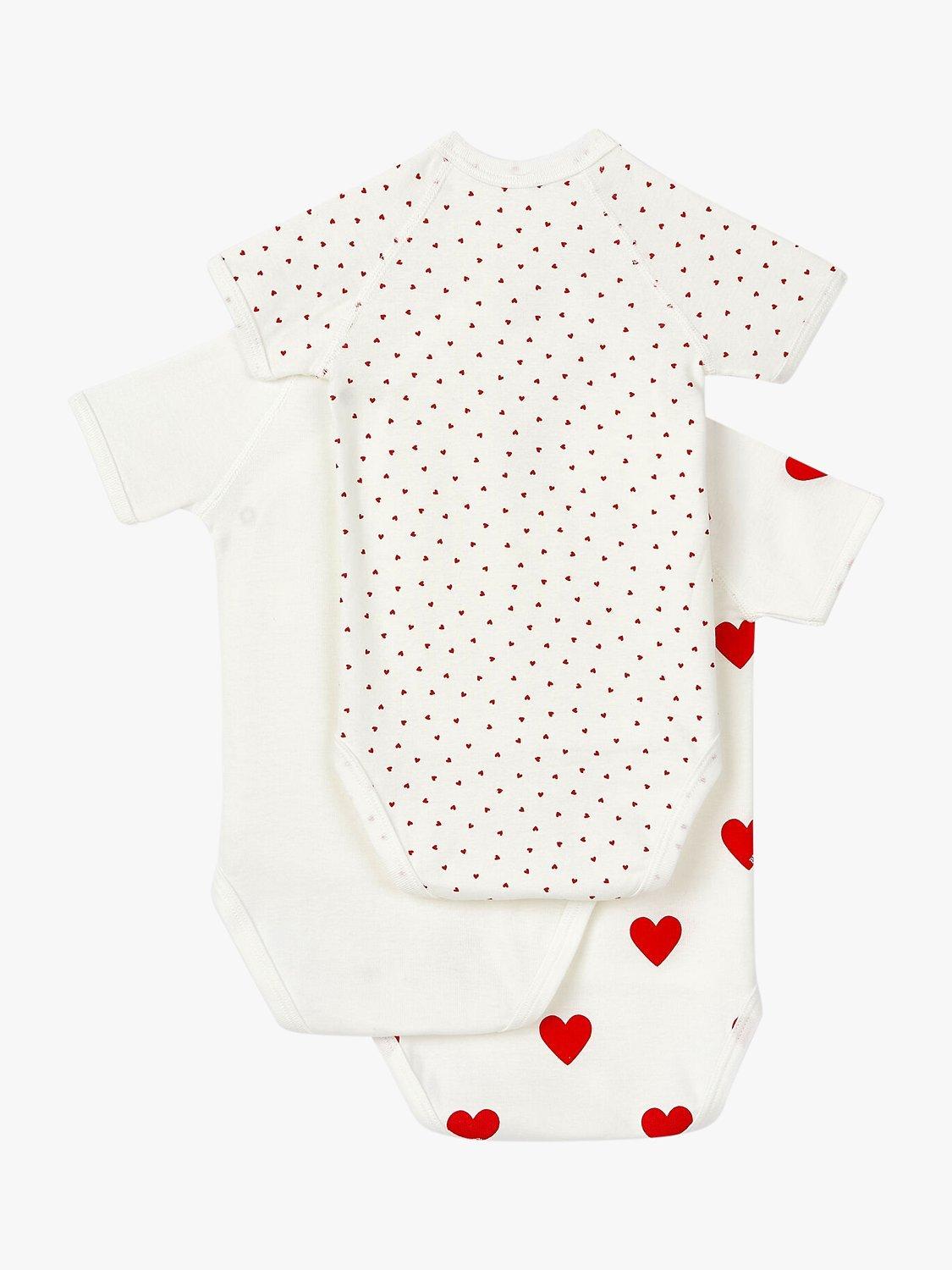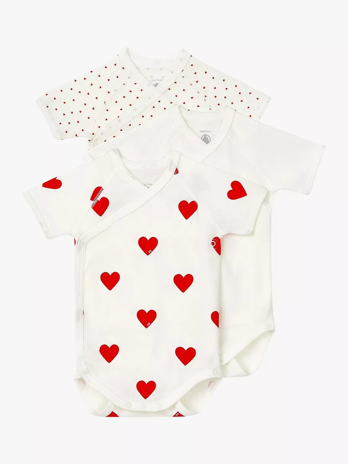 This pack of three short sleeved rompers are designed in a wrap style, fastened with poppers on the front and crotch. Made from skin kind organic cotton.