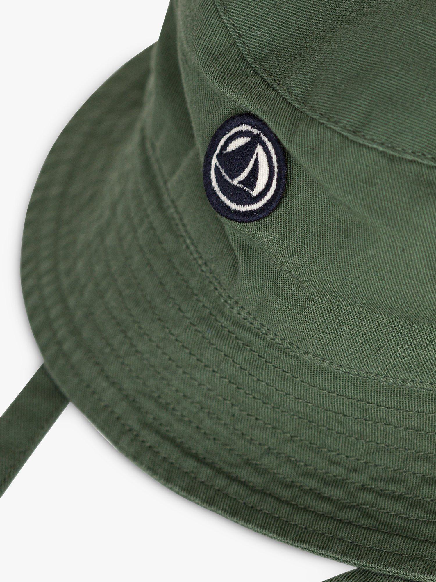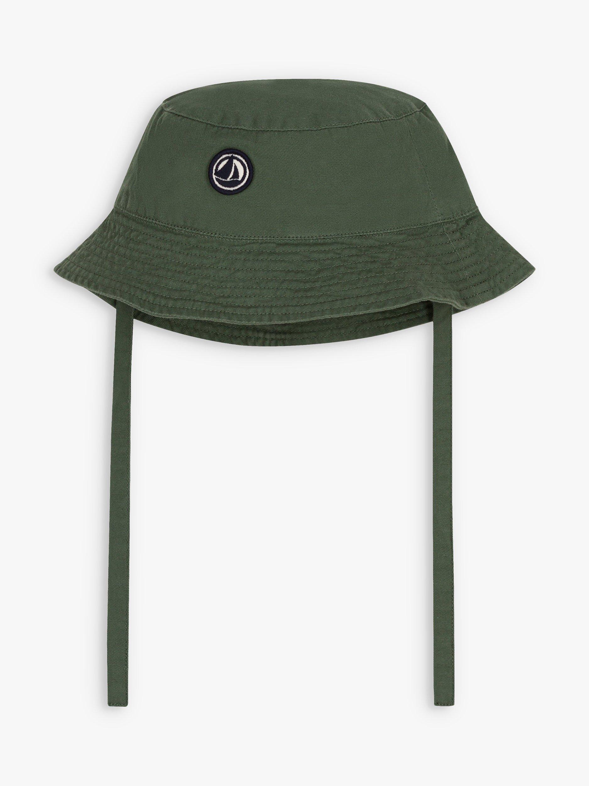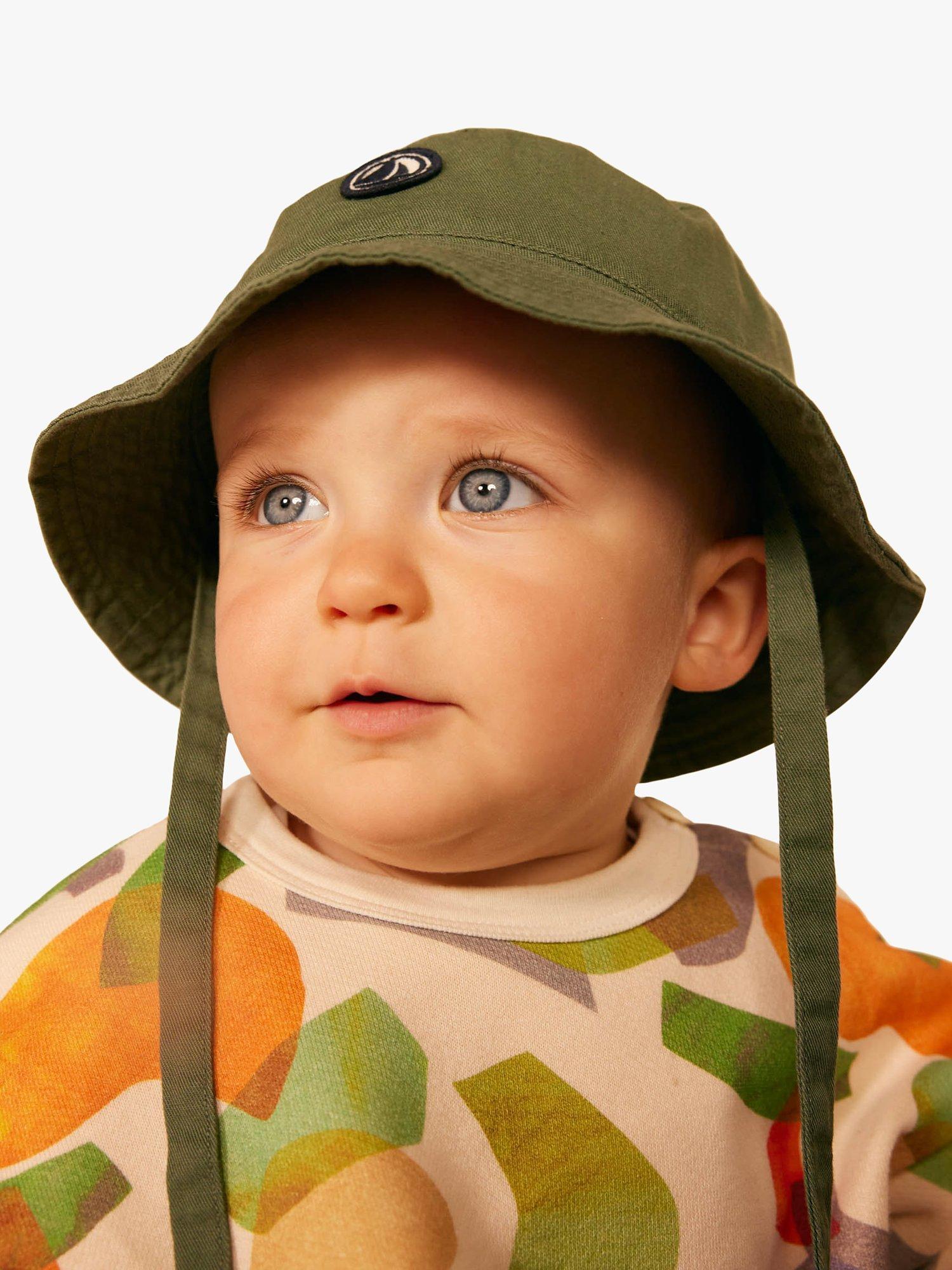 This bucket hut secures with chin ties so it stays safely on baby's head. Finished with a branded embroidered badge on the front.