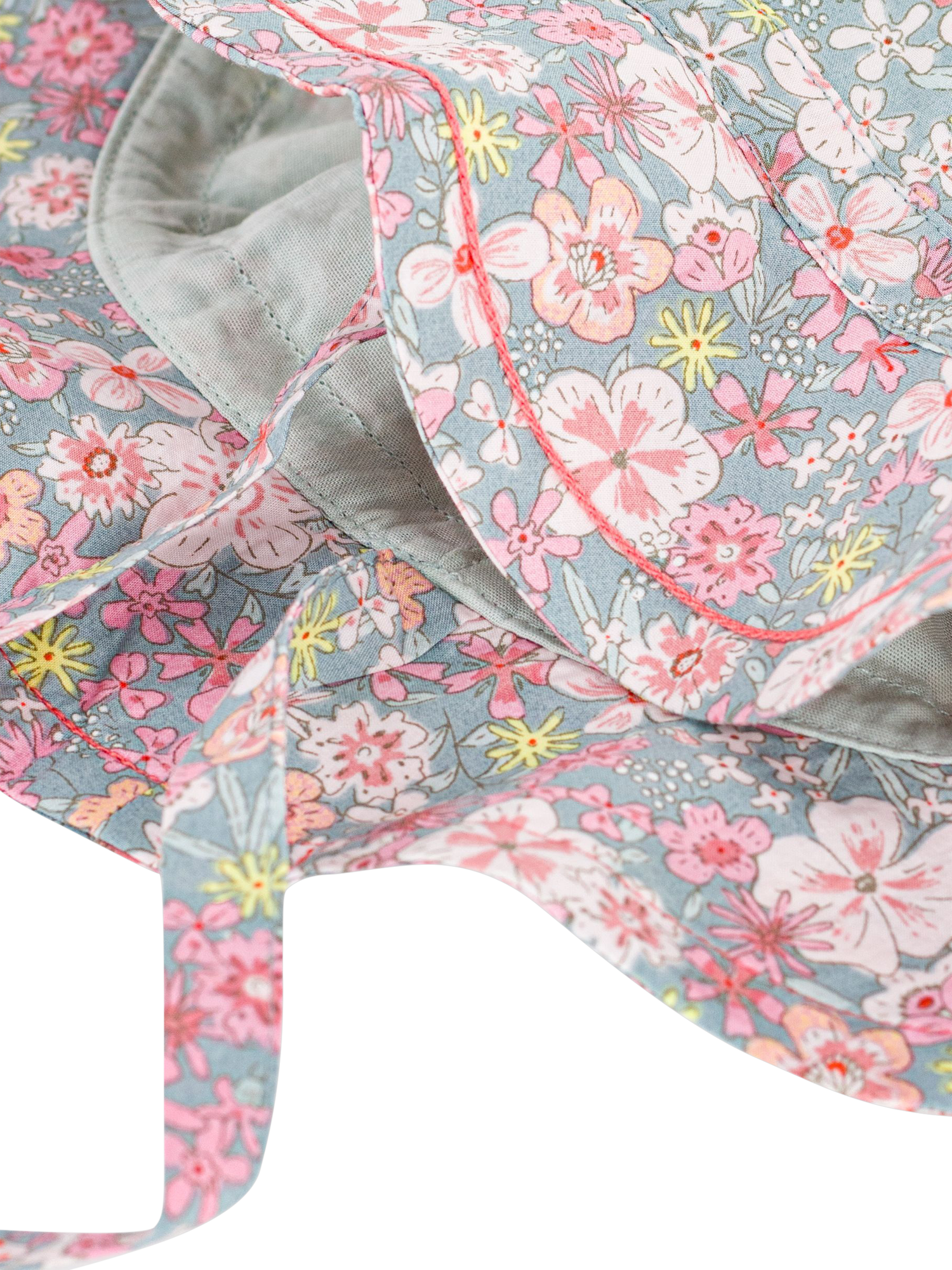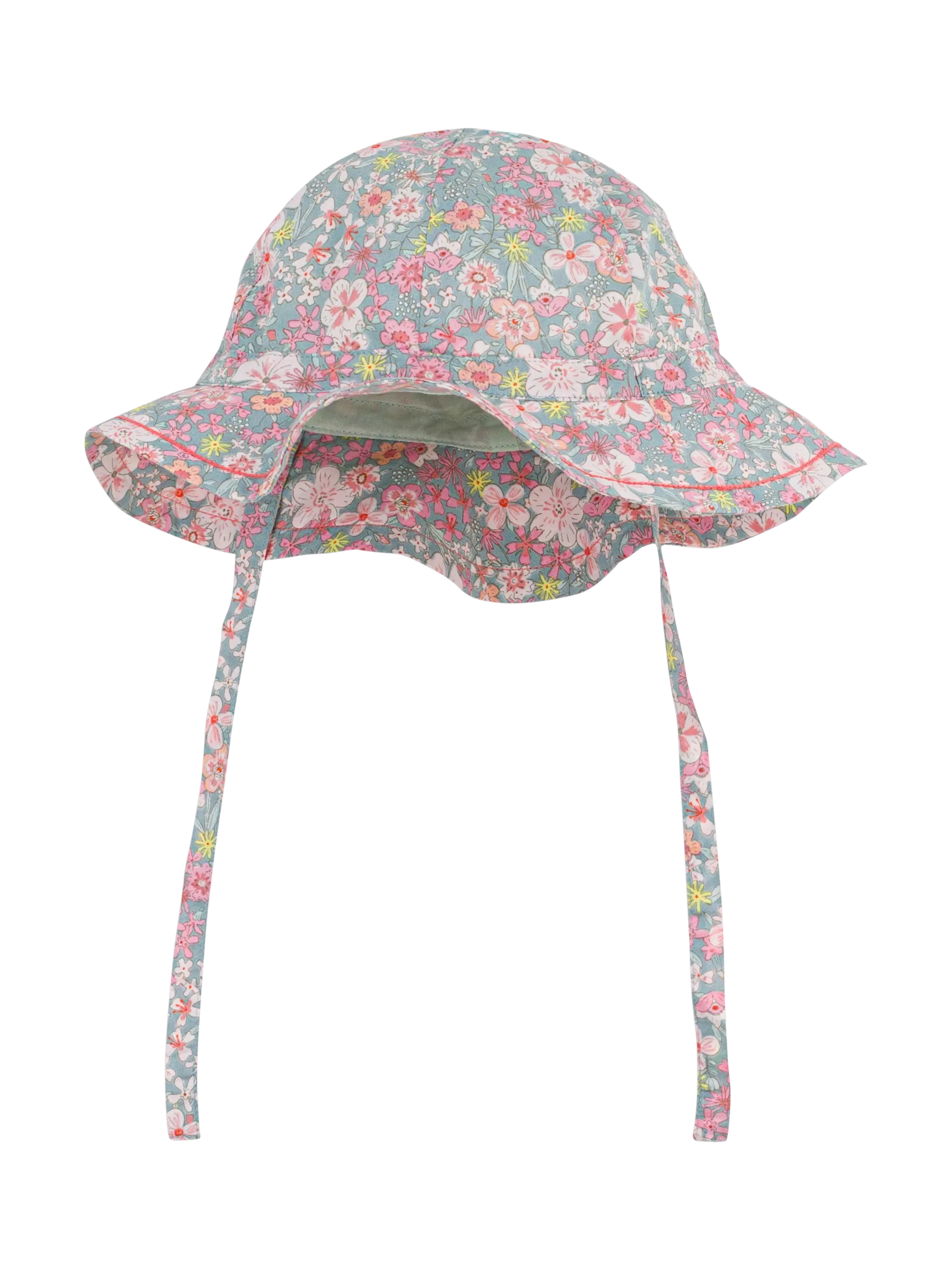 Airy brim protects delicate skin, scalloped silhouette and secure ties ensure a snug playful fit for sunny days of exploration.