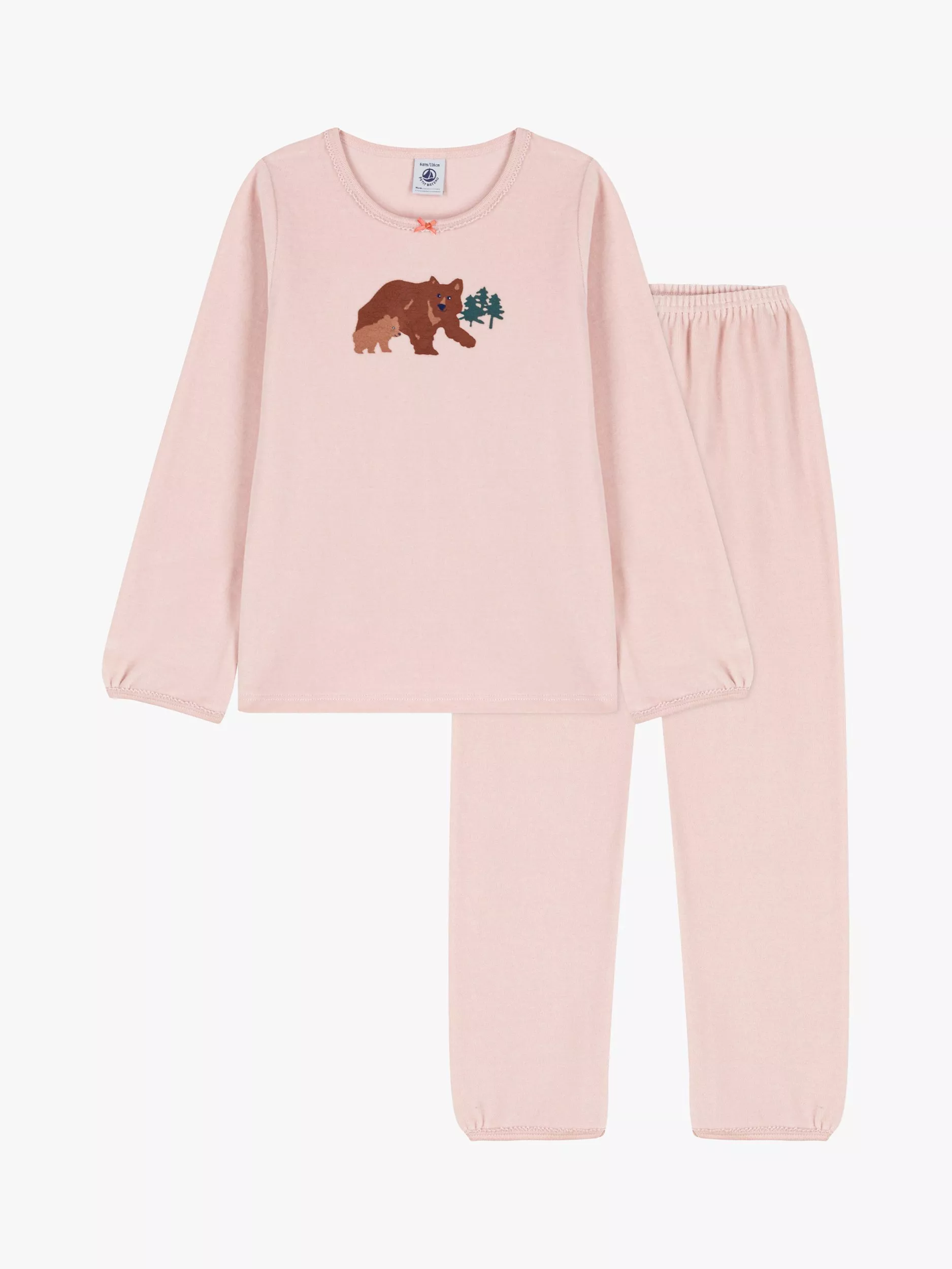 These comfy and warm velour pyjamas feature a small bow and picot edging on the neckline. There are little gathers and picot edging on the cuffs and ankles, and a bear design on the pyjama top.