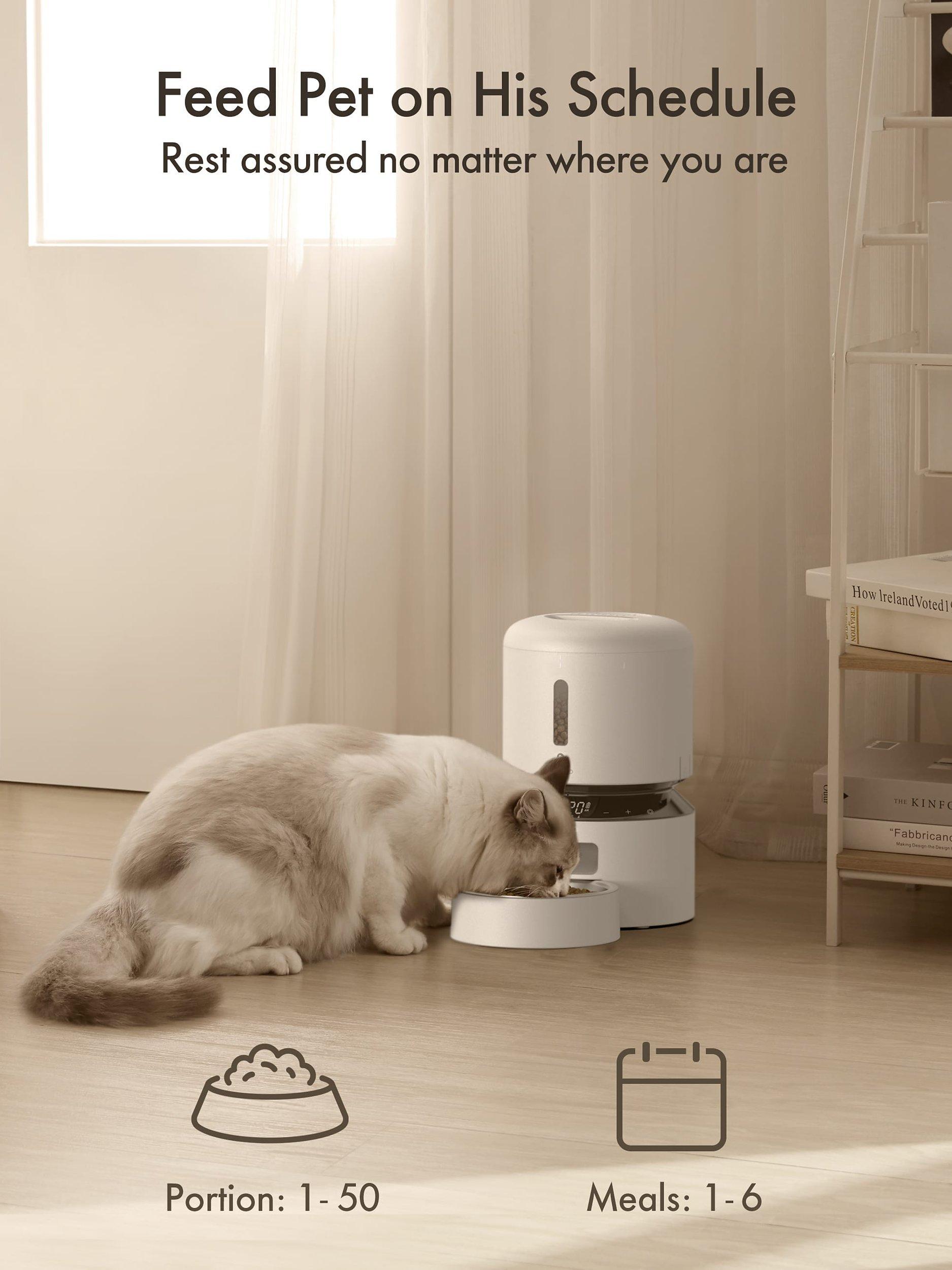 This auto cat feeder can record a 10-second voice to call your cat for food, the recording can be replayed up to 5 times during each feeding call. PETLIBRO Automatic cat feeder has a transparent viewing window allows you to easily monitor the food level and refill in time. Easy monitoring of feeding schedules, and battery levels. Gently tilted design for easy reading while you program this cat food dispenser.