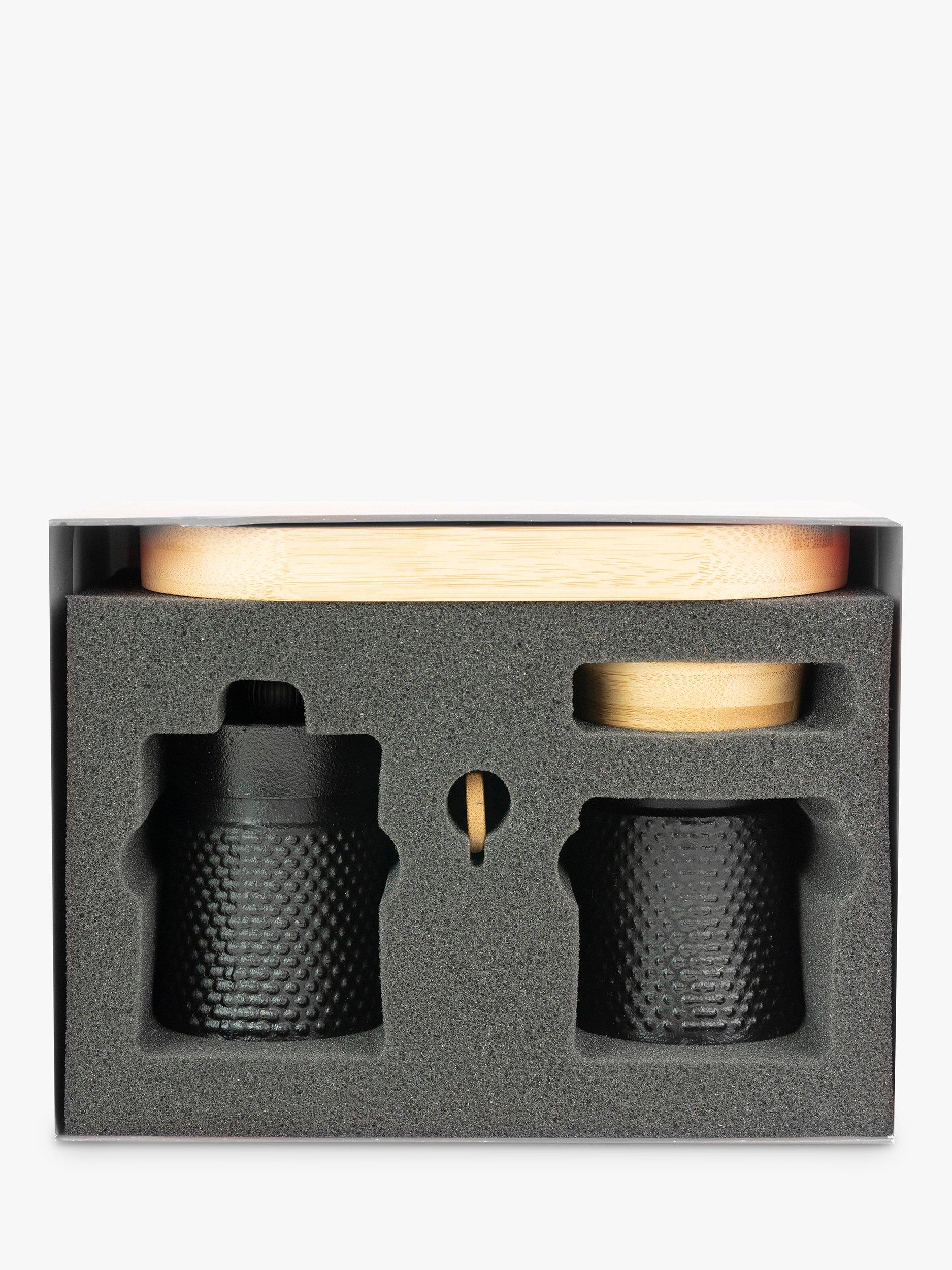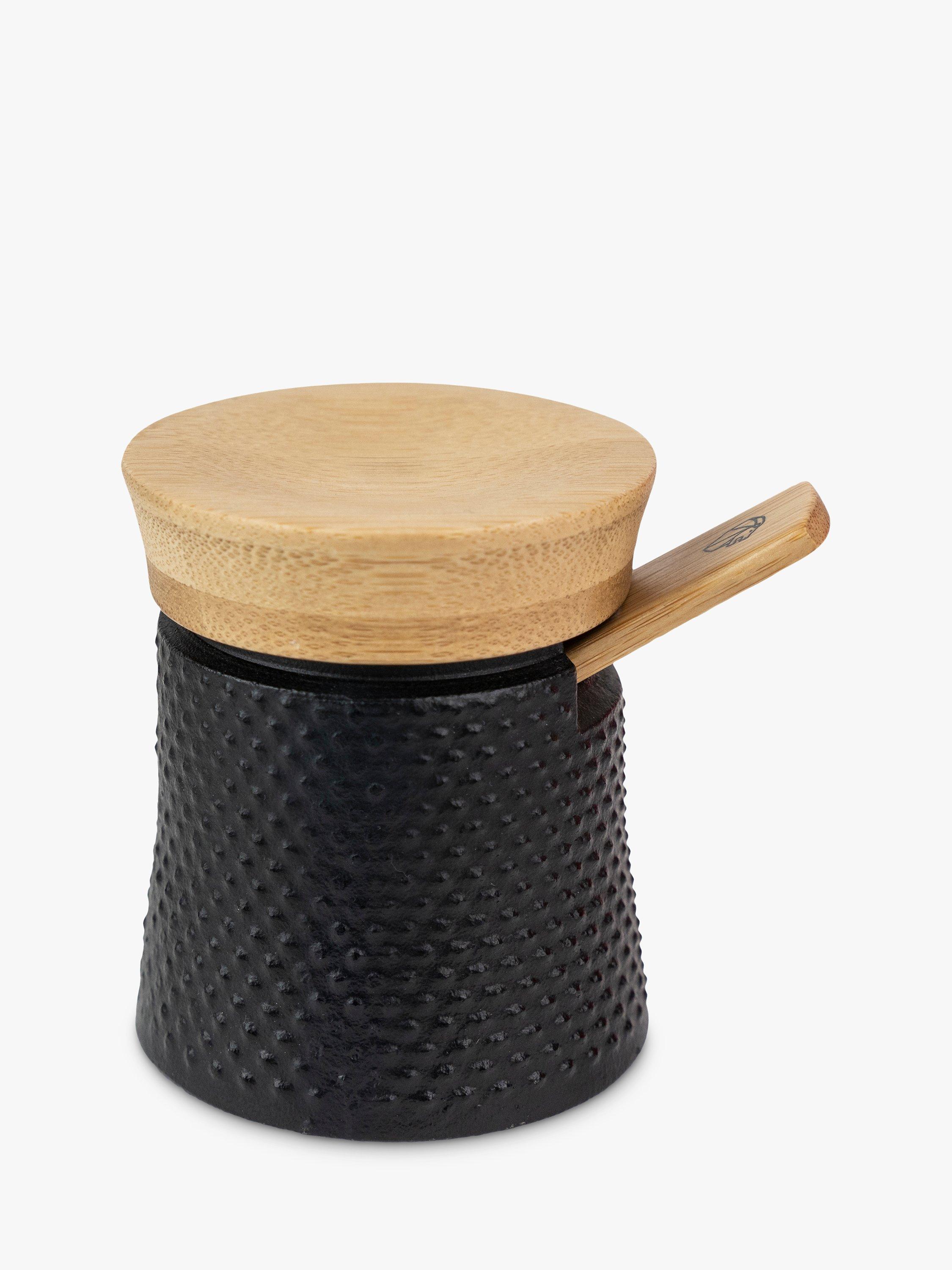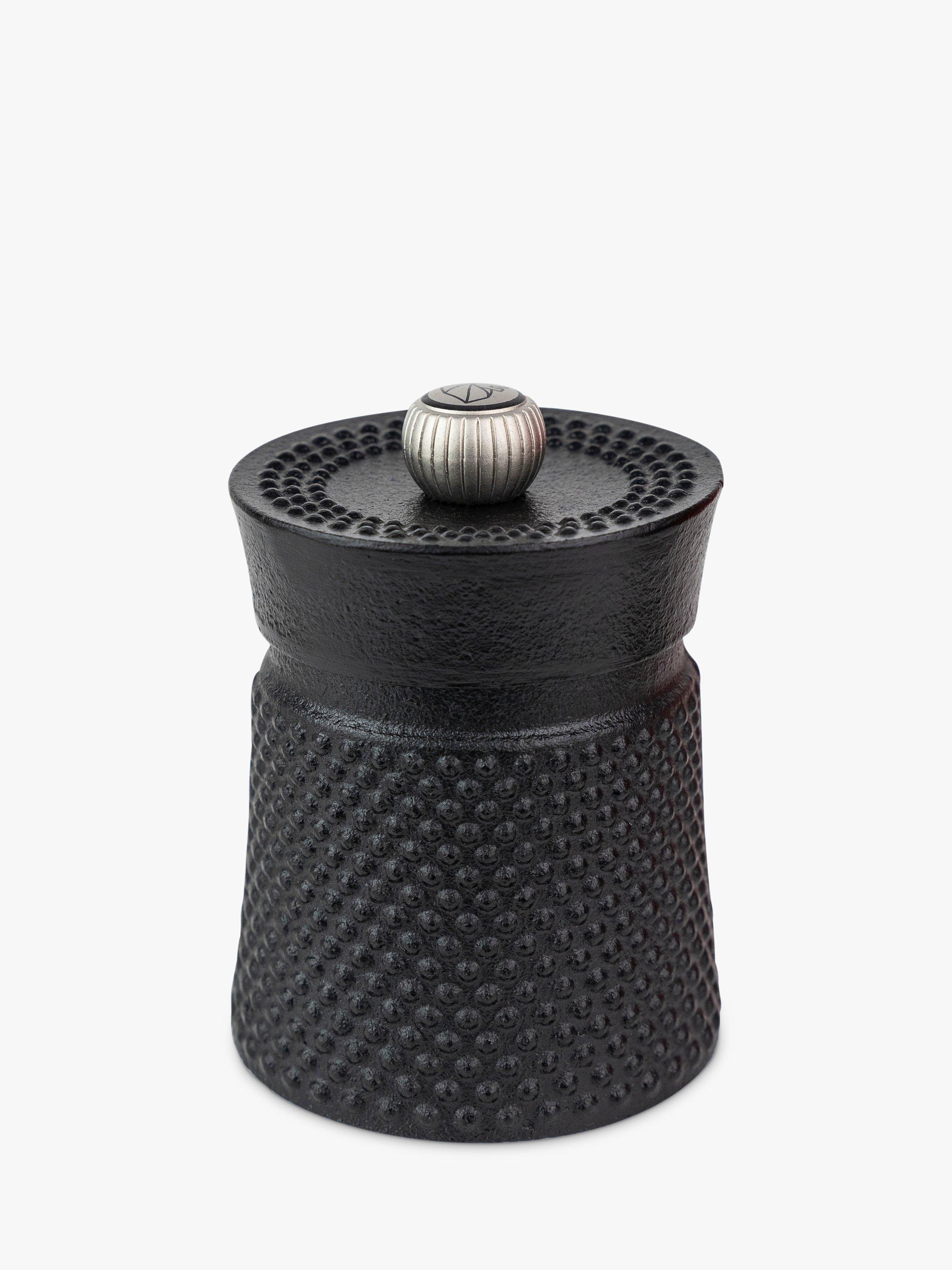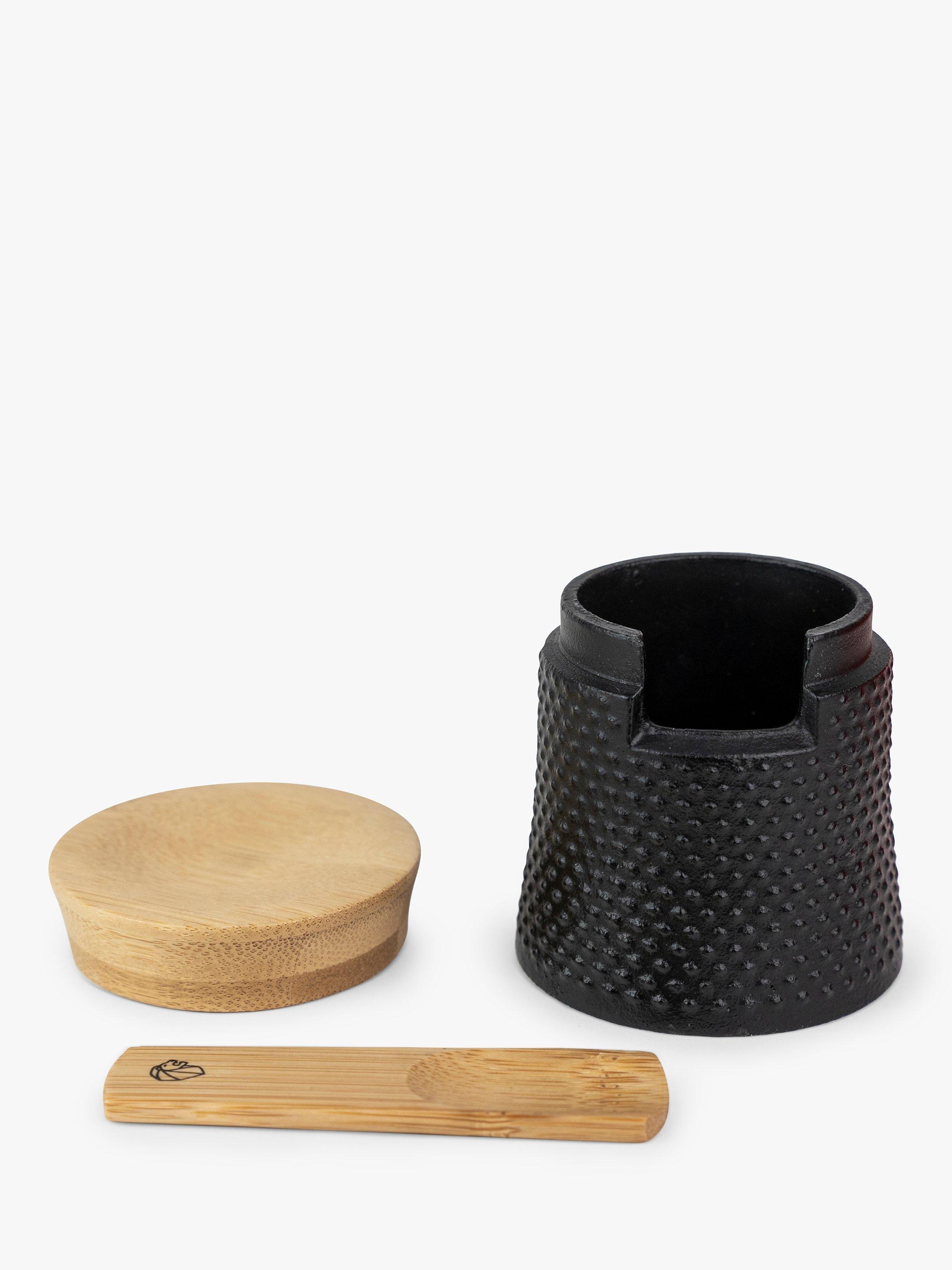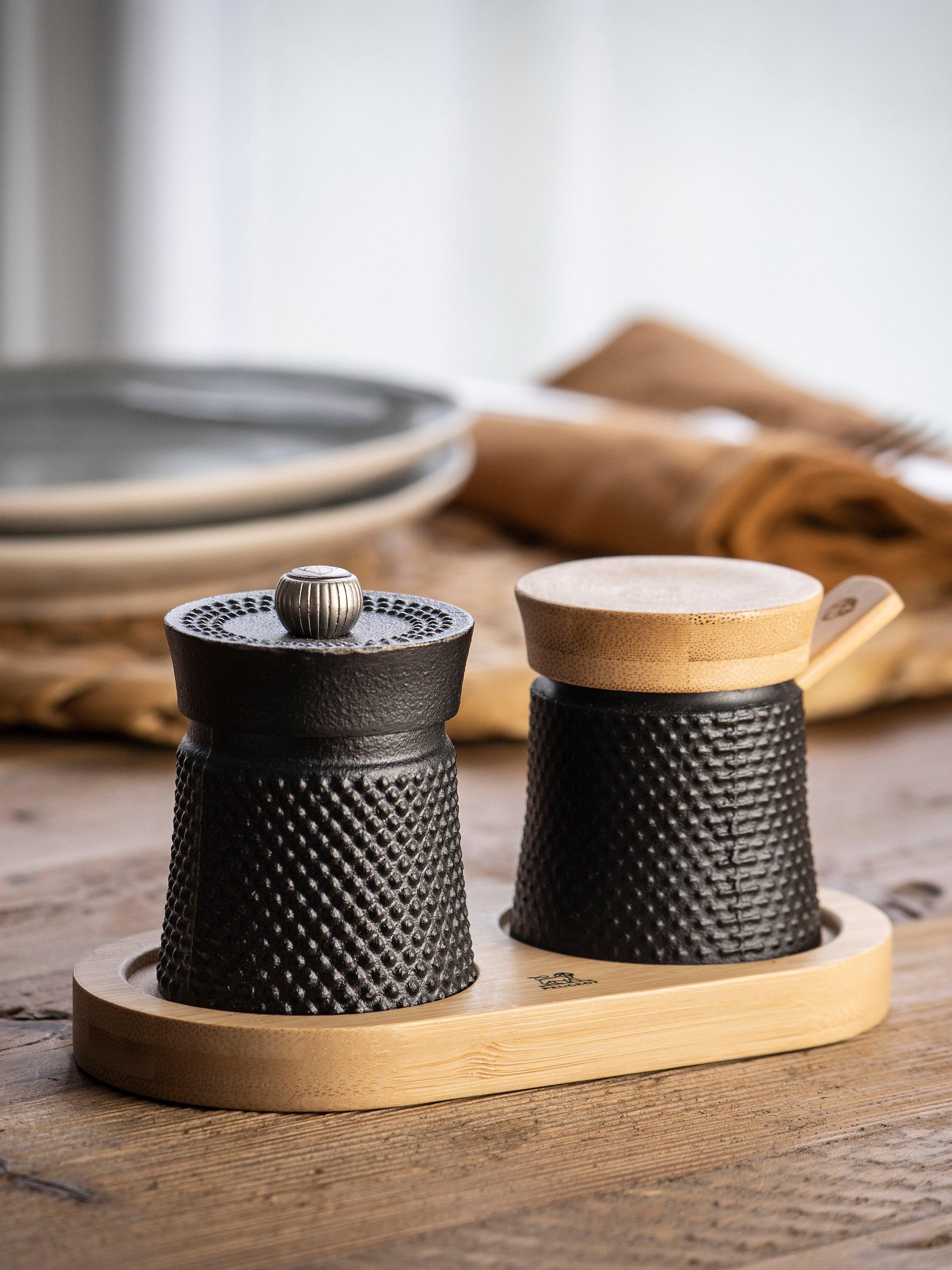 A reassuring sturdy pepper mill made with hand-cast iron, with a tactile matt and slightly raised finish. The distinctive Asian design influence resembles cast iron teapots. Use at the table and in the kitchen. Fitting comfortably in the hand, the charming pepper mill is accompanied by a delightful salt dispenser with a spoon, a lid and a table serving tray for both in bamboo.