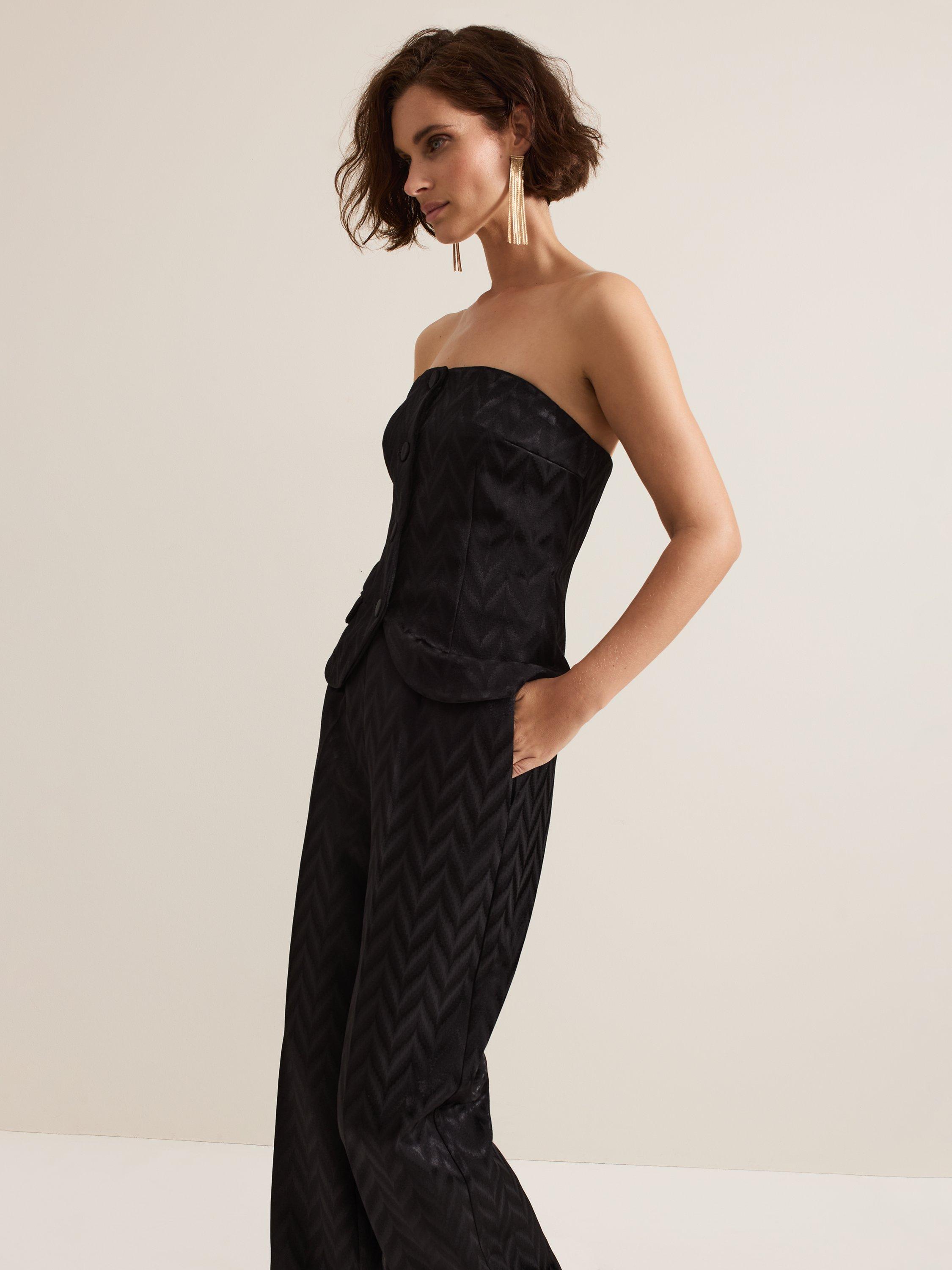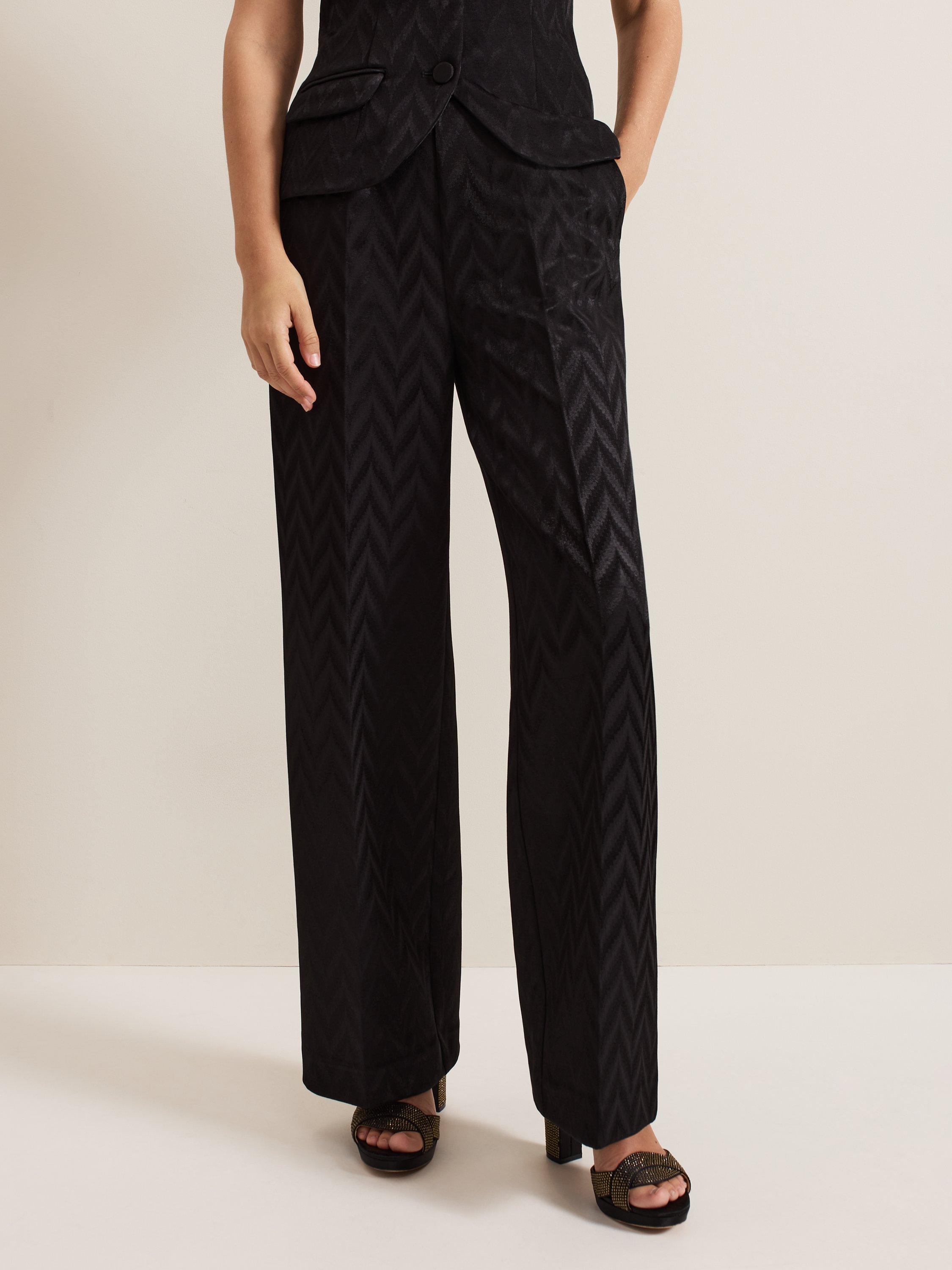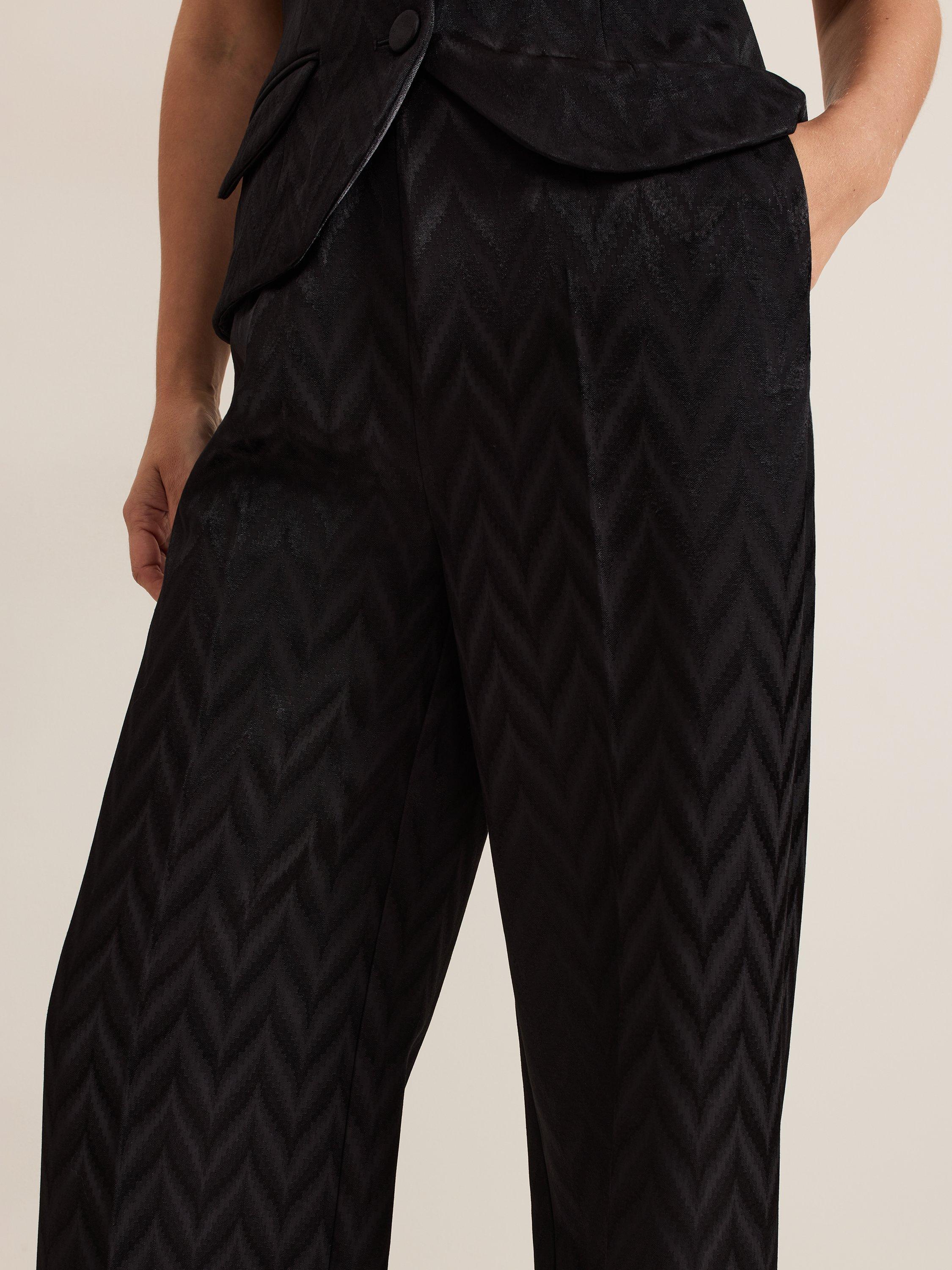 Designed in classic black with a subtle zig zag print, the Adalynn suit trousers feature front seams and fasten at the side with a zip, falling to a straight leg silhouette. Pair with our Adalynn bandeau and jacket for a coordinated 3-piece style. This style is responsibly sourced. This style has been made from recycled polyester, giving materials that would have ended up in landfill a new lease of life.
