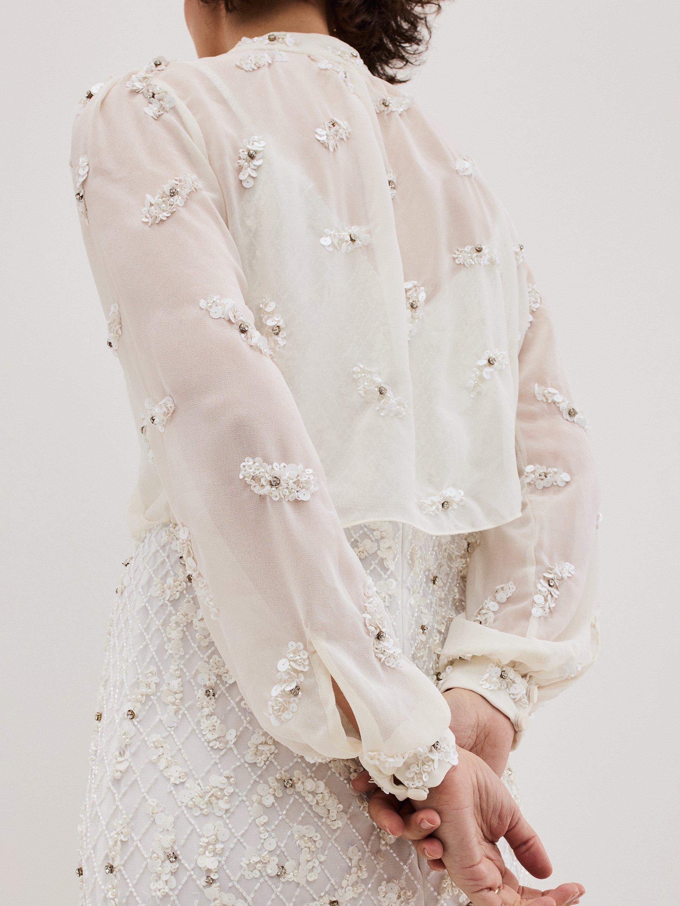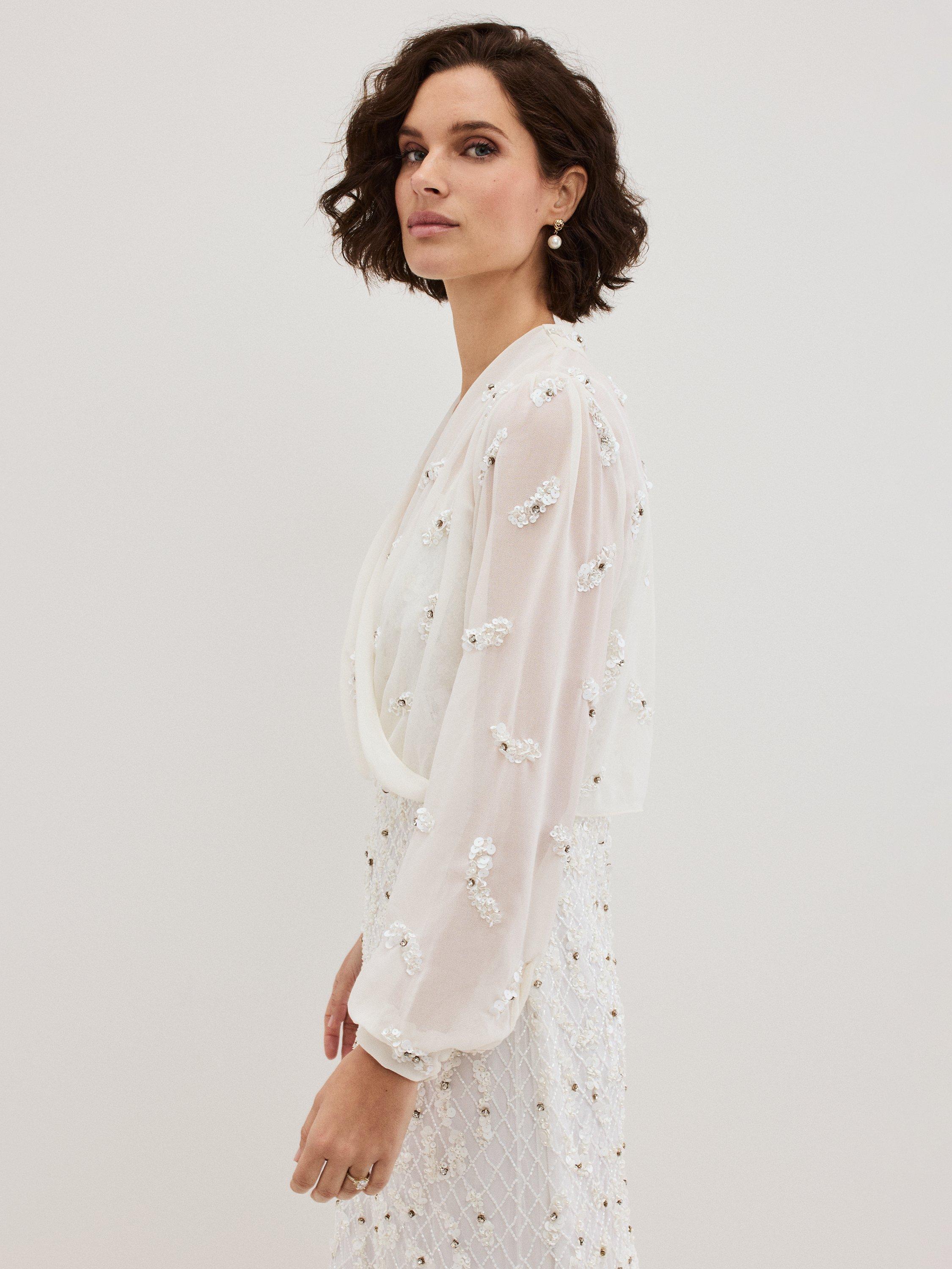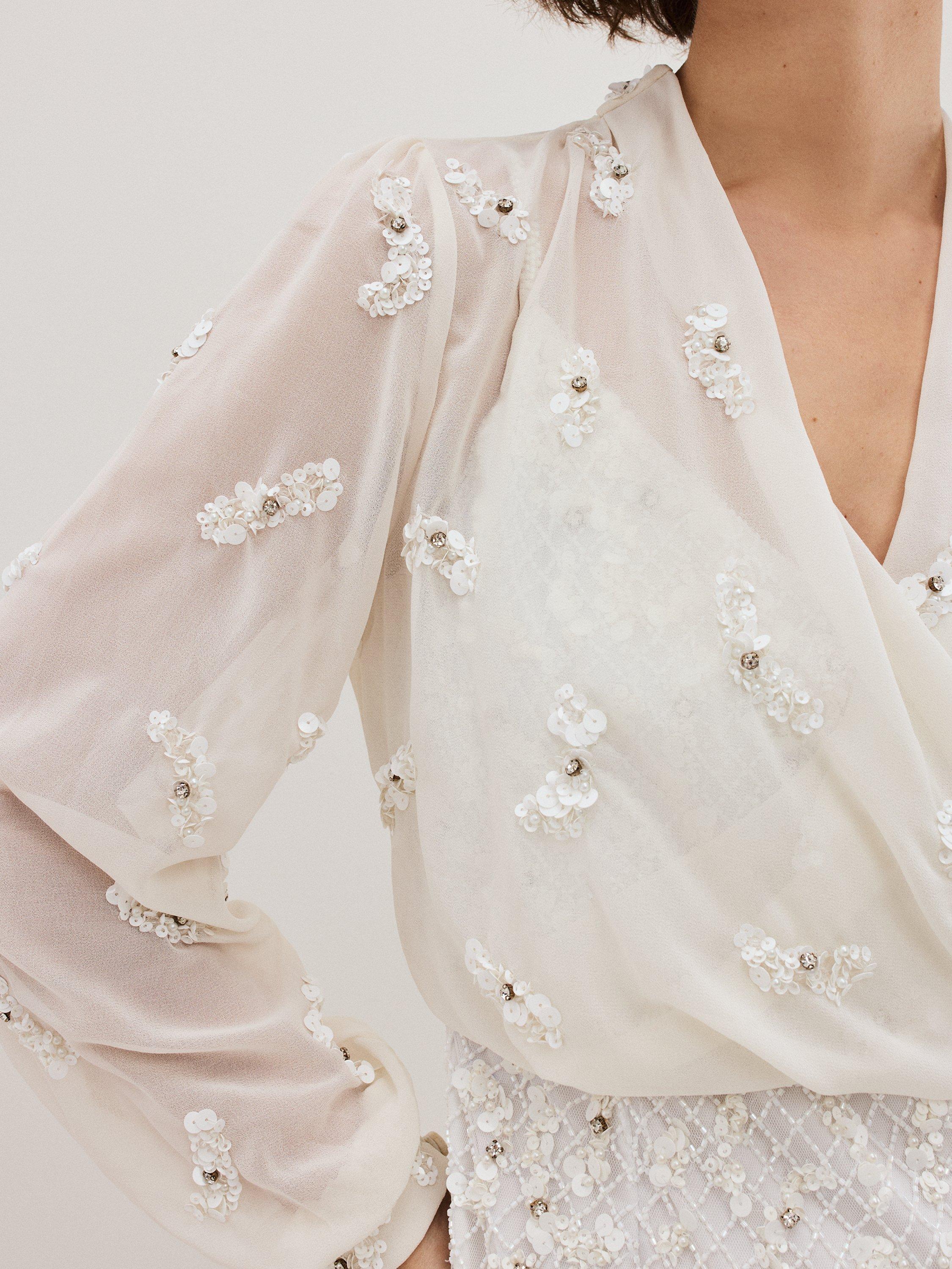 The perfect finishing touch. With hand-beaded embellishment and rhinestone detailing, this semi-sheer cover up is designed to a faux-wrap style.