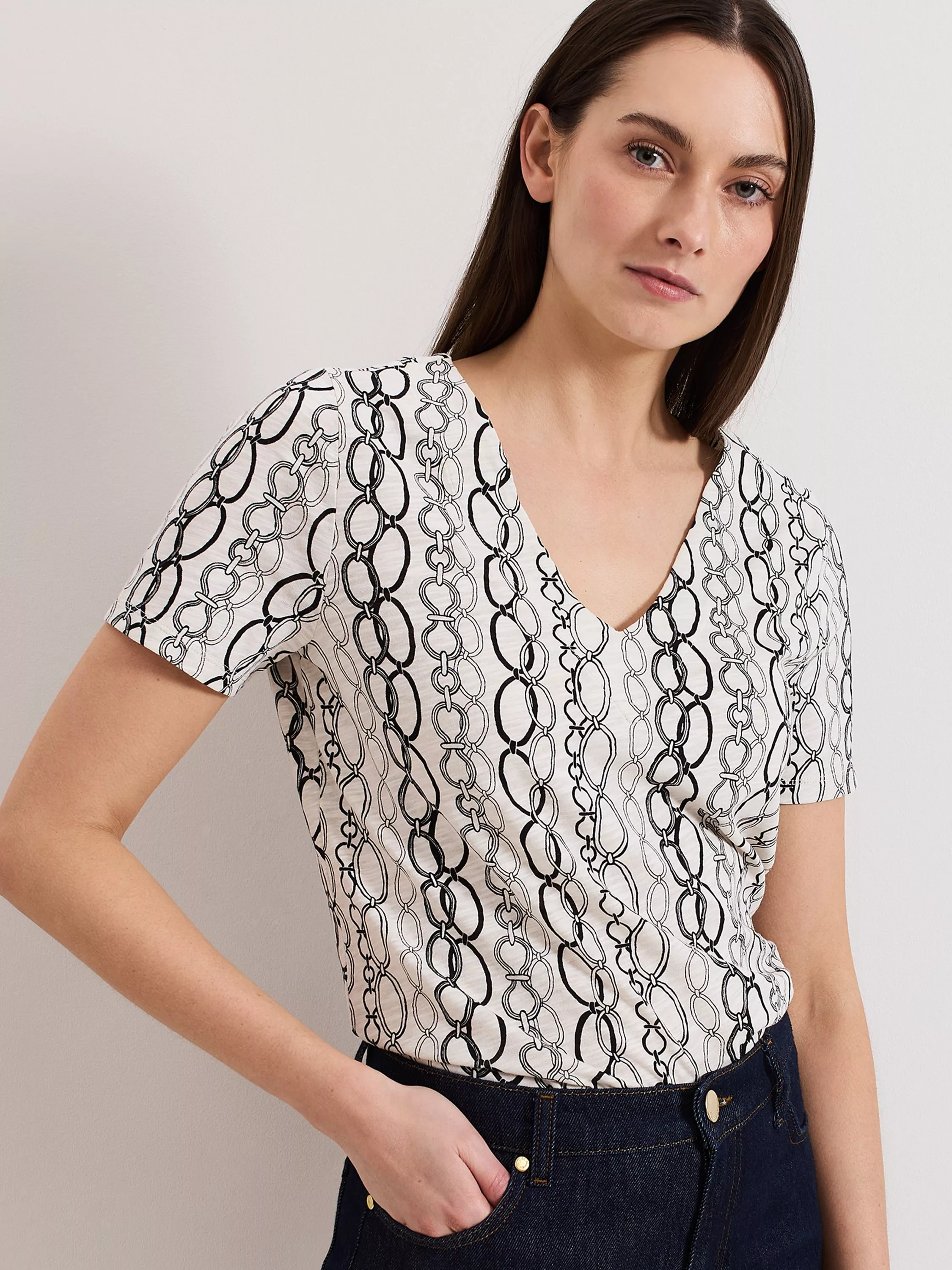 Add a touch of contemporary print to your everyday style with the Alice top. In a lightweight, breathable cotton this V-neck style is the perfect option for an everyday style with added interest. To take you into the evening simply add some black heels to tie back to the chain print.