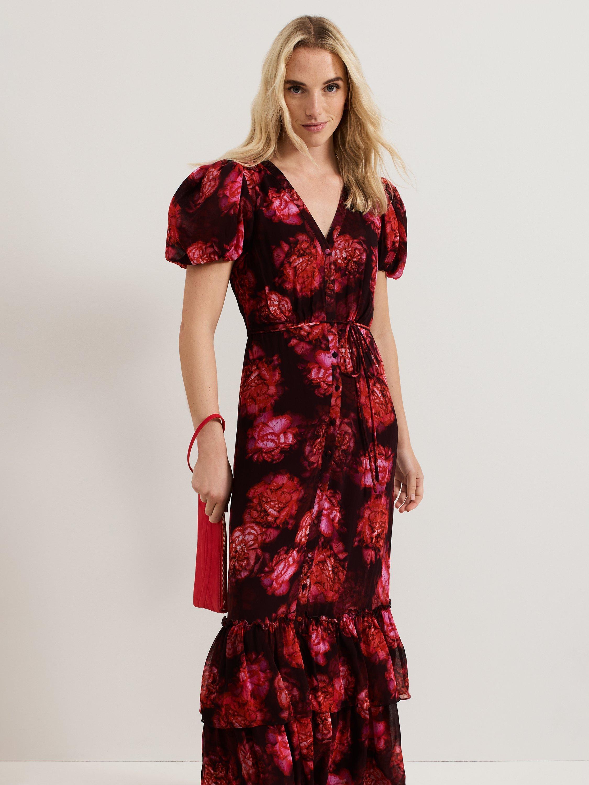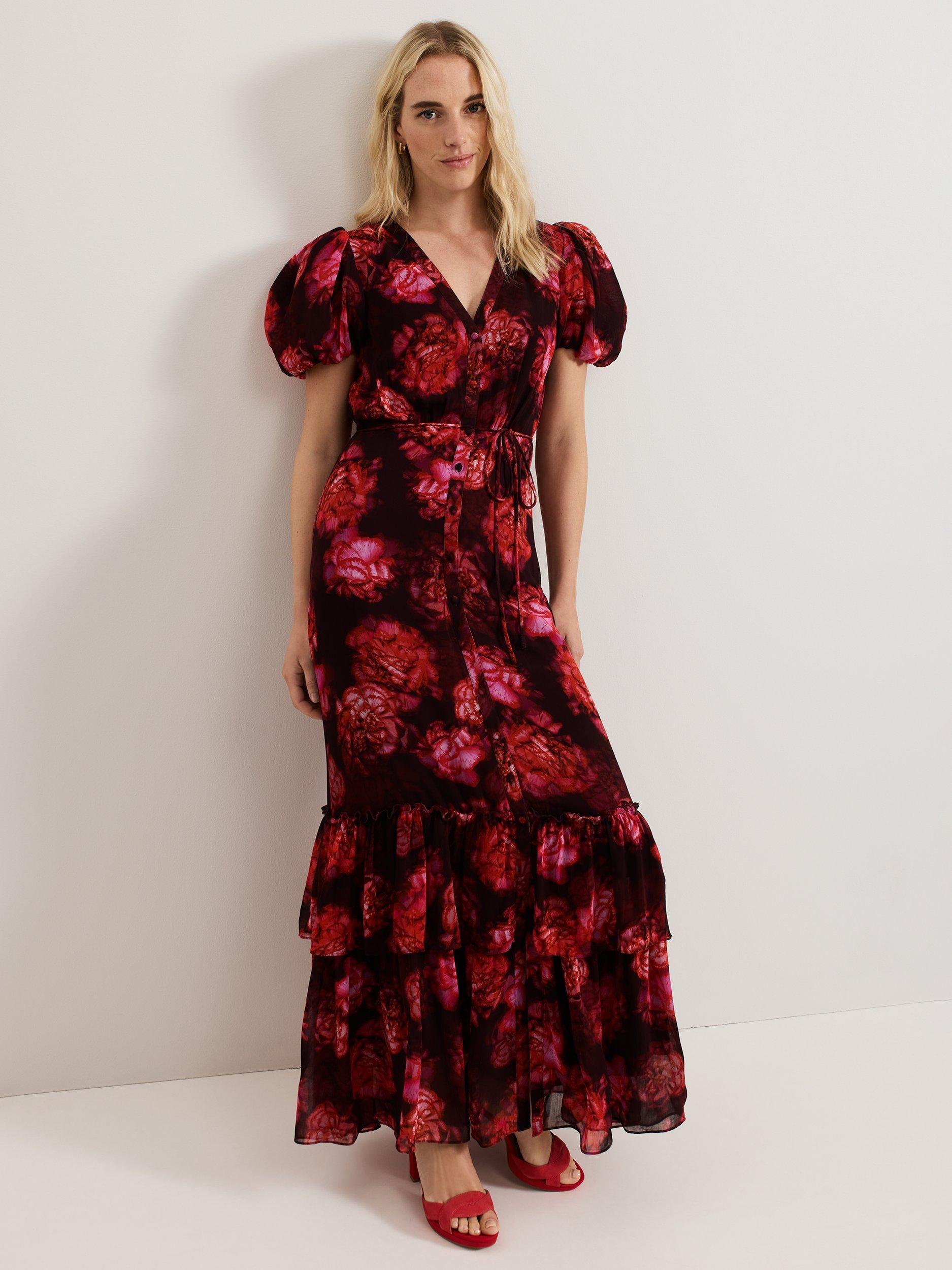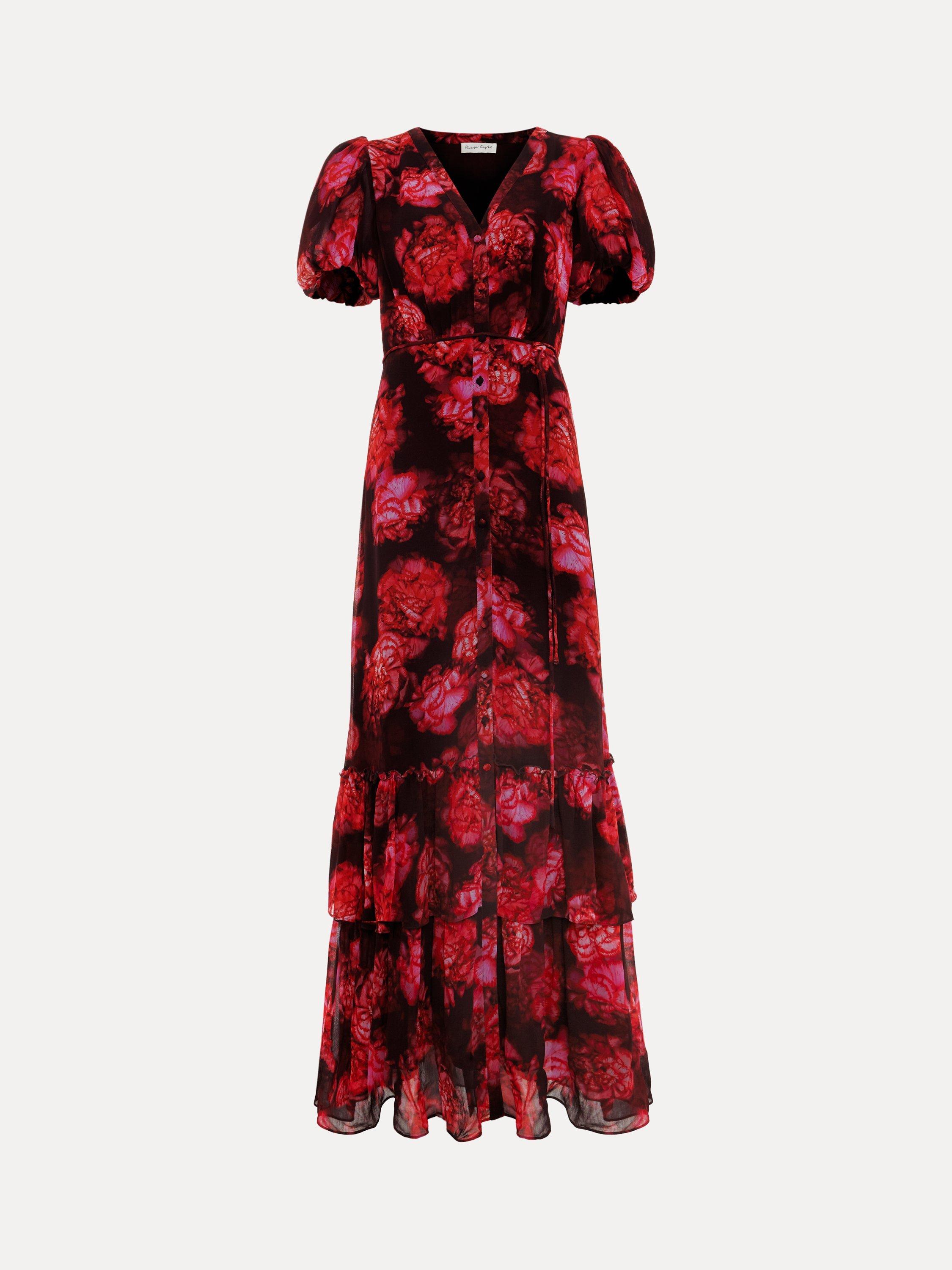 Featuring a new striking floral print designed in-house, the Amaris dress is a statement occasion style you won't find anywhere else. The short puff sleeves add subtle dimension to this maxi style whilst the tie belt highlights your figure before flowing through to a tiered skirt that moves elegantly with you. Style with matching red accessories for a coordinated event look.