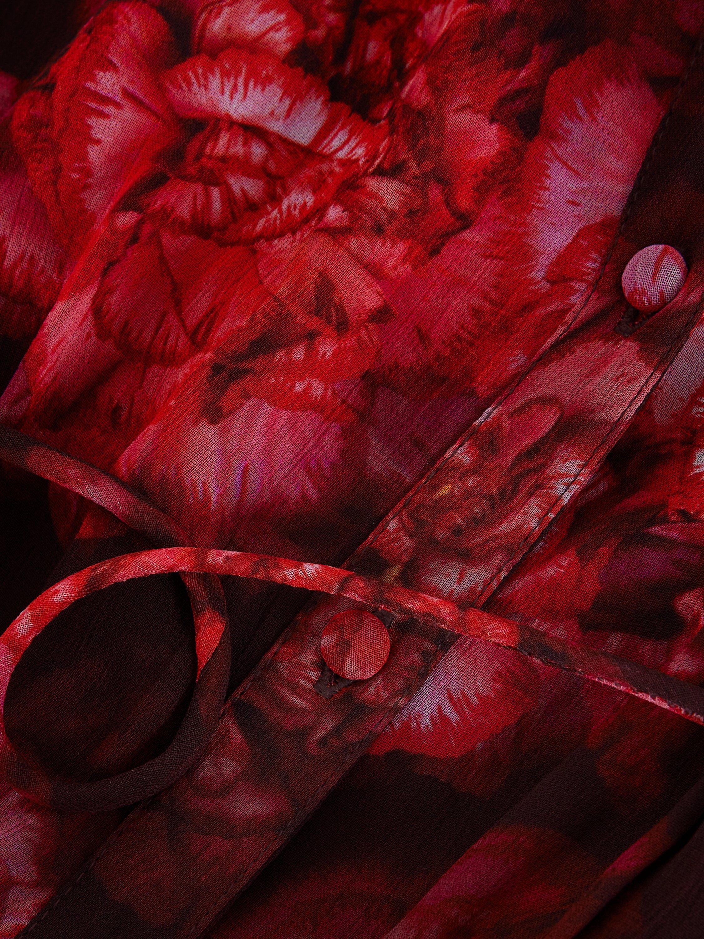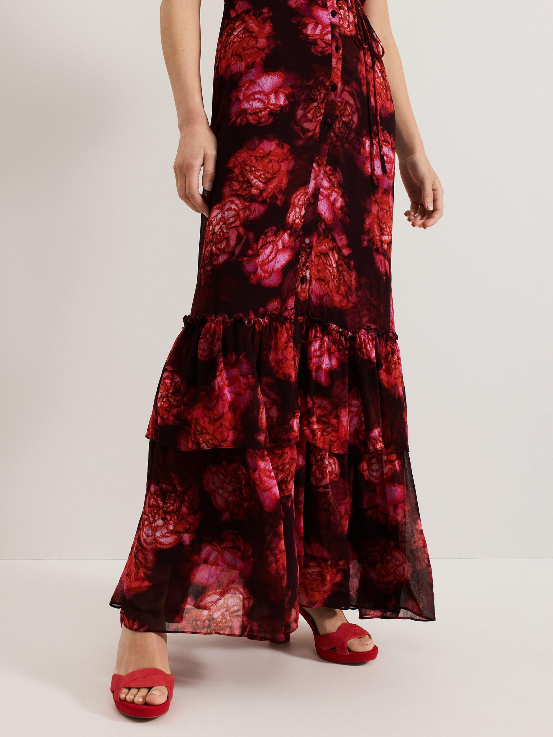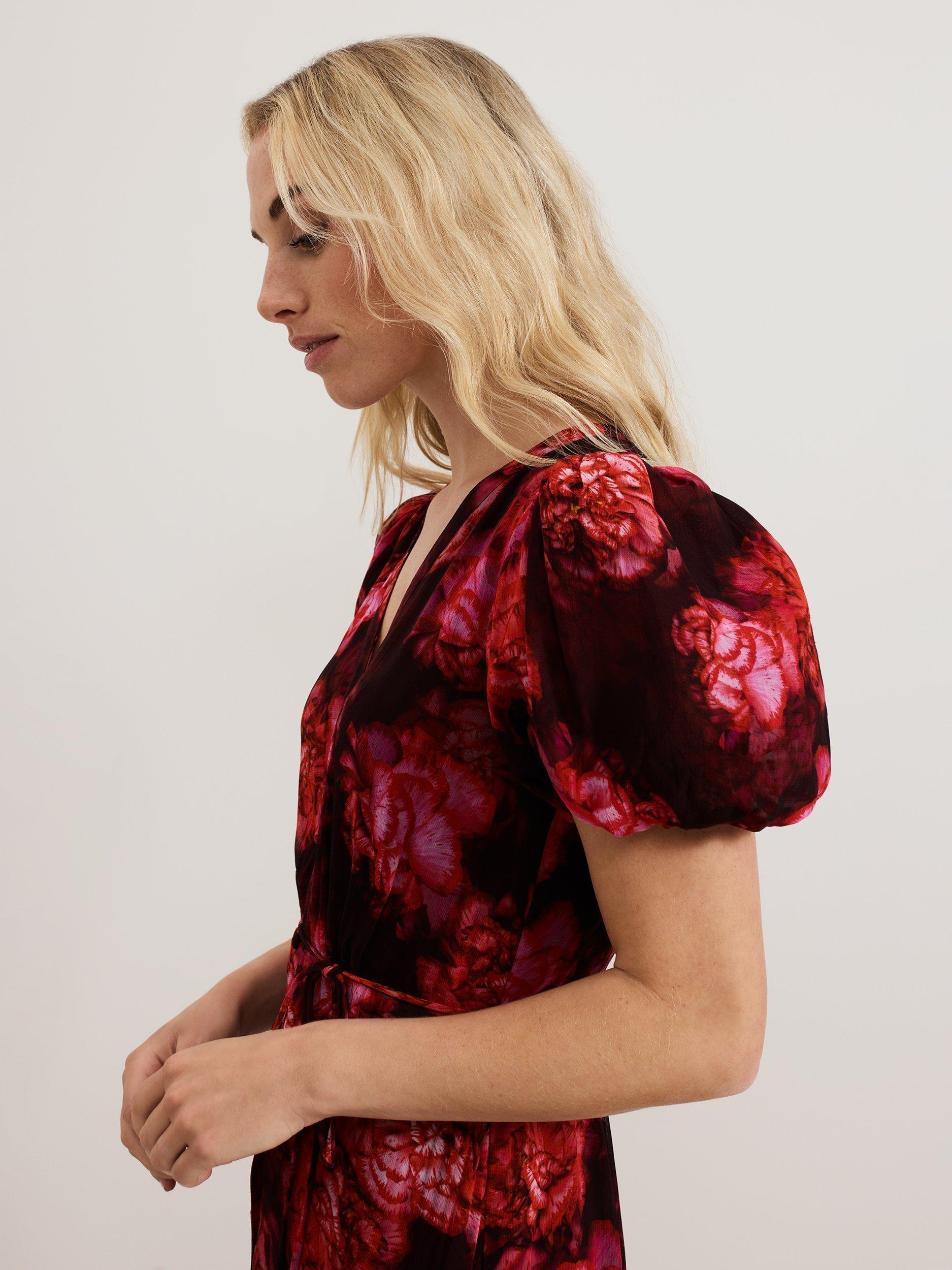 Featuring a new striking floral print designed in-house, the Amaris dress is a statement occasion style you won't find anywhere else. The short puff sleeves add subtle dimension to this maxi style whilst the tie belt highlights your figure before flowing through to a tiered skirt that moves elegantly with you. Style with matching red accessories for a coordinated event look.