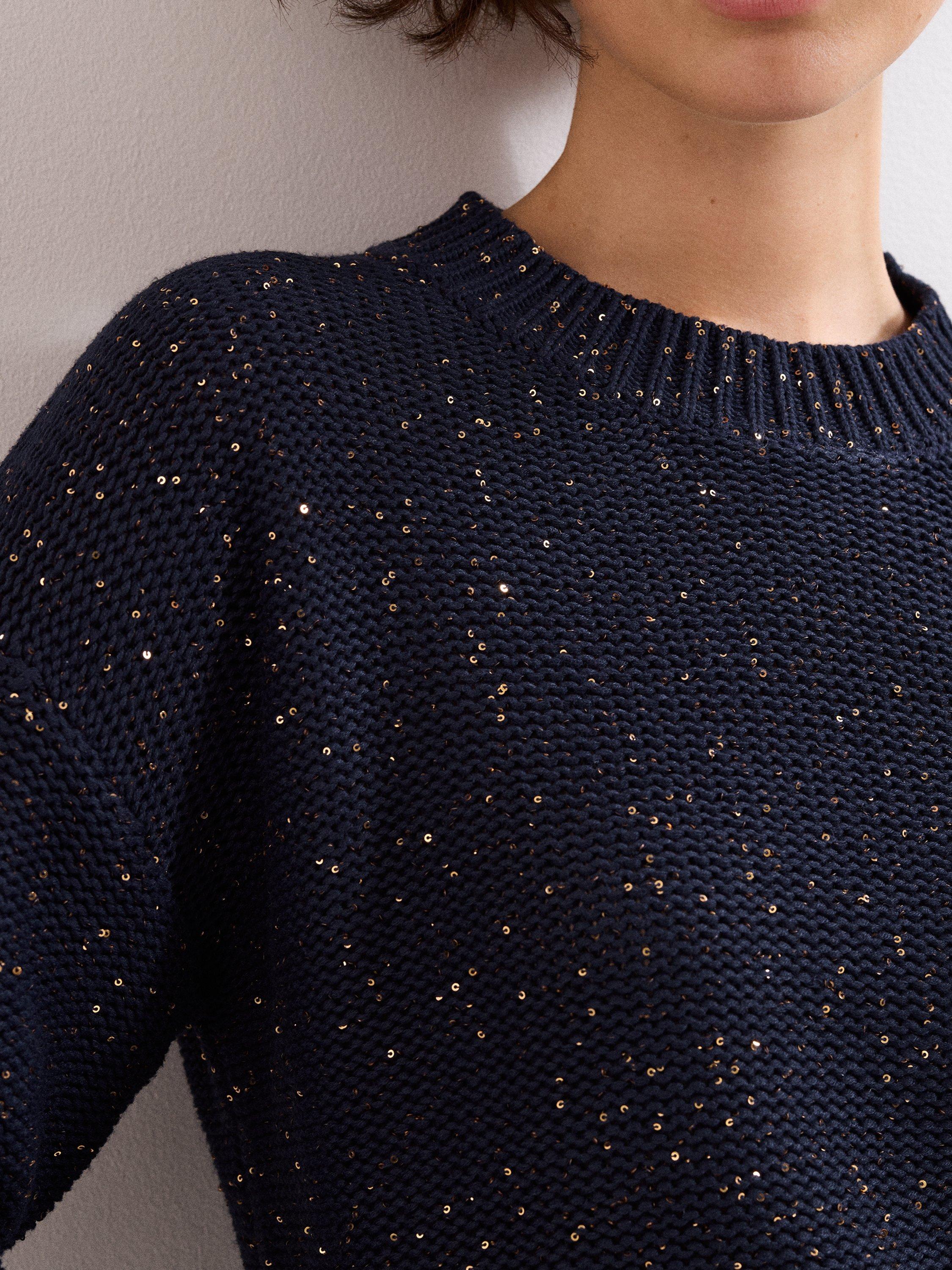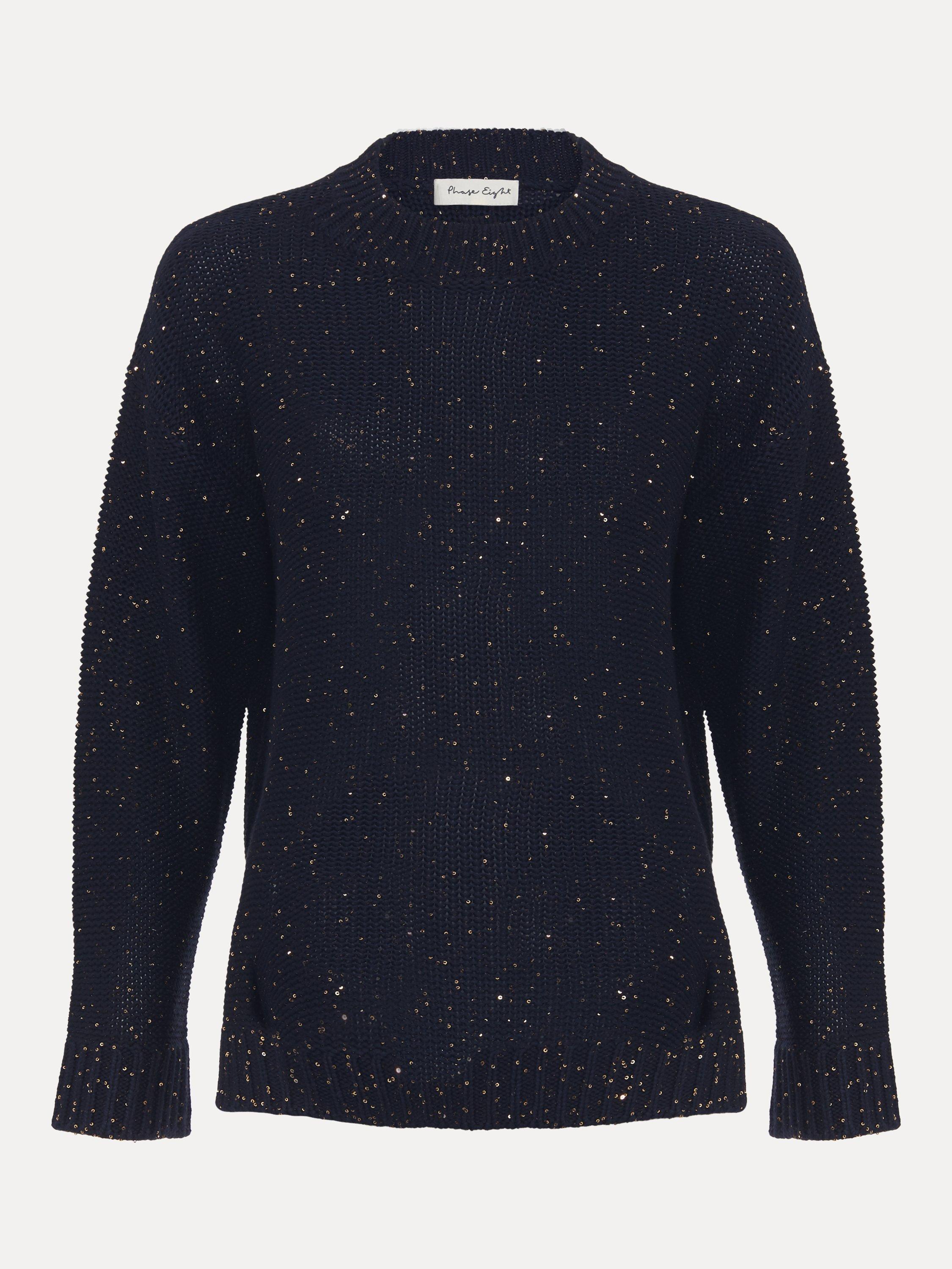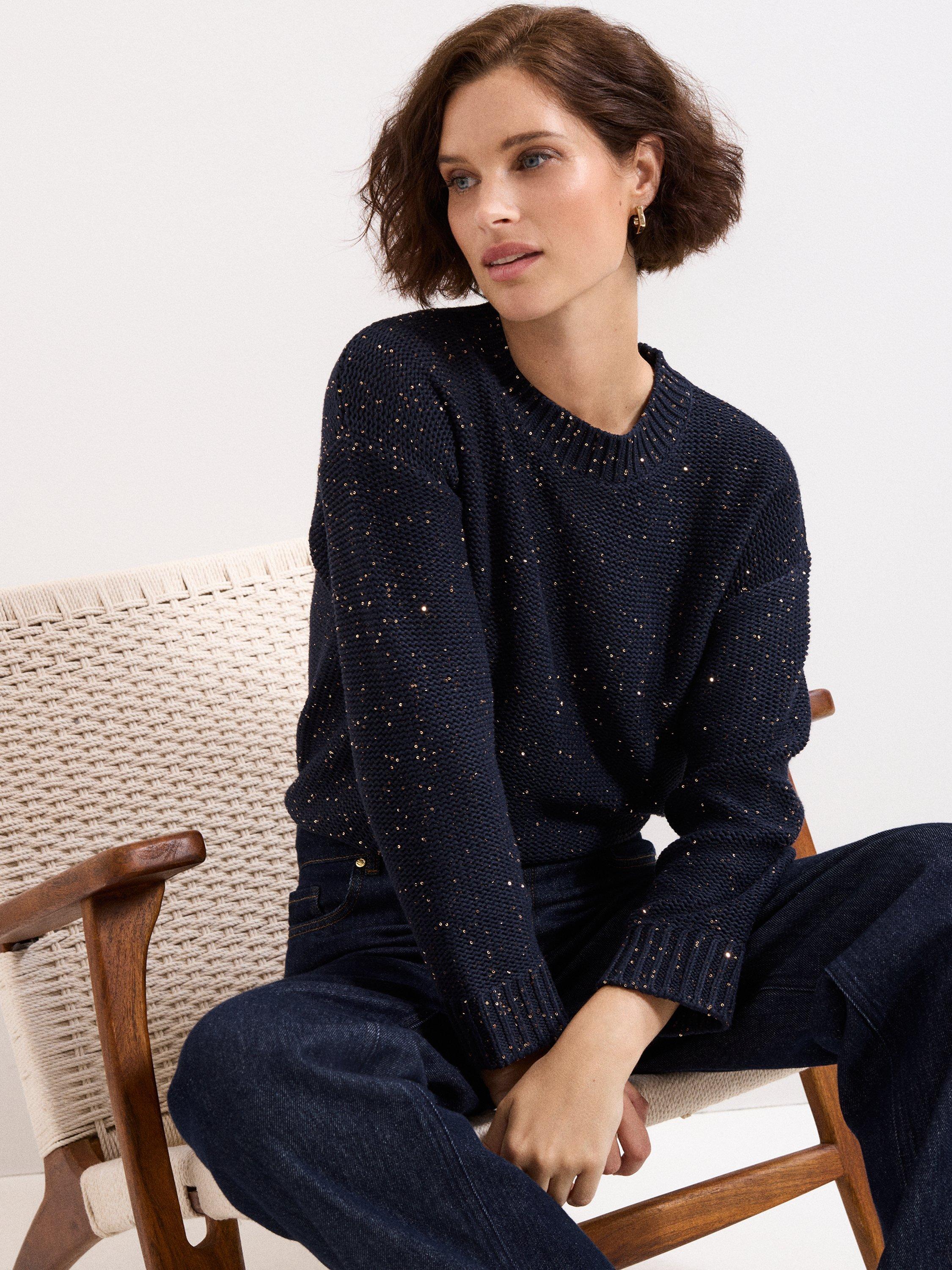 This classic jumper features specks of sequins for a subtly glam touch. Designed to be worn every day with jeans, but can be effortlessly styled up for sophisticated evening looks, paired with skirts and heels.