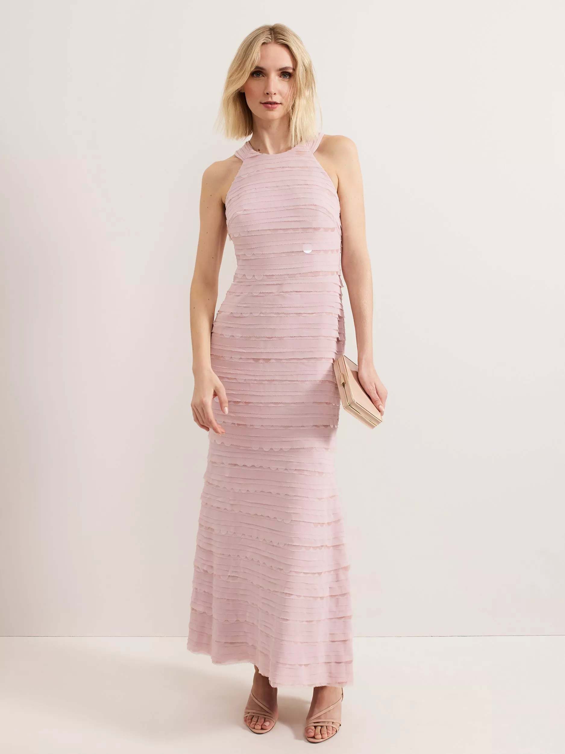Completely covered in layered sequin discs, the Amitis dress is perfect for high glamour occasions. The halter-style neckline adds an elegant feminine touch whilst the column silhouette flatters your figure, flowing through to a maxi silhouette for full dramatic effect. Keep it simple with some heels and a clutch at your next special event.