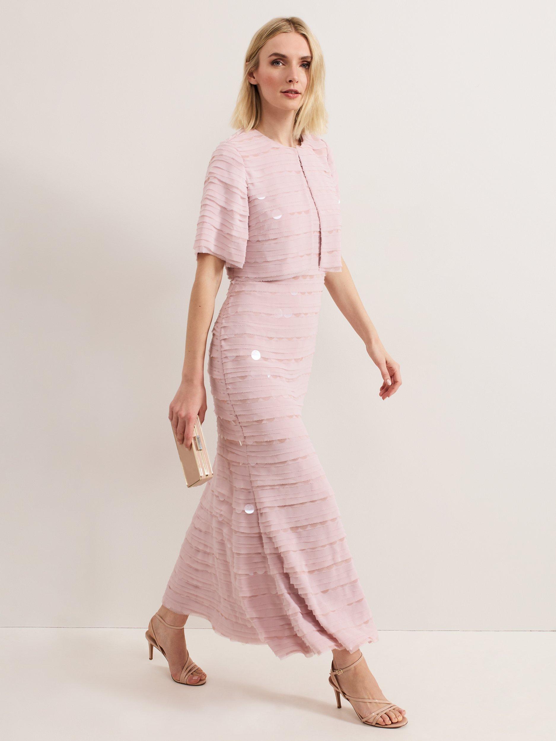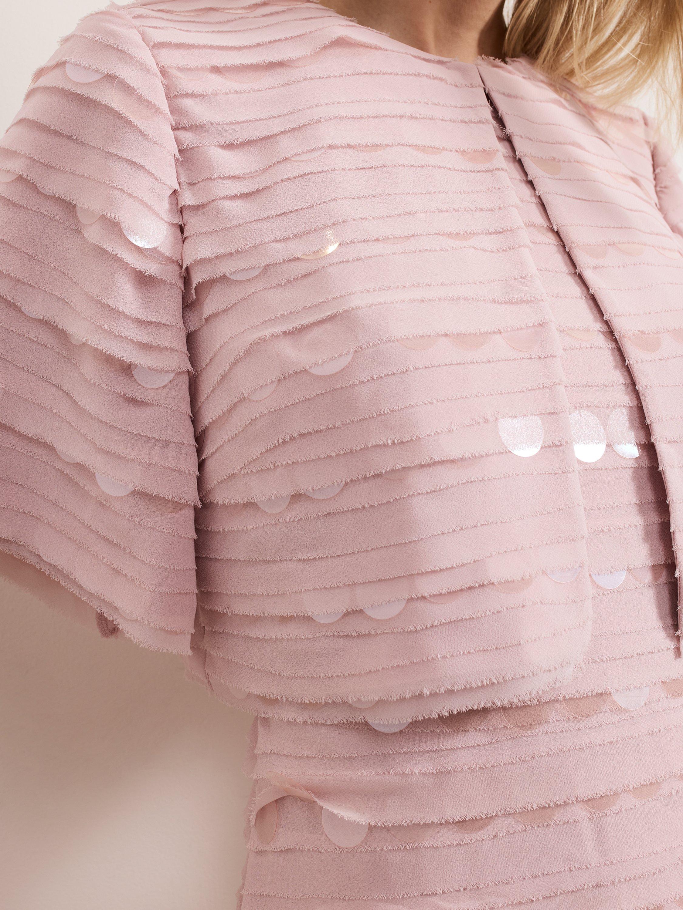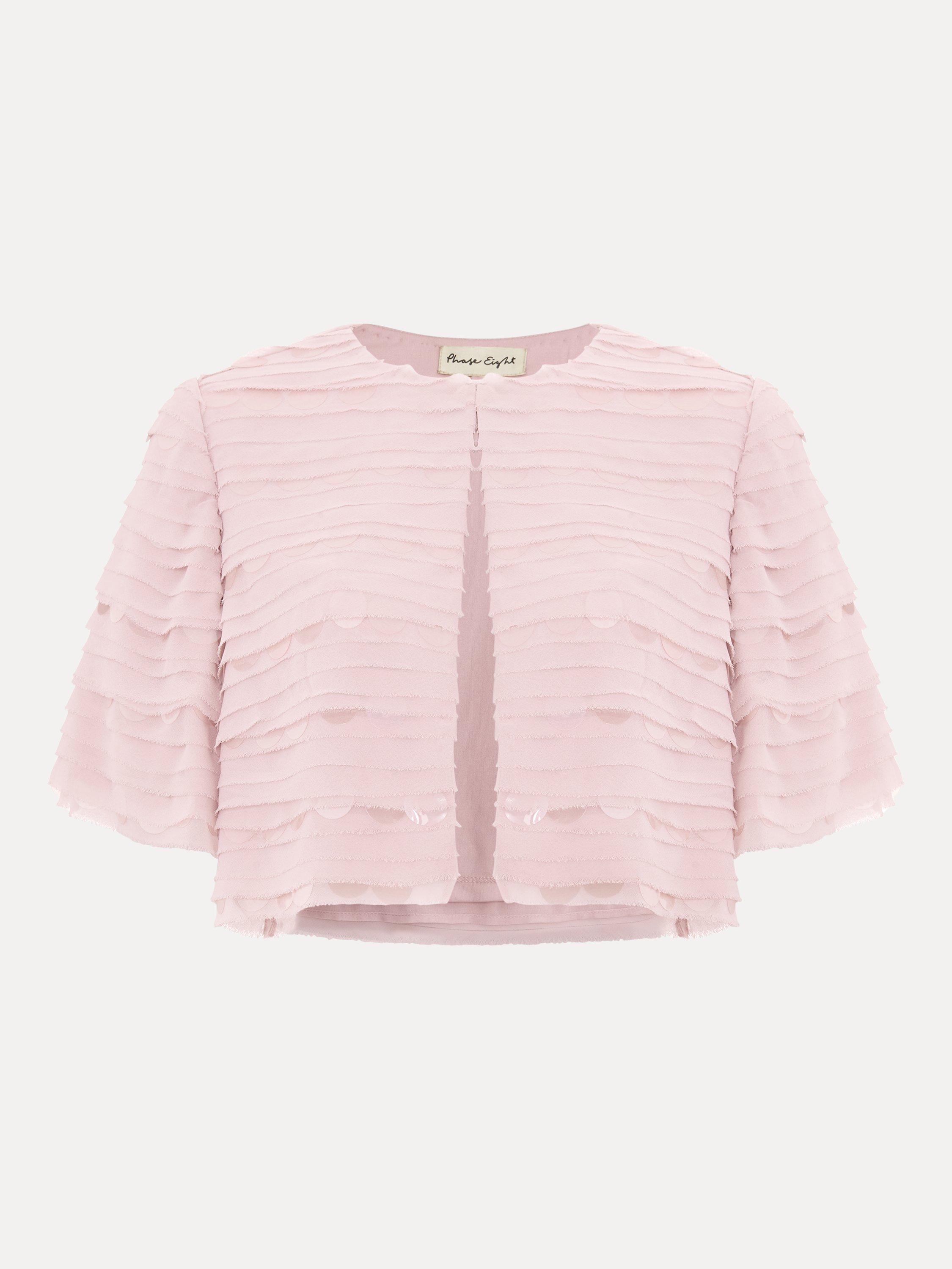 The ultimate event jacket. The Amitis jacket is embellished with layered sequin discs and fastens with a single button at the neckline. The cropped silhouette sits perfectly at your waist.