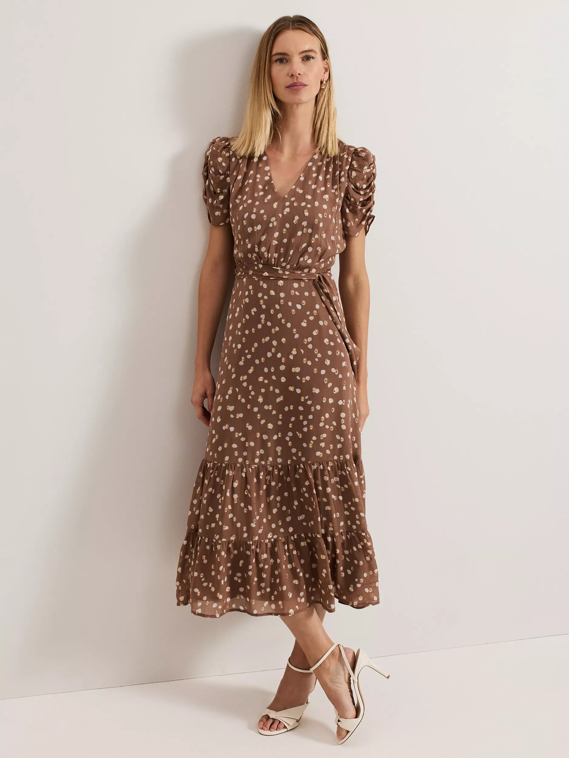 Polka dots never go out of style. In a subtle shade with spots, the Amy dress features intricate detailing. Ruching creates a gathered effect at the sleeves, falling to a midi length with an elegant tiered hem. Flecks of gold subtly catch the light as you move making it the perfect feminine style for all your upcoming events.