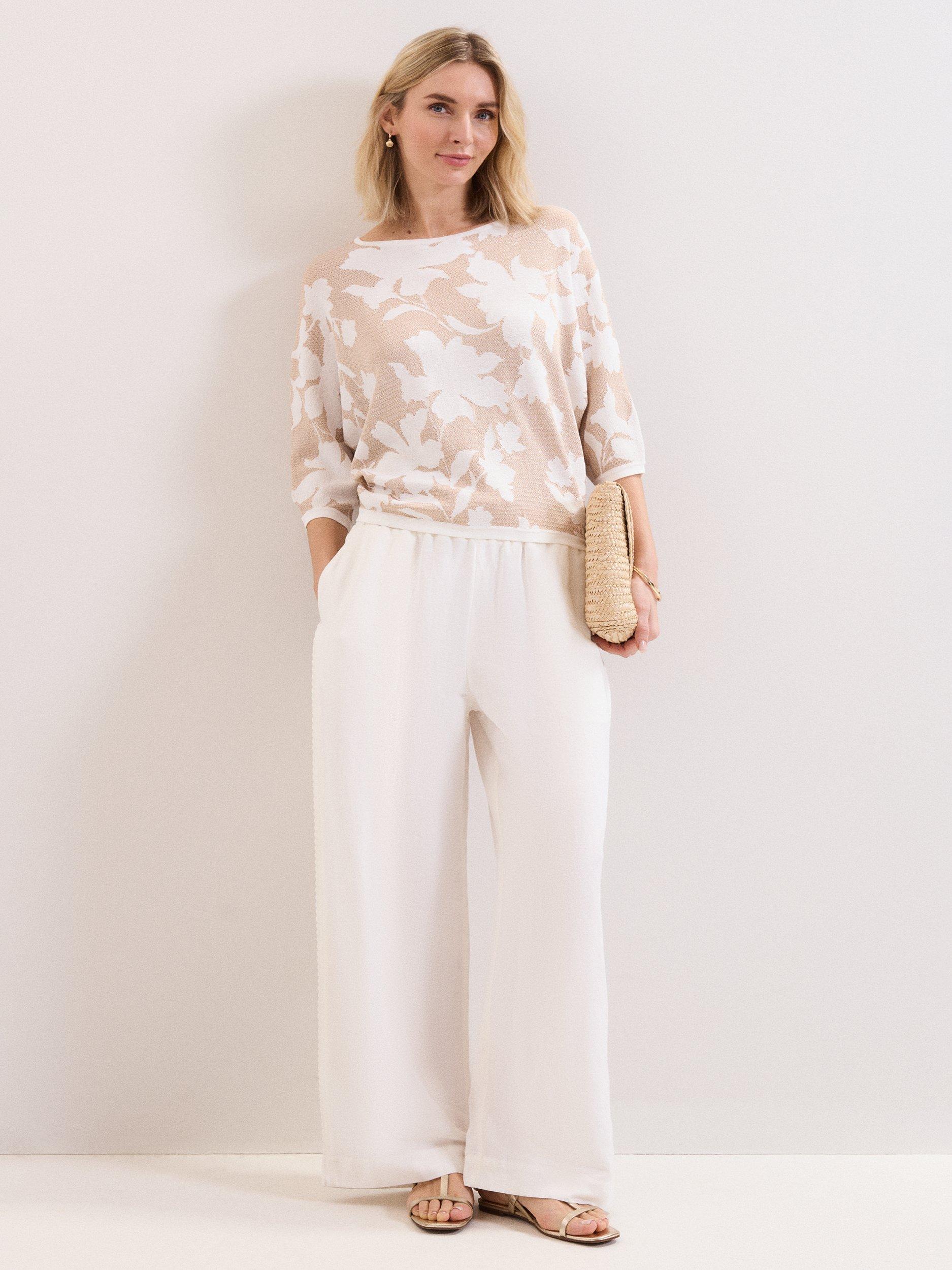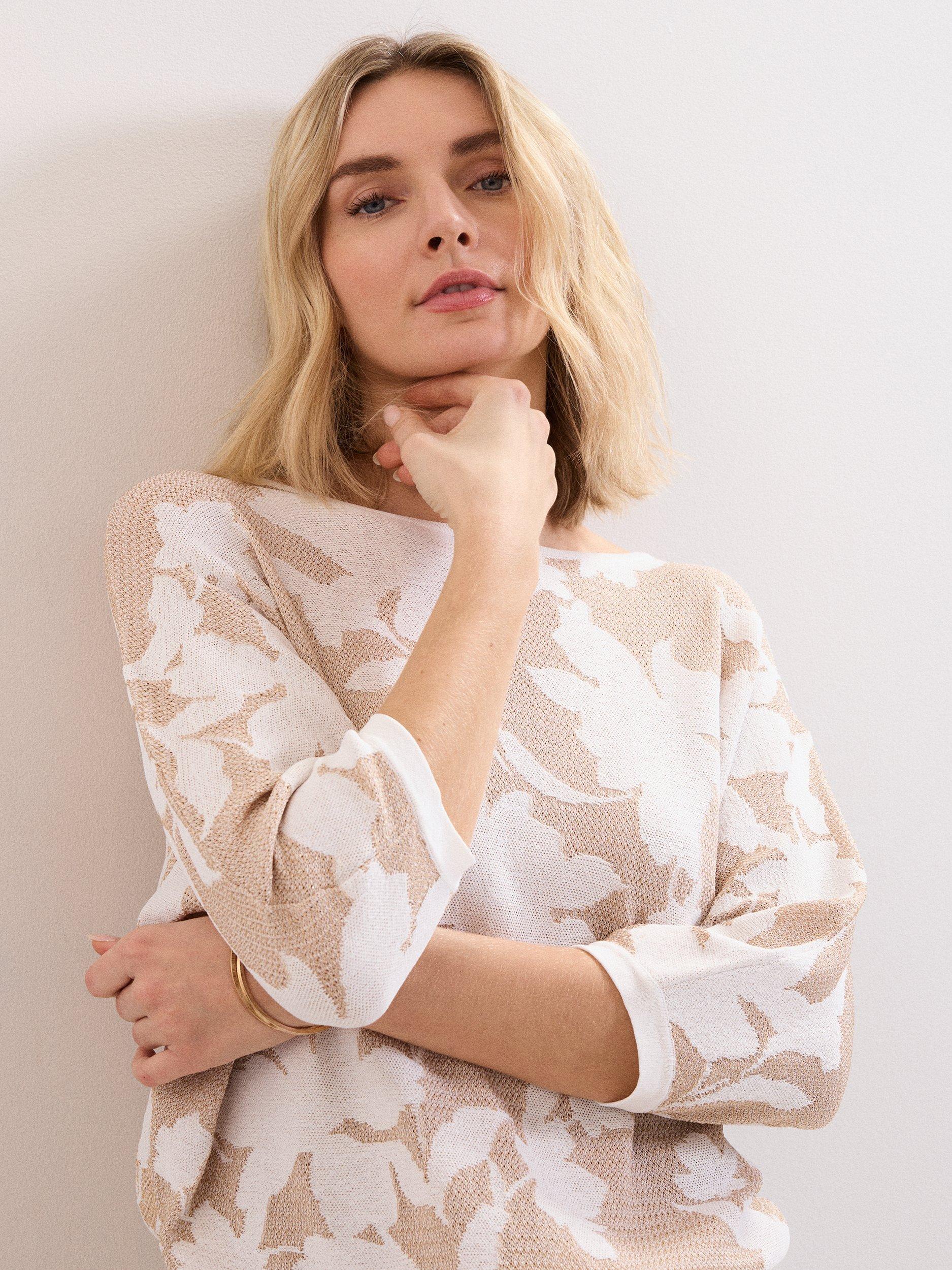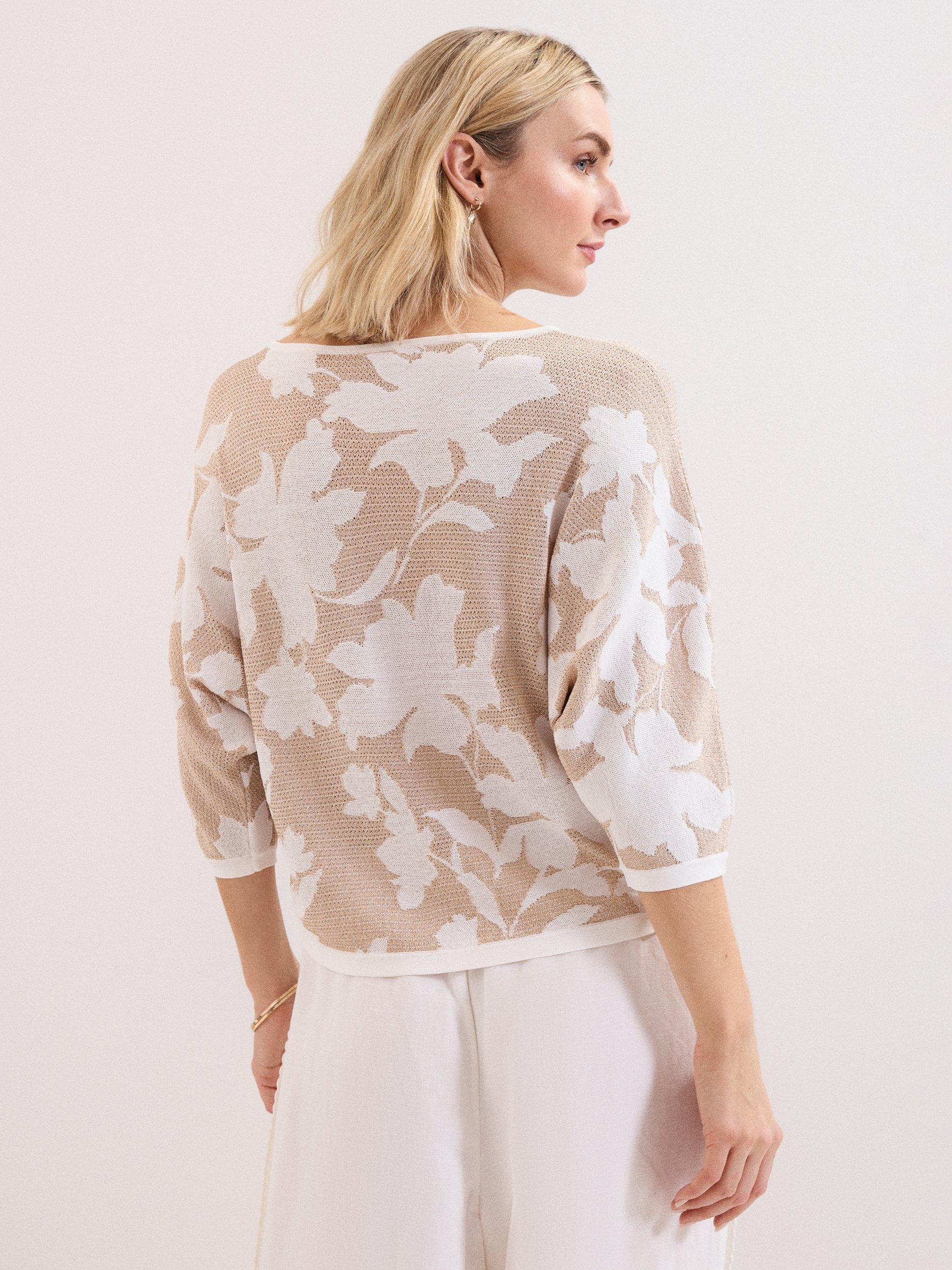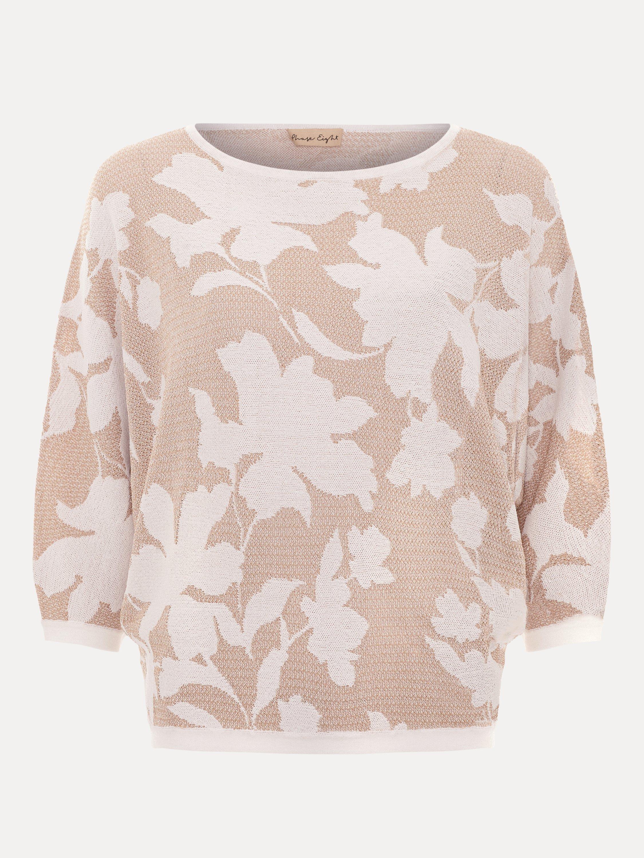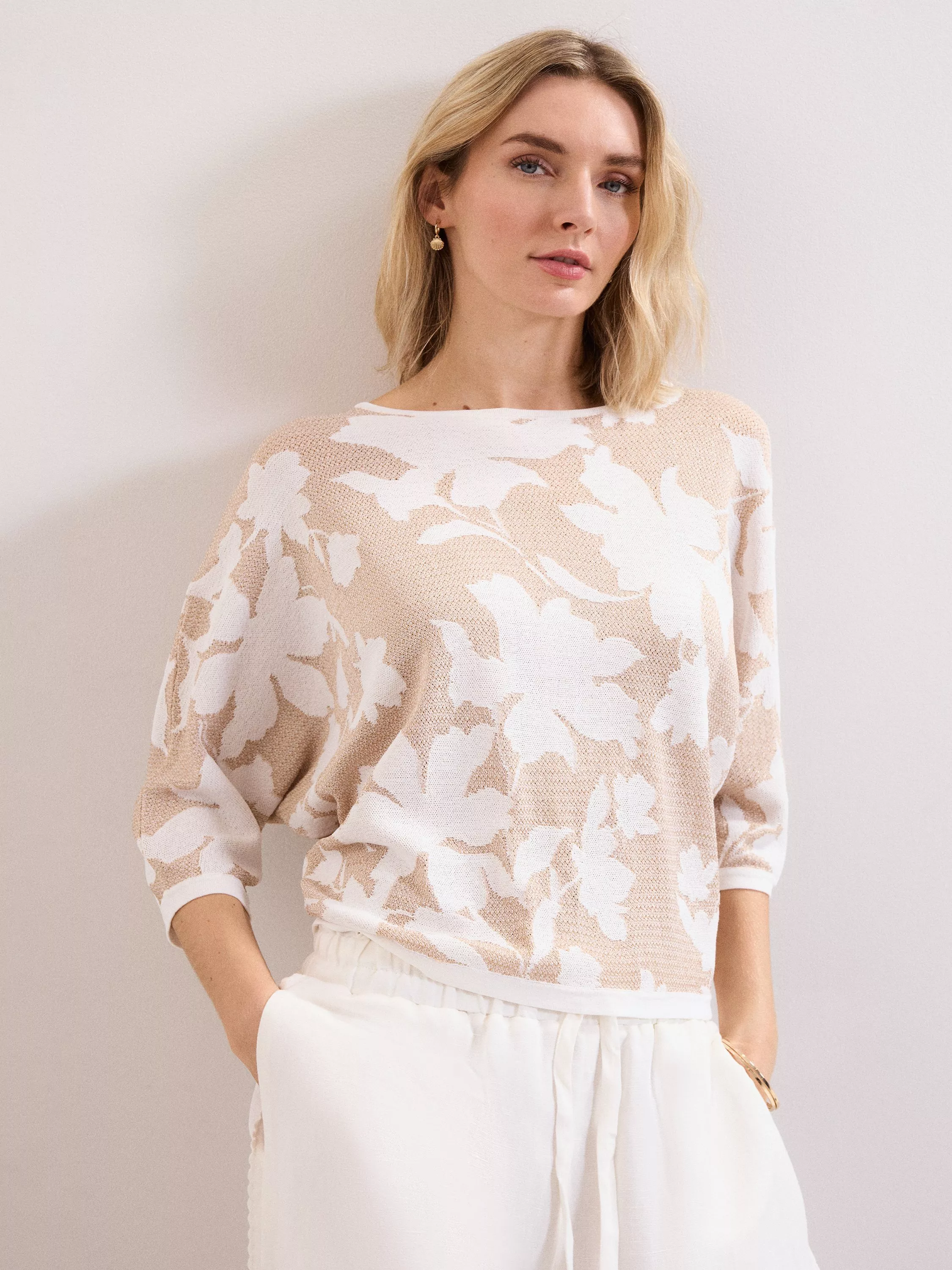 The perfect transitional knit. Designed in a versatile neutral shade, this jumper features a gorgeous floral print and a modern ¾ length batwing sleeve. With a luxe metallic thread woven into the knit, wear this jumper with your favourite jeans and trousers for a relaxed but elevated look.