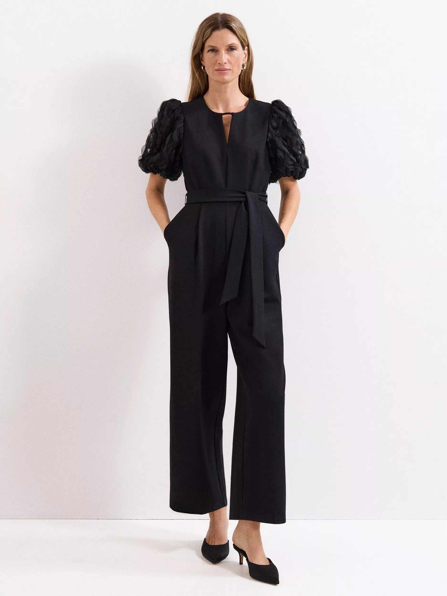 Simplify your event style with a classic jumpsuit, an effortless blend of timelessness and sophistication. This version features exaggerated puff sleeves, enhanced with textured ruffles that add volume to the silhouette. Flowing to structured wide leg trousers for a tailored look, it’s the perfect choice for any occasion in your new season calendar.