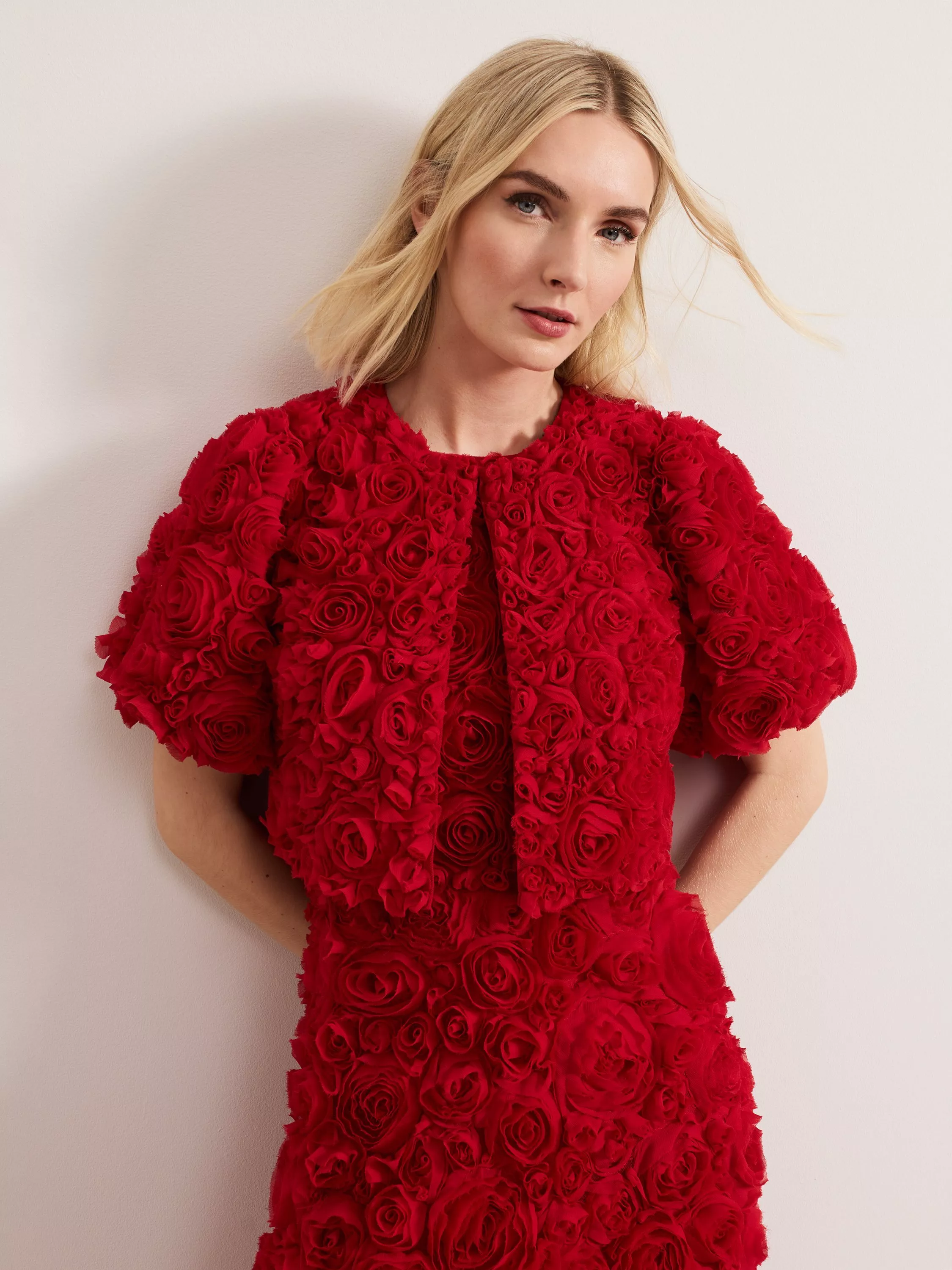 Beautifully romantic, the Angeline jacket is a sophisticated occasion style. All over rose detailing adds texture to the cropped silhouette whilst puff sleeves add subtle volume.