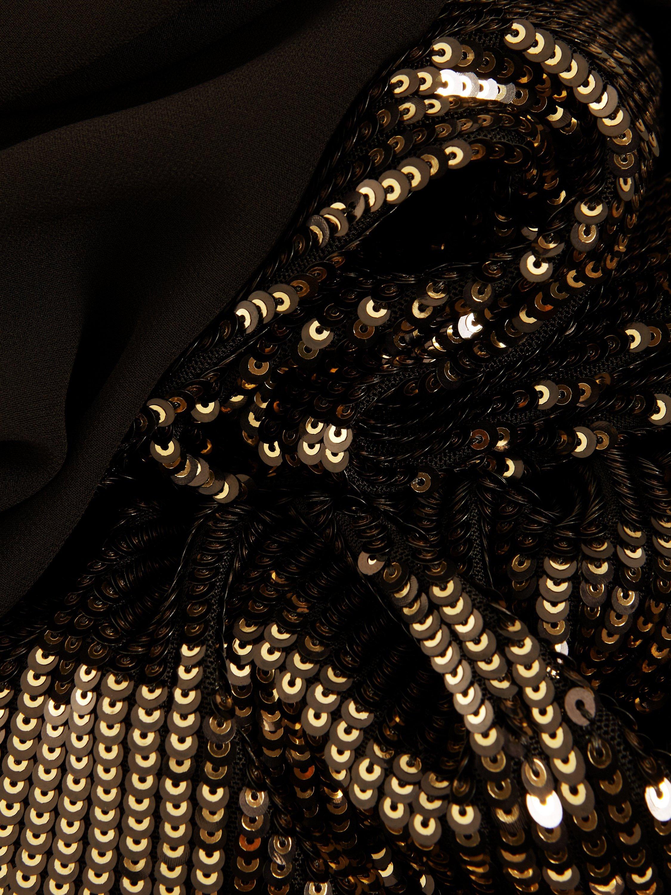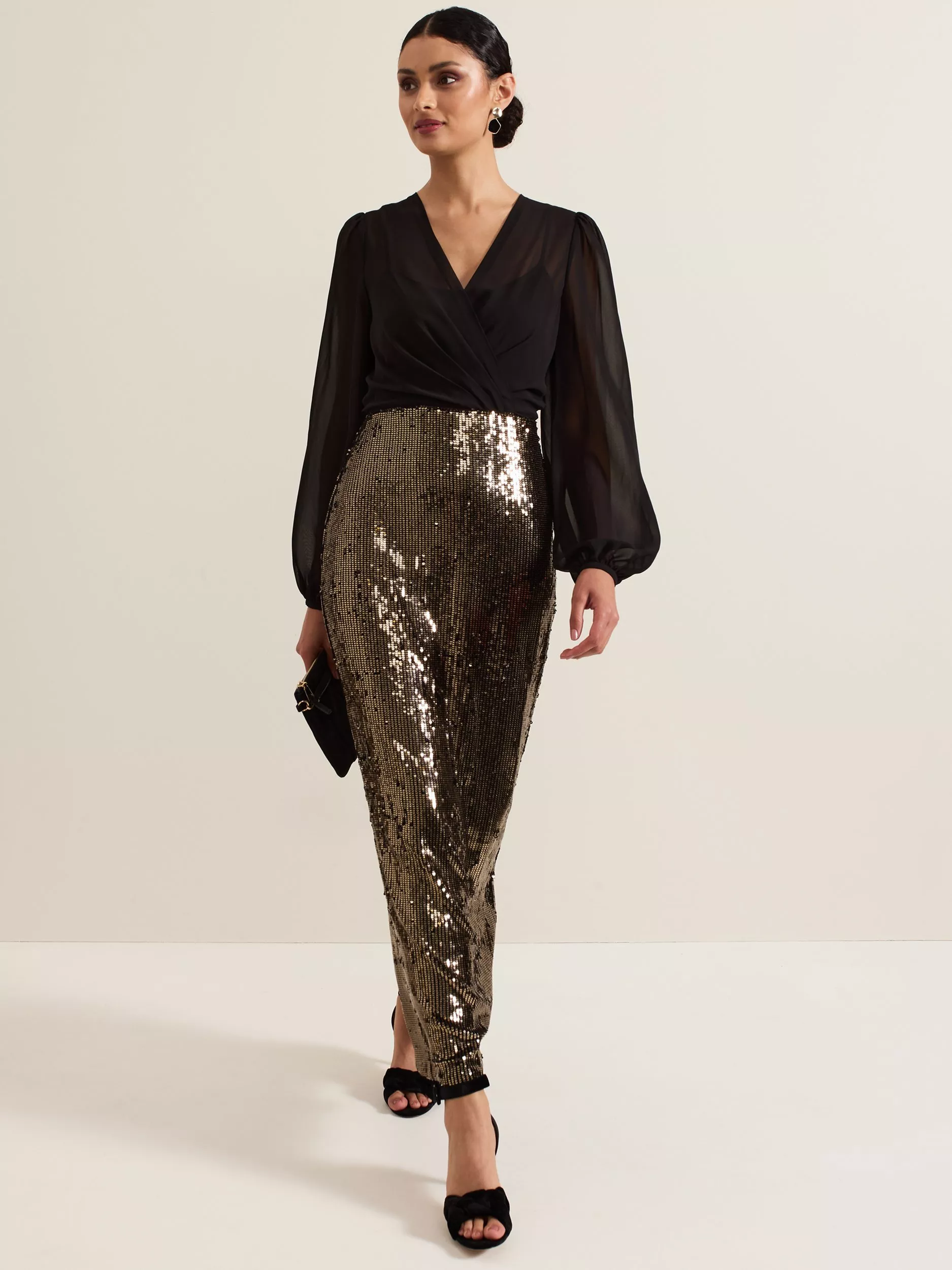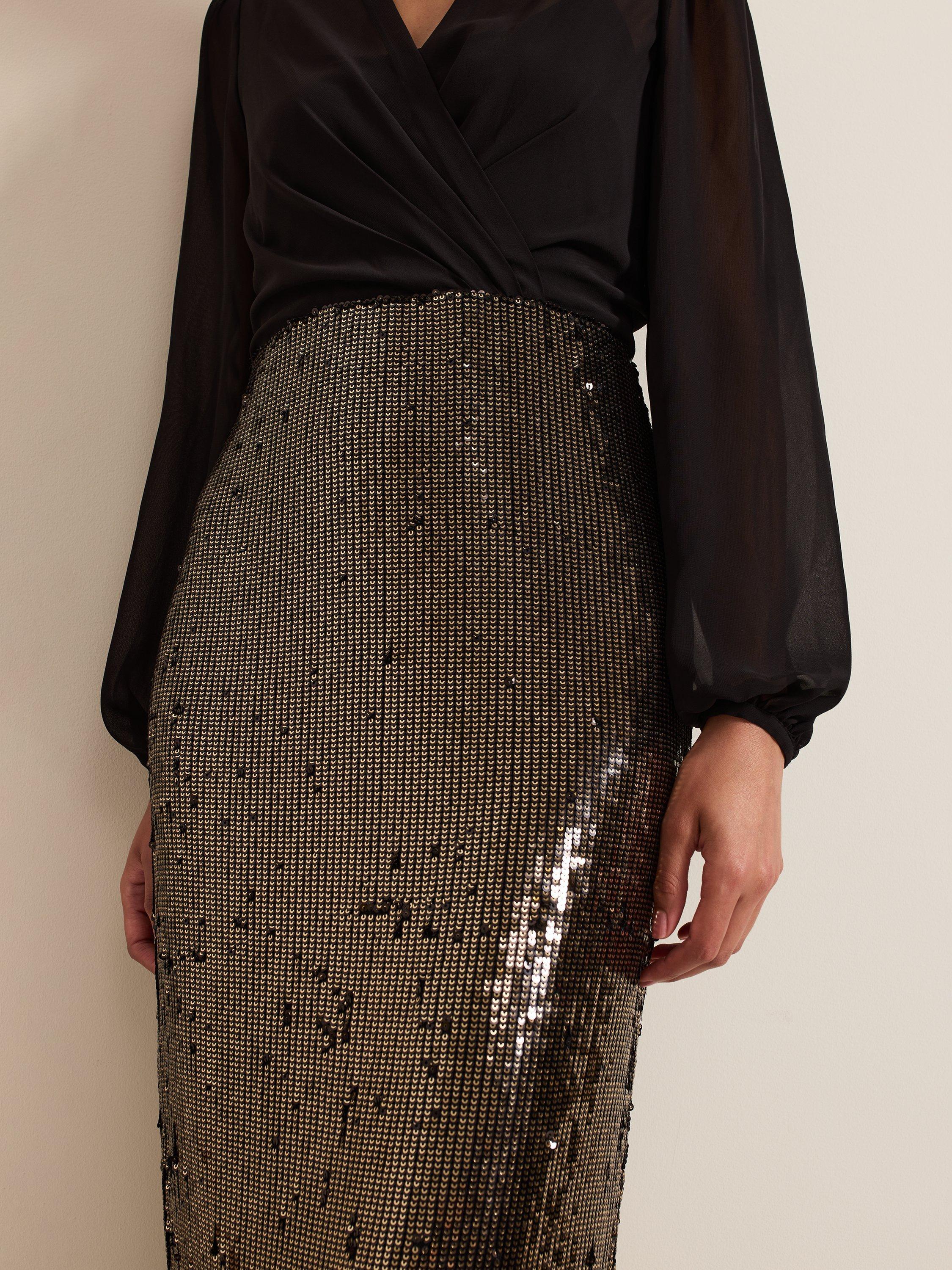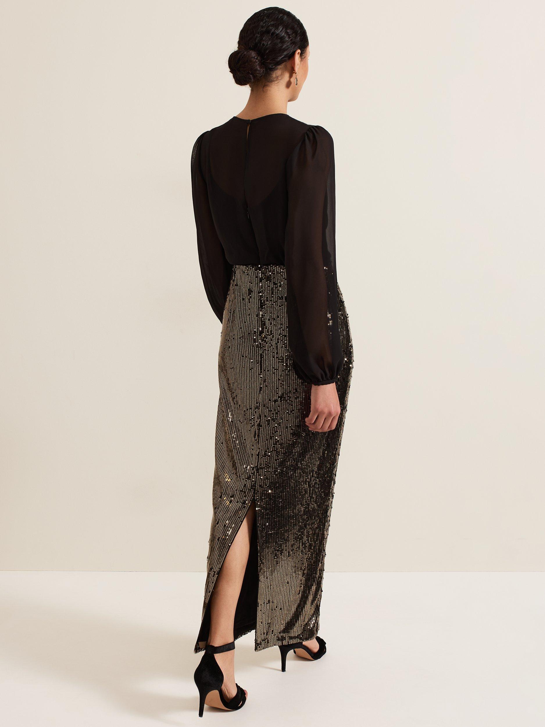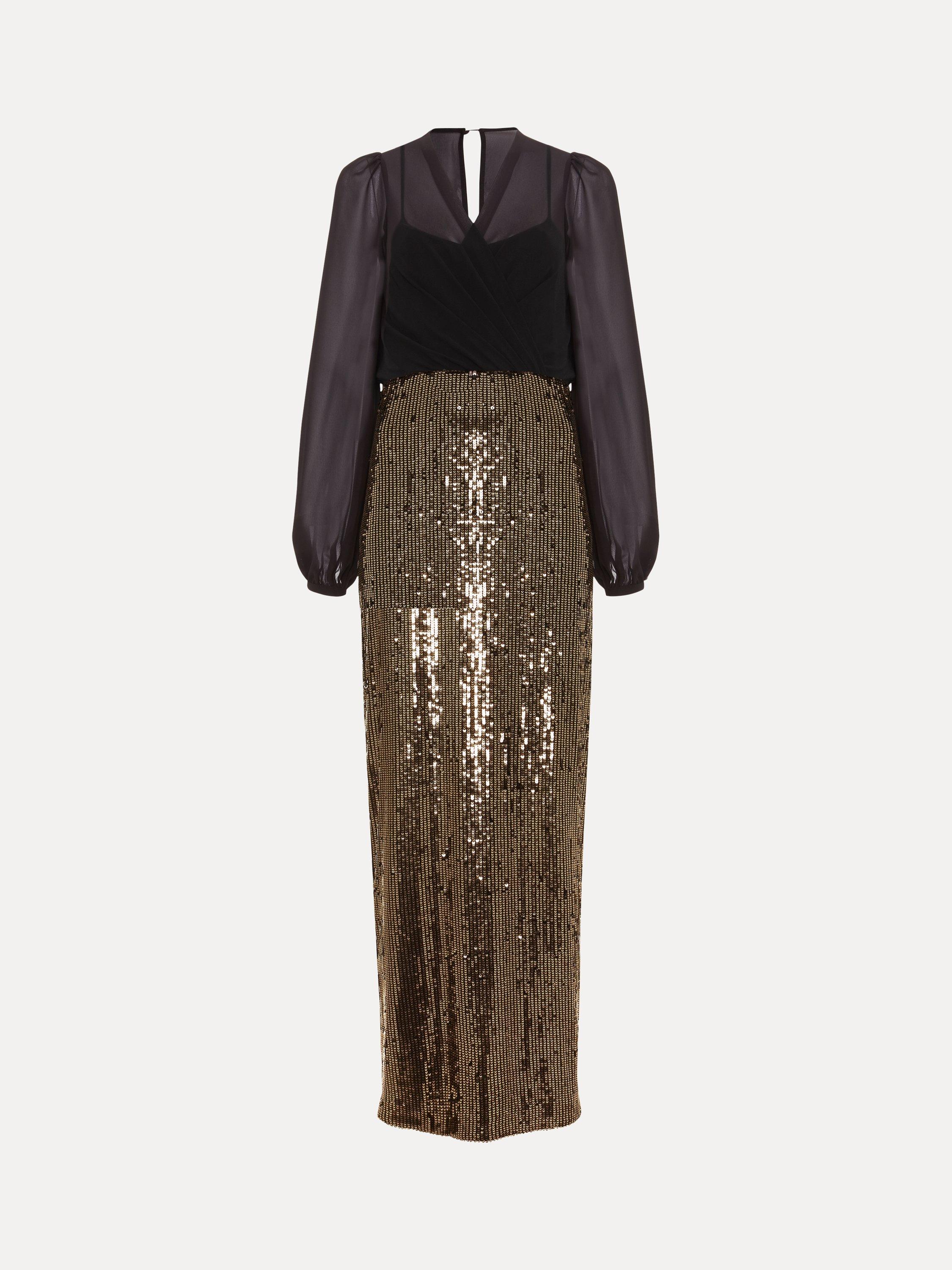Say hello to your new statement occasion dress. Designed with a semi-sheer faux wrap bodice, a feminine V-neckline and long blouson sleeves, the Aniya dress falls to a column maxi skirt fully embellished with gold sequins for added glamour.