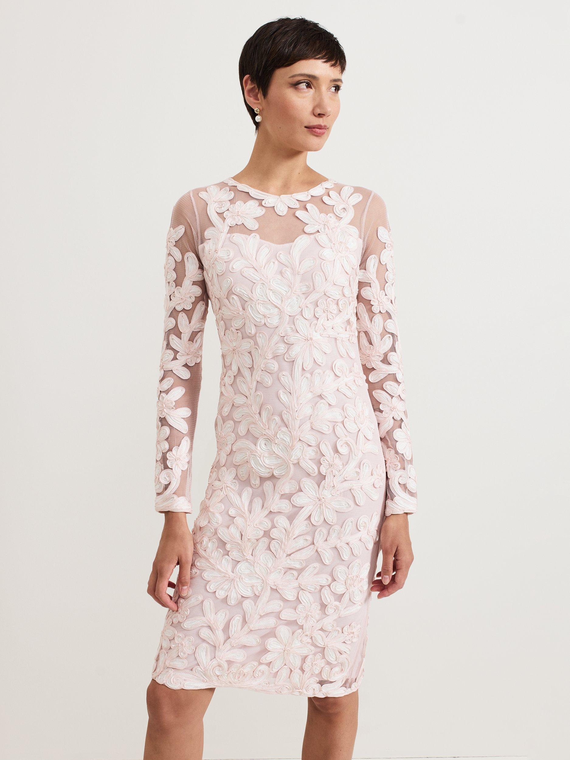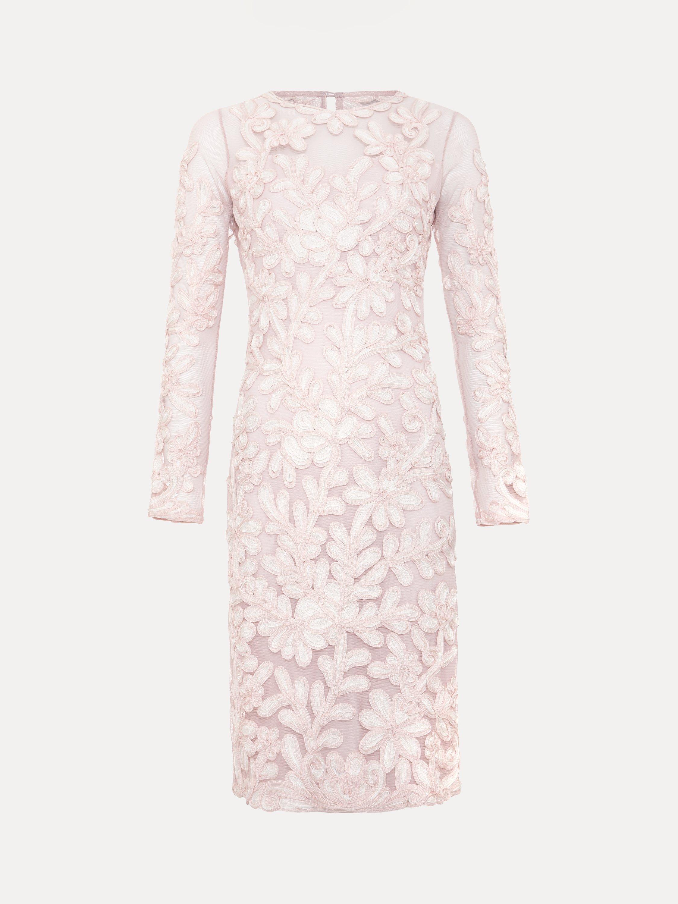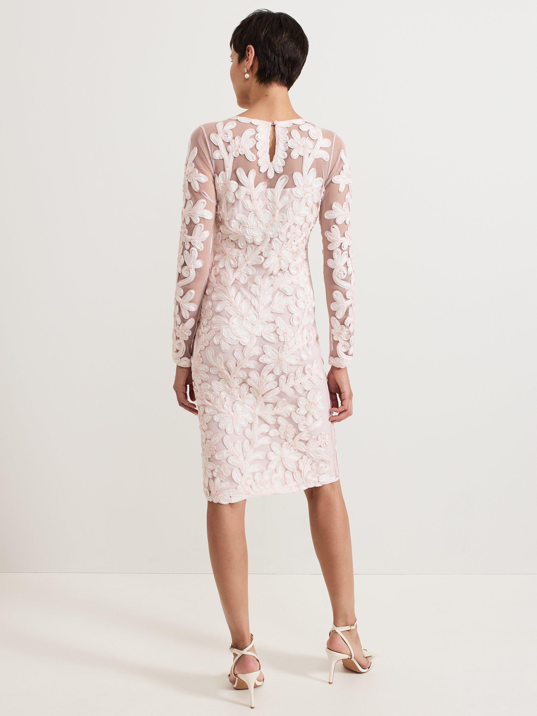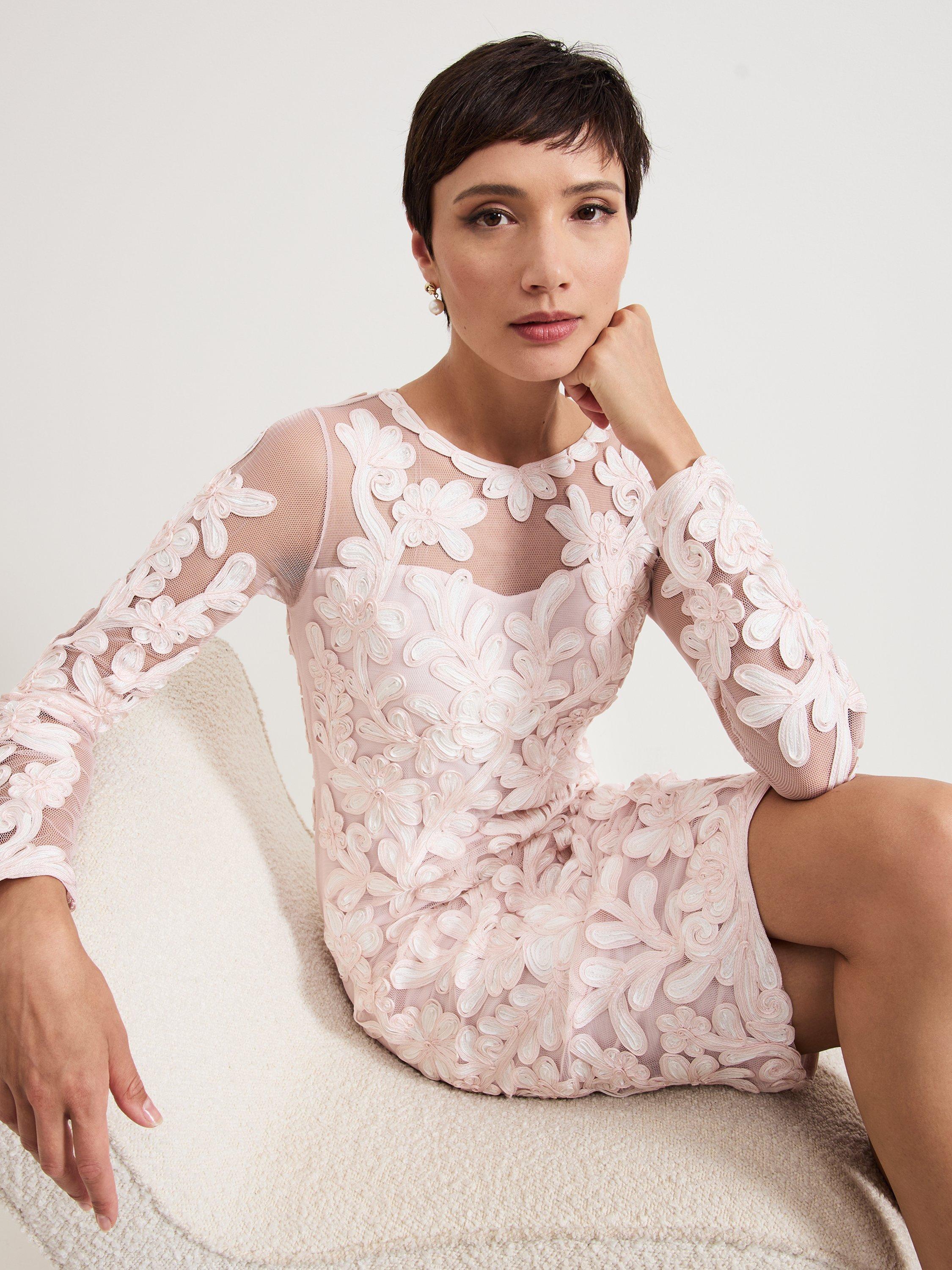 The Annika dress is a refined event style. Featuring a semi-sheer yoke and sleeves, this dress is decorated with signature tapework lace. Falling just above the knee the column silhouette skims the body to flatter your figure. We style ours with matching ivory accessories for a sophisticated look.