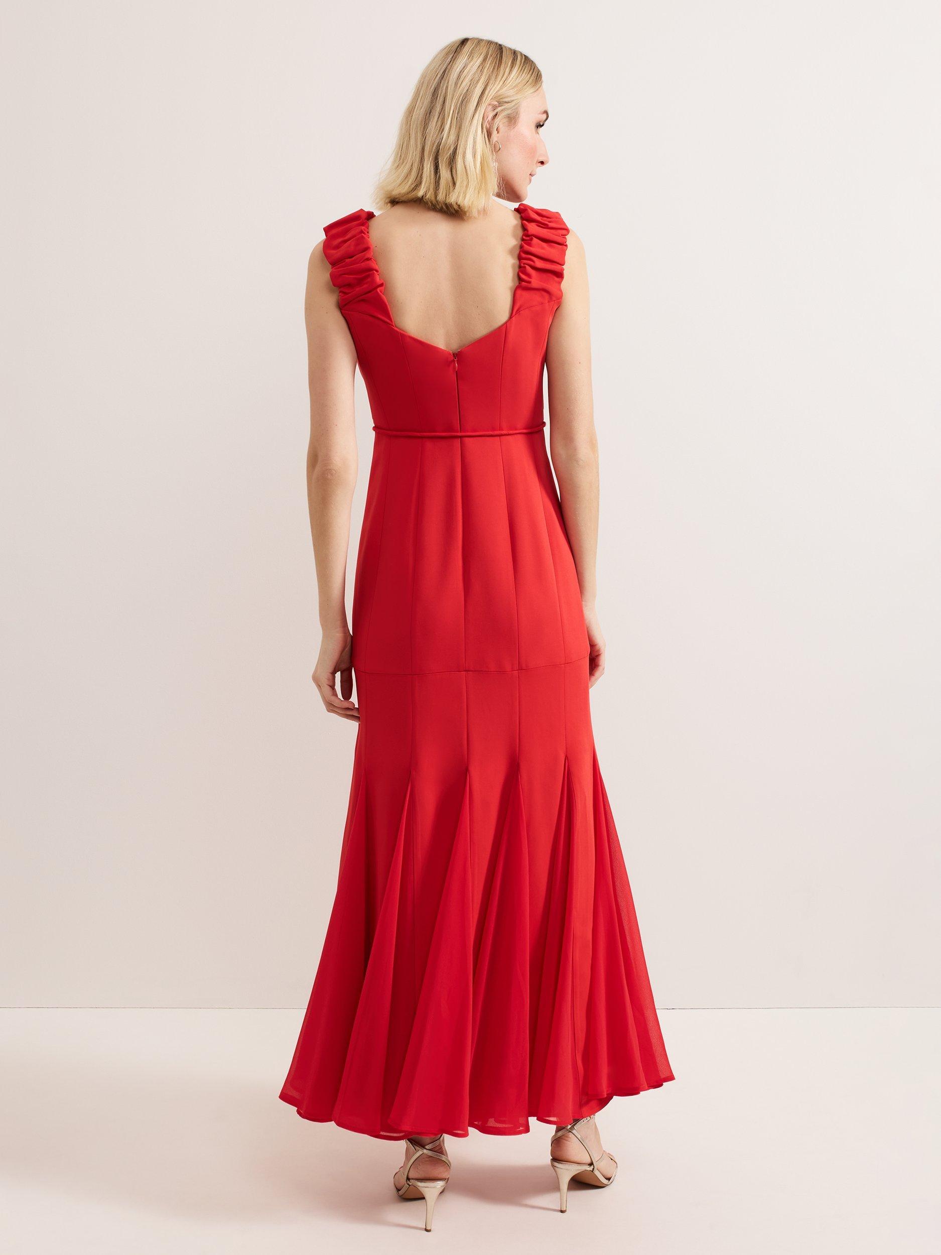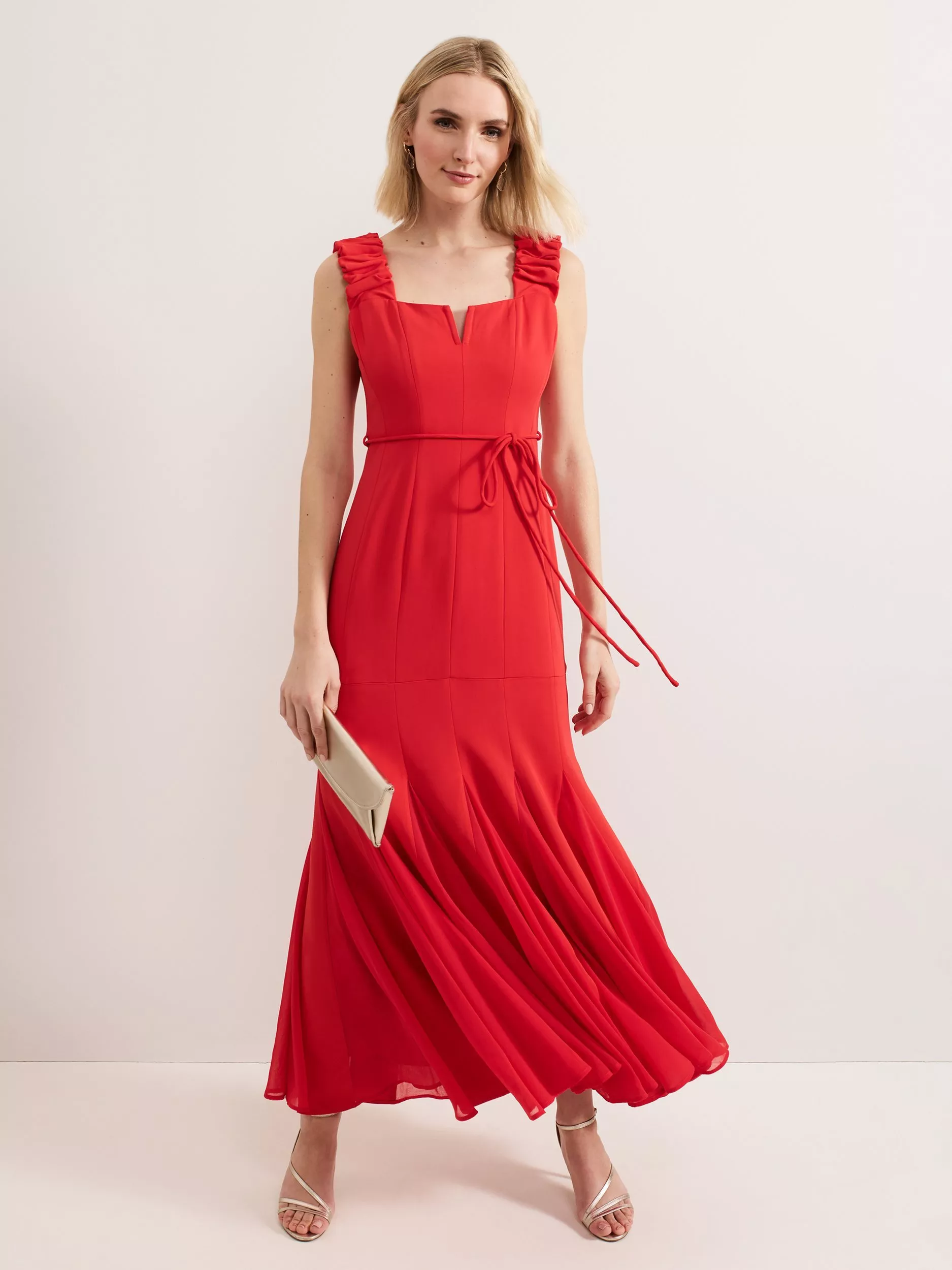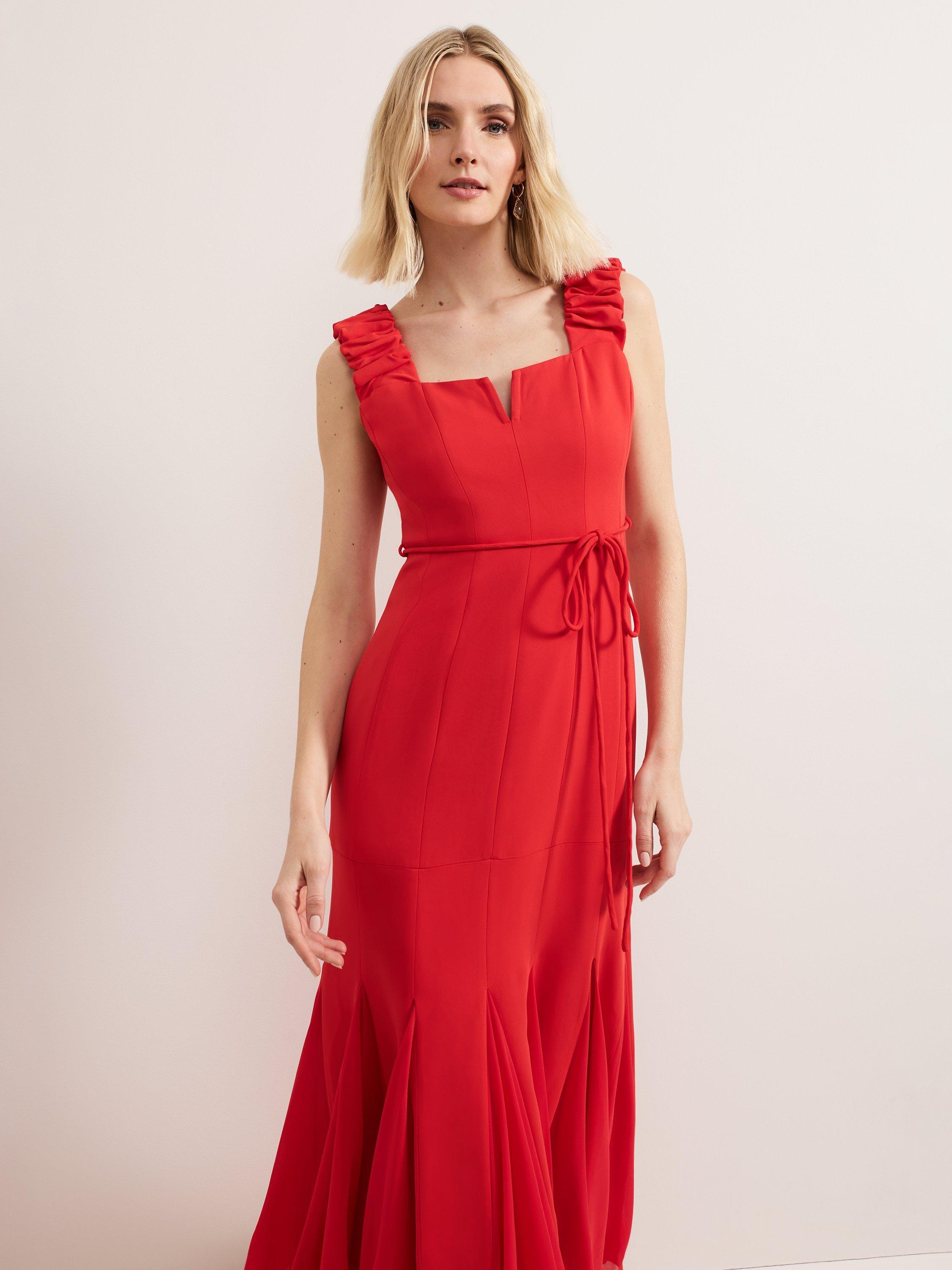 In a flattering fit that accentuates the waist, this floor-length dress from Phase Eight is blended with viscose for a weightless feel. With a square neckline, ruffle detailed wide straps and box pleats through the hem, this sleeveless style is minimally detailed for endless wearability whatever the occasion.
