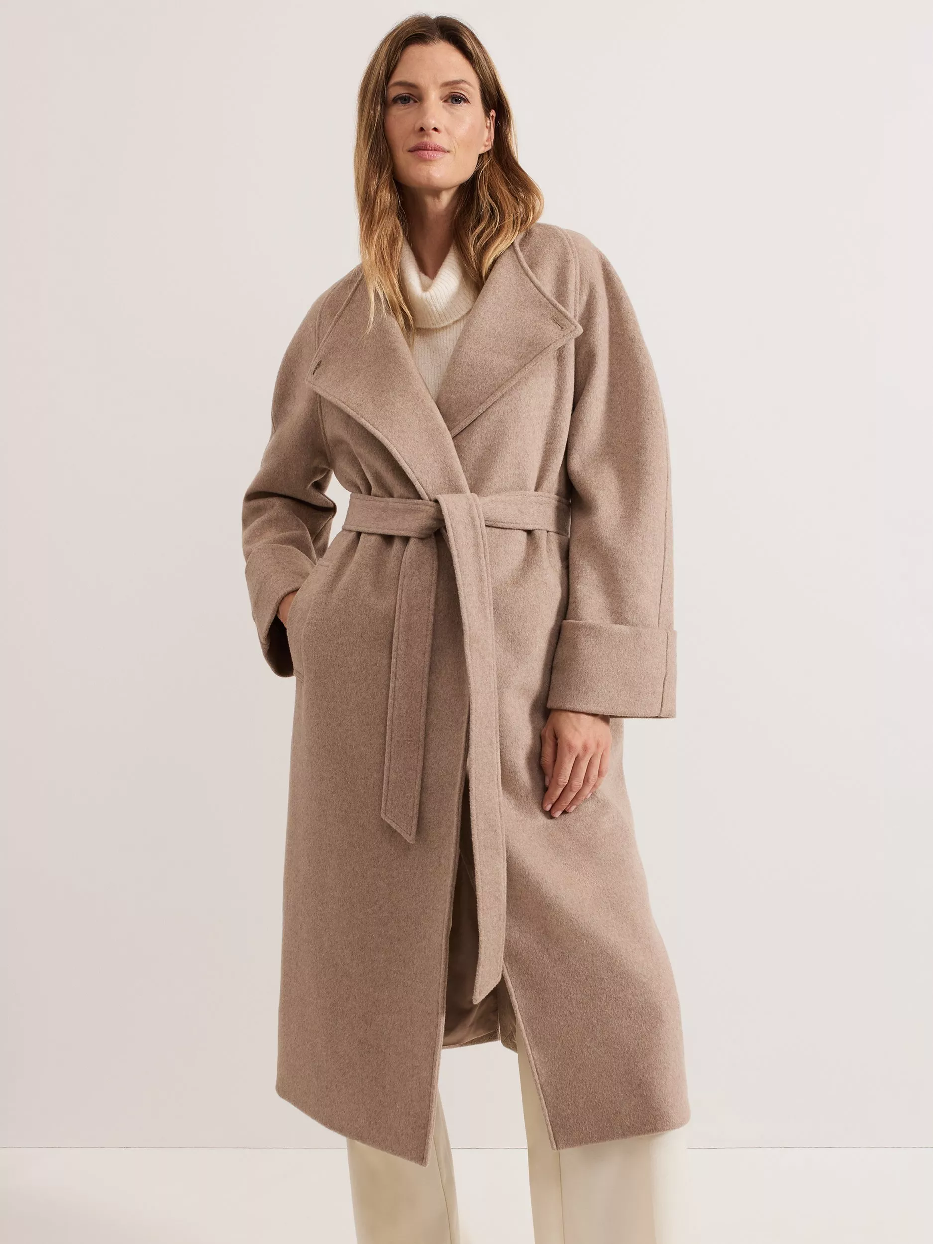 Designed in a classic neutral shade, this wrap coat will take you through the cold season, year after year. Featuring exaggerated lapels that can be worn open or fully done up, it fastens with a matching button at the collar whilst the soft rounded shoulders create a soft silhouette. The turnover cuffs and tie belt make this the perfect chic coat to add to your forever wardrobe.