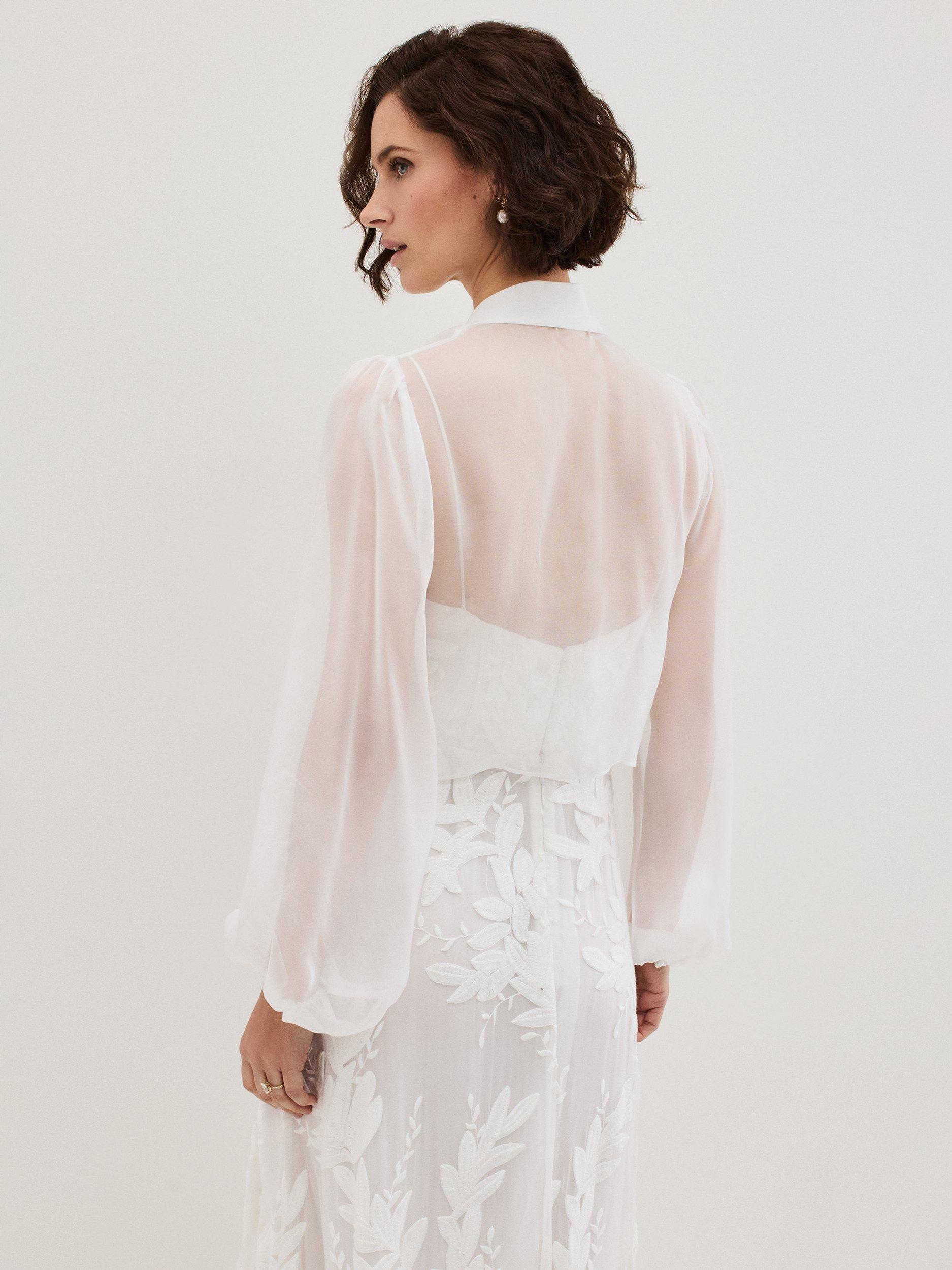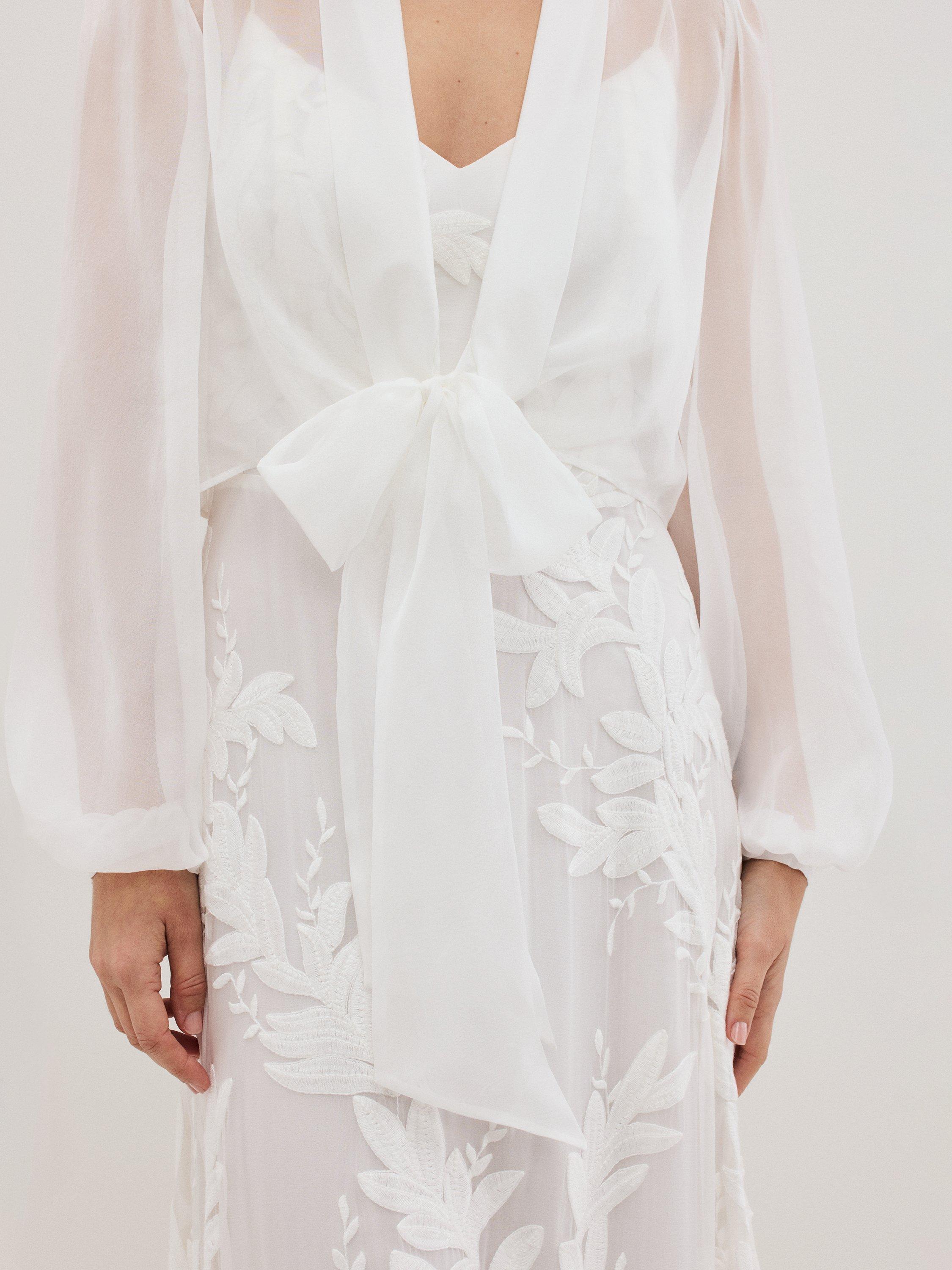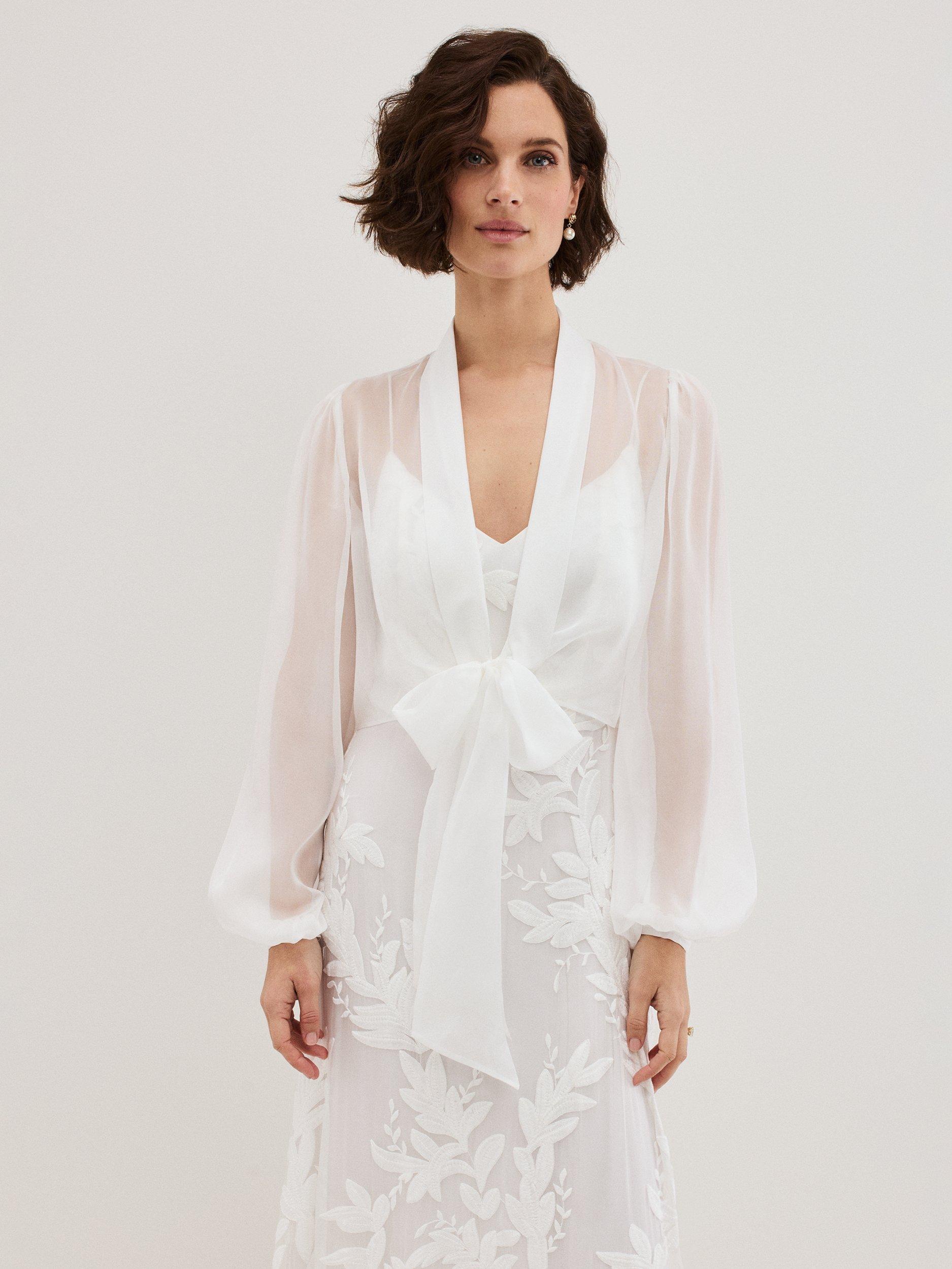 Finish your bridal look with the Arabella cover up, crafted from luxurious silk. Designed with blouson sleeves, our semi-sheer cover up ties with an elegant bow.