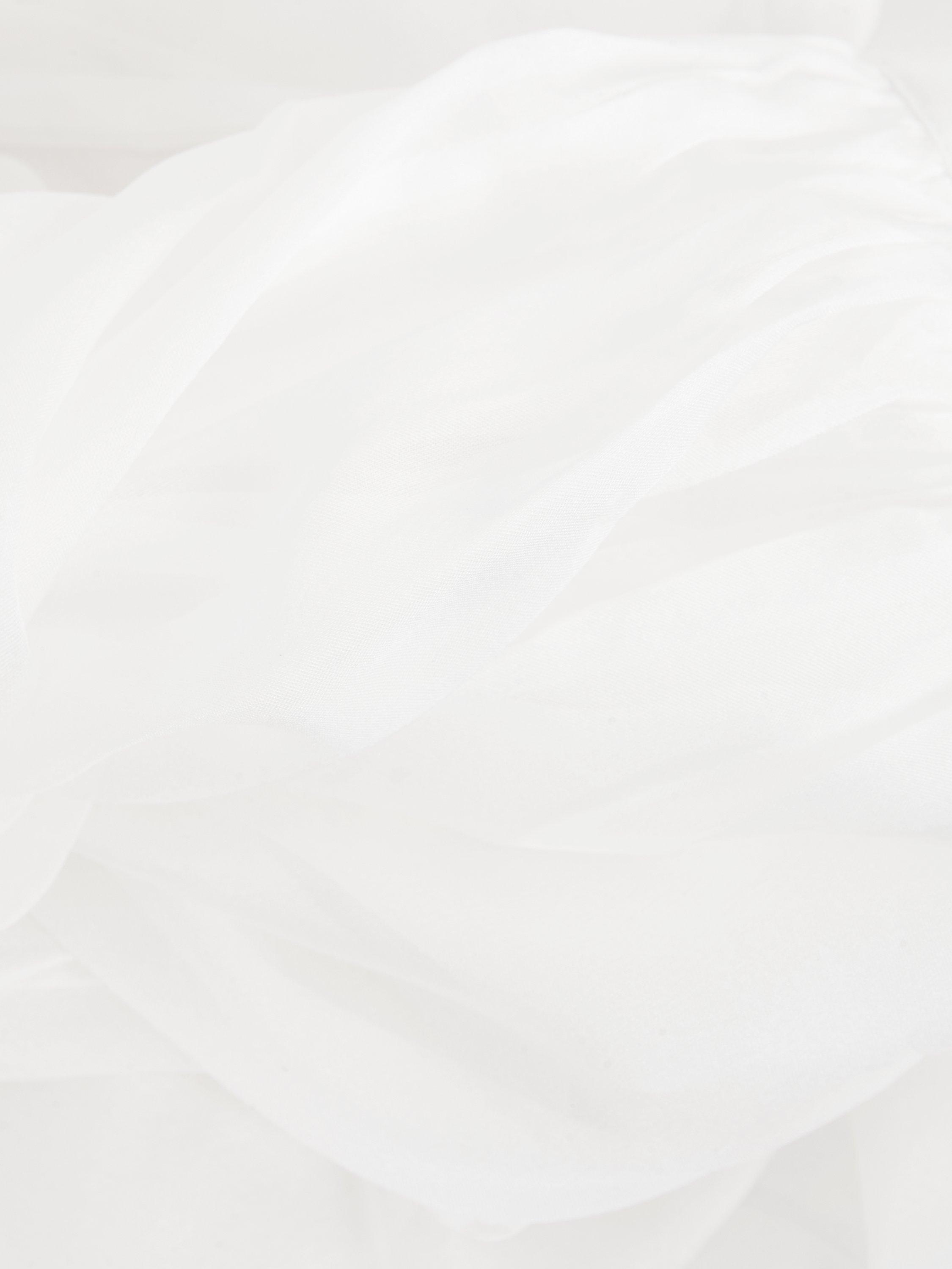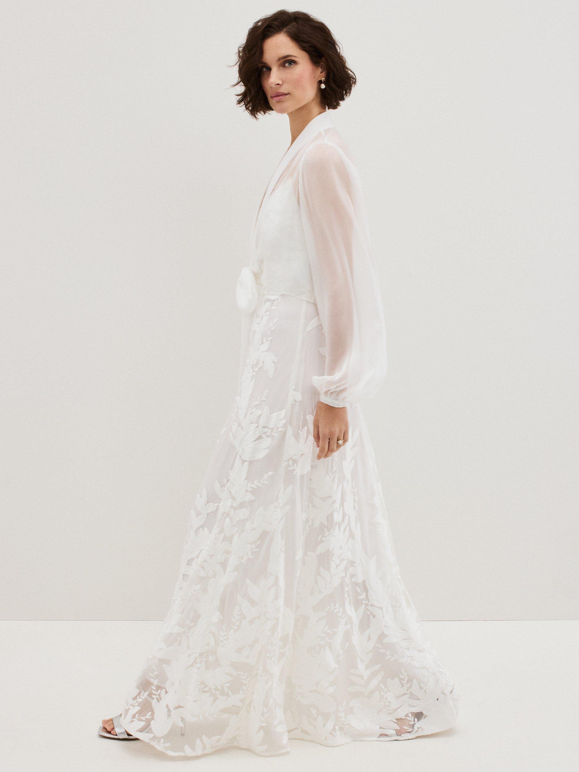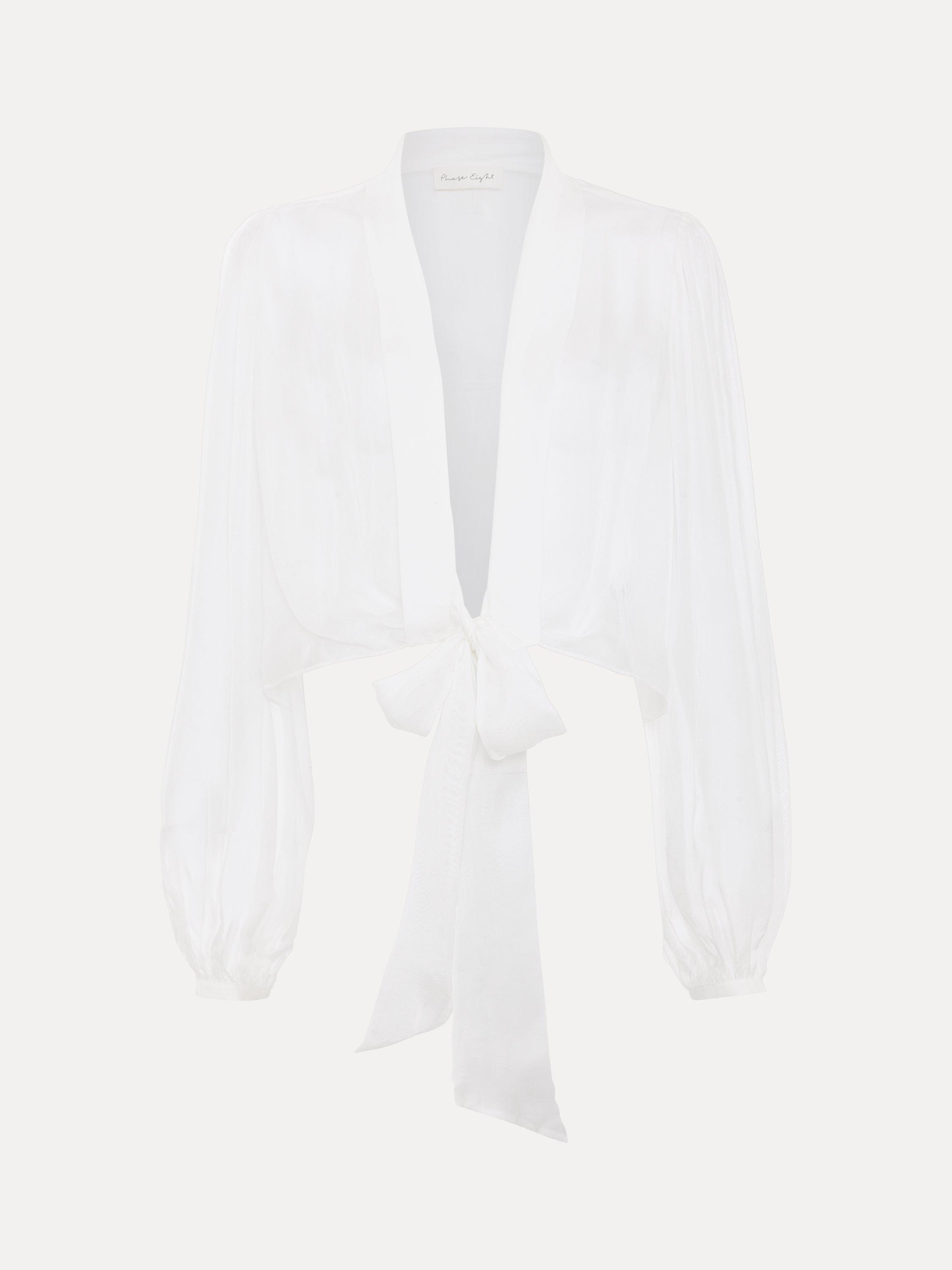 Finish your bridal look with the Arabella cover up, crafted from luxurious silk. Designed with blouson sleeves, our semi-sheer cover up ties with an elegant bow.