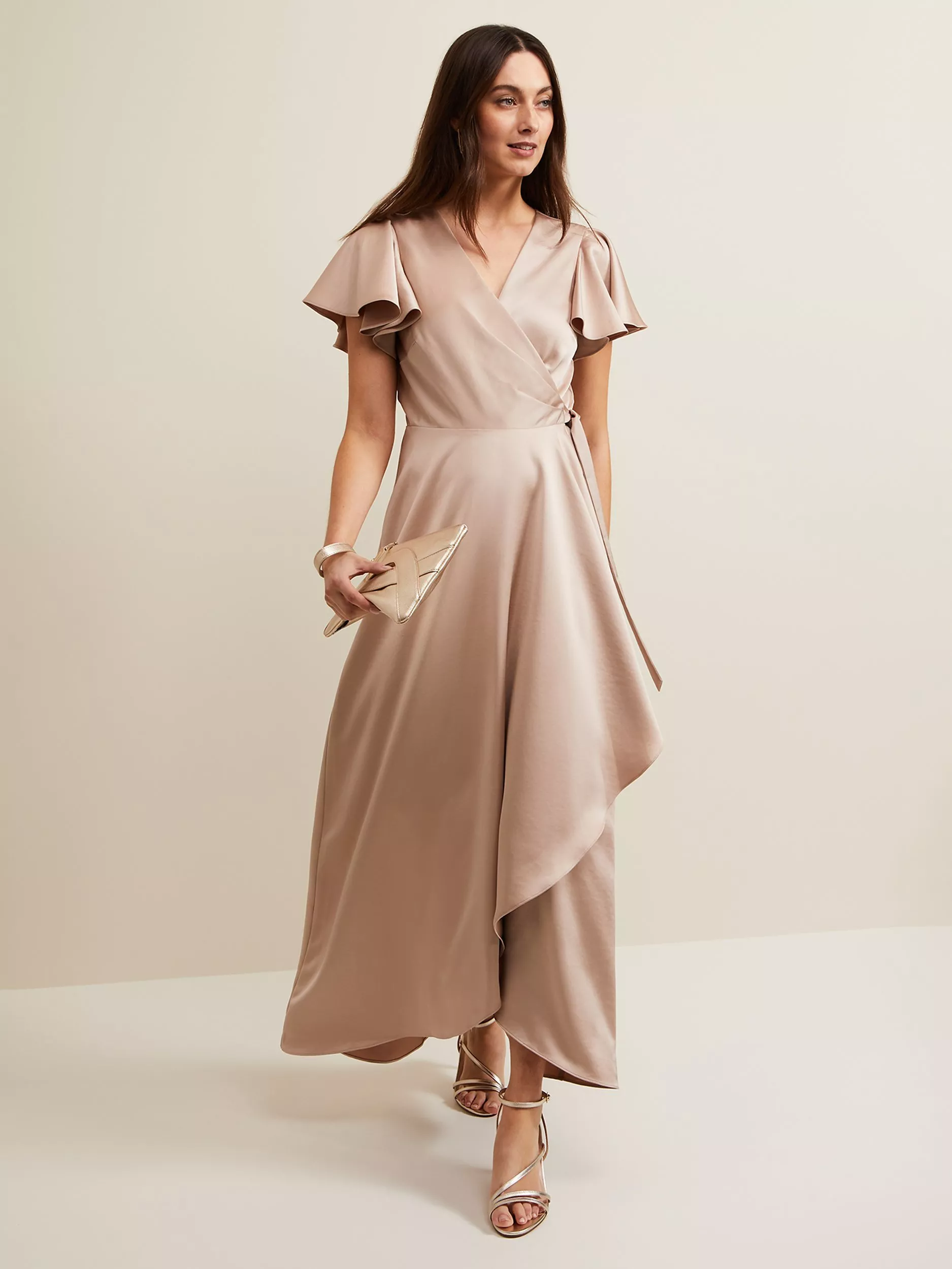 Add this style to your event wardrobe. Crafted from satin, the Arabella dress from Phase Eight features a wrap style bodice short sleeves with ruffle detailing and falls to a flowing silhouette with a cascading asymmetric hem. Wear with heels to your next special event.