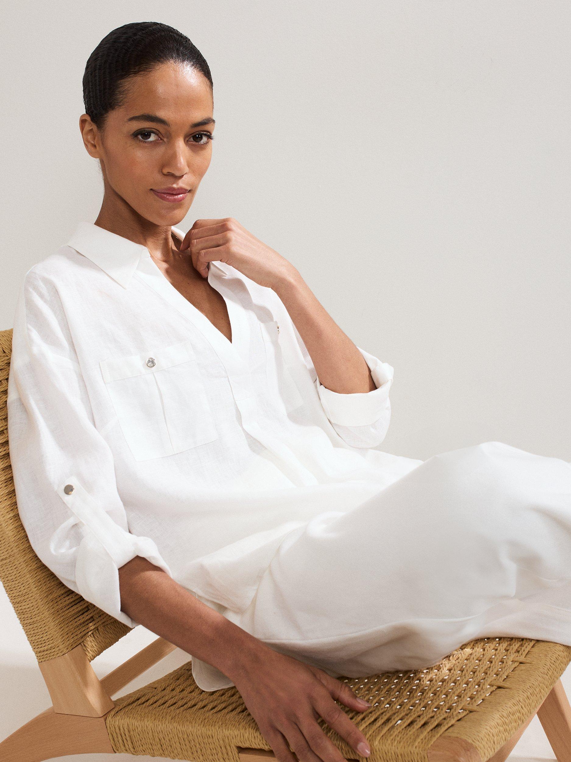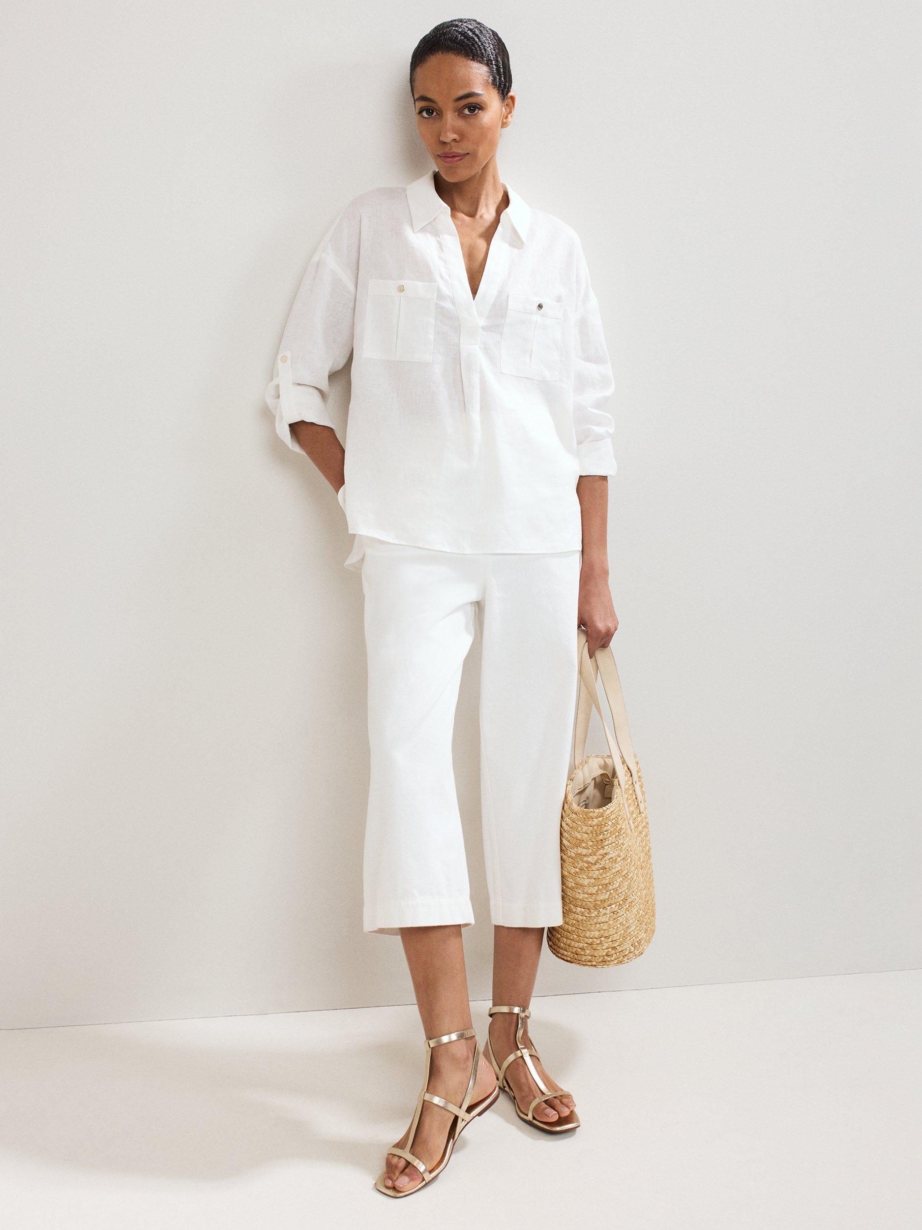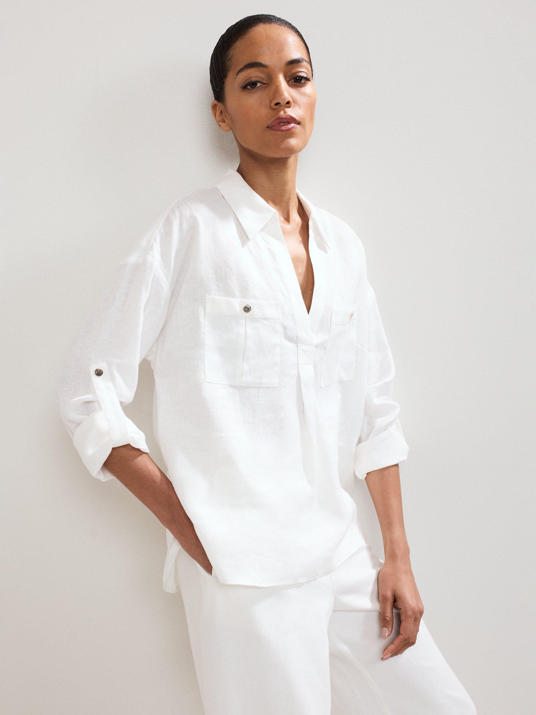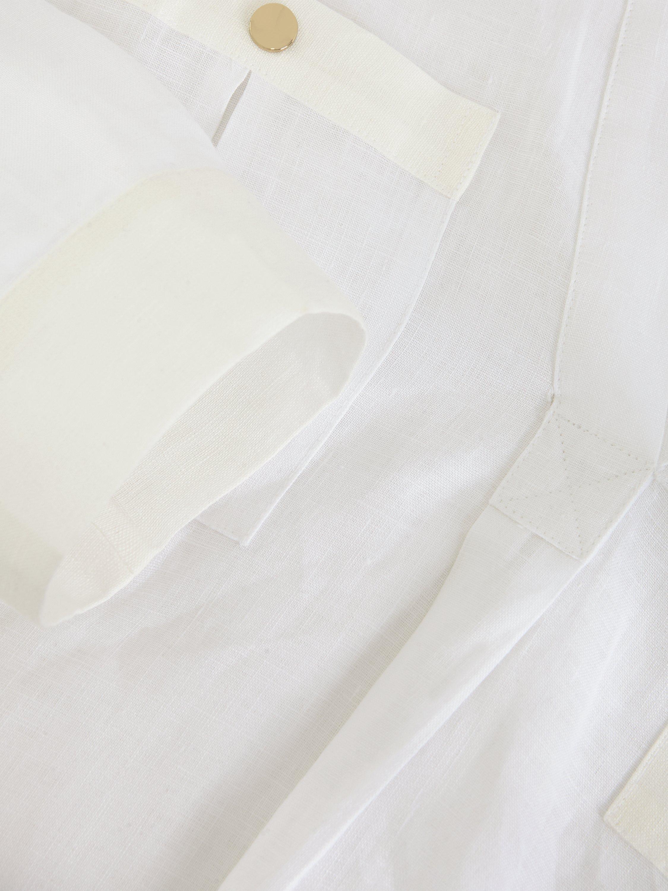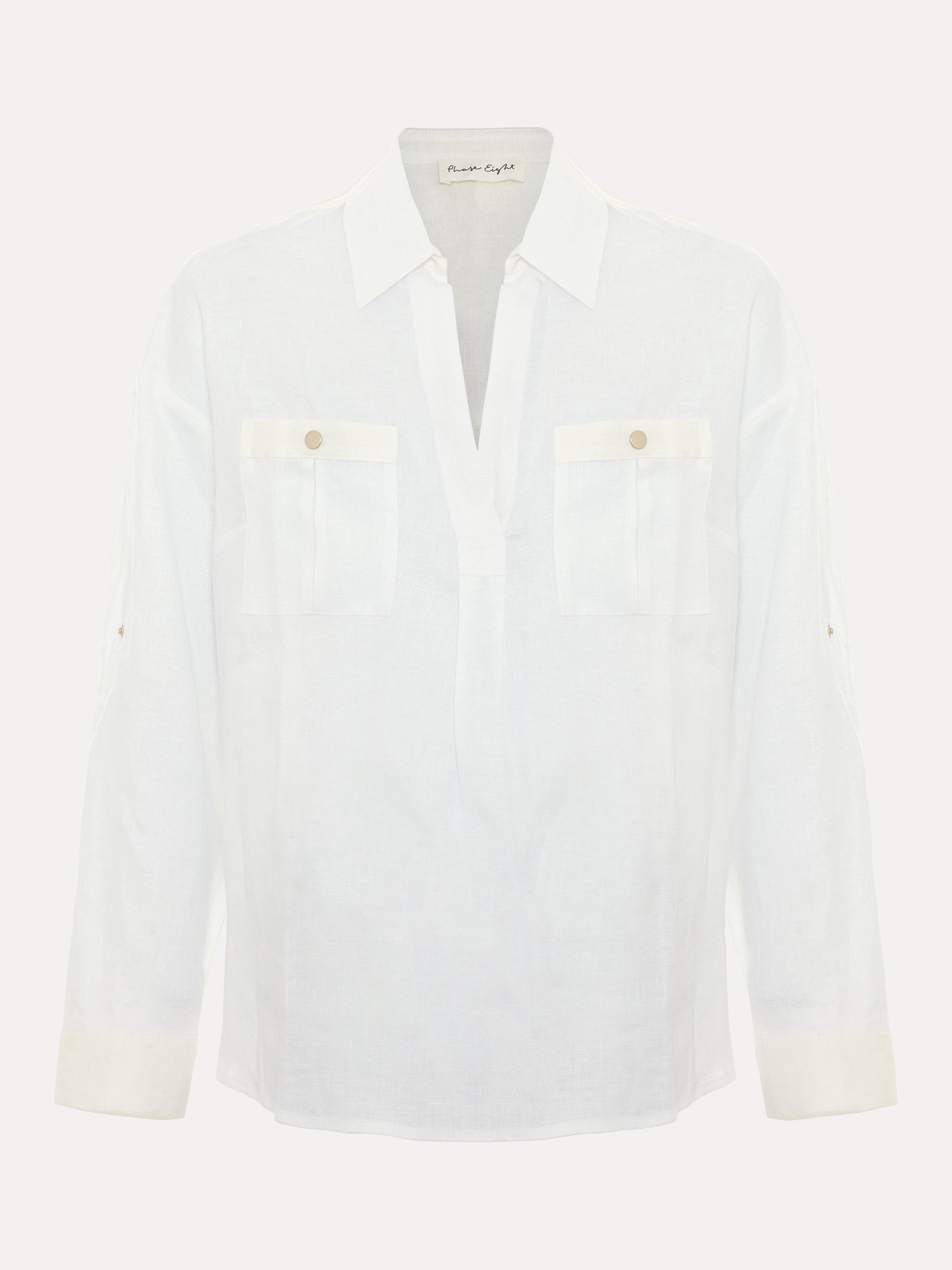 This effortless linen shirt will become a staple in your wardrobe. The classic shirt silhouette is updated with patch pockets and button detailing on the arms for versatile styling options. Crafted from 100% linen, designed to minimise creasing, this style is perfect for warm summer days.