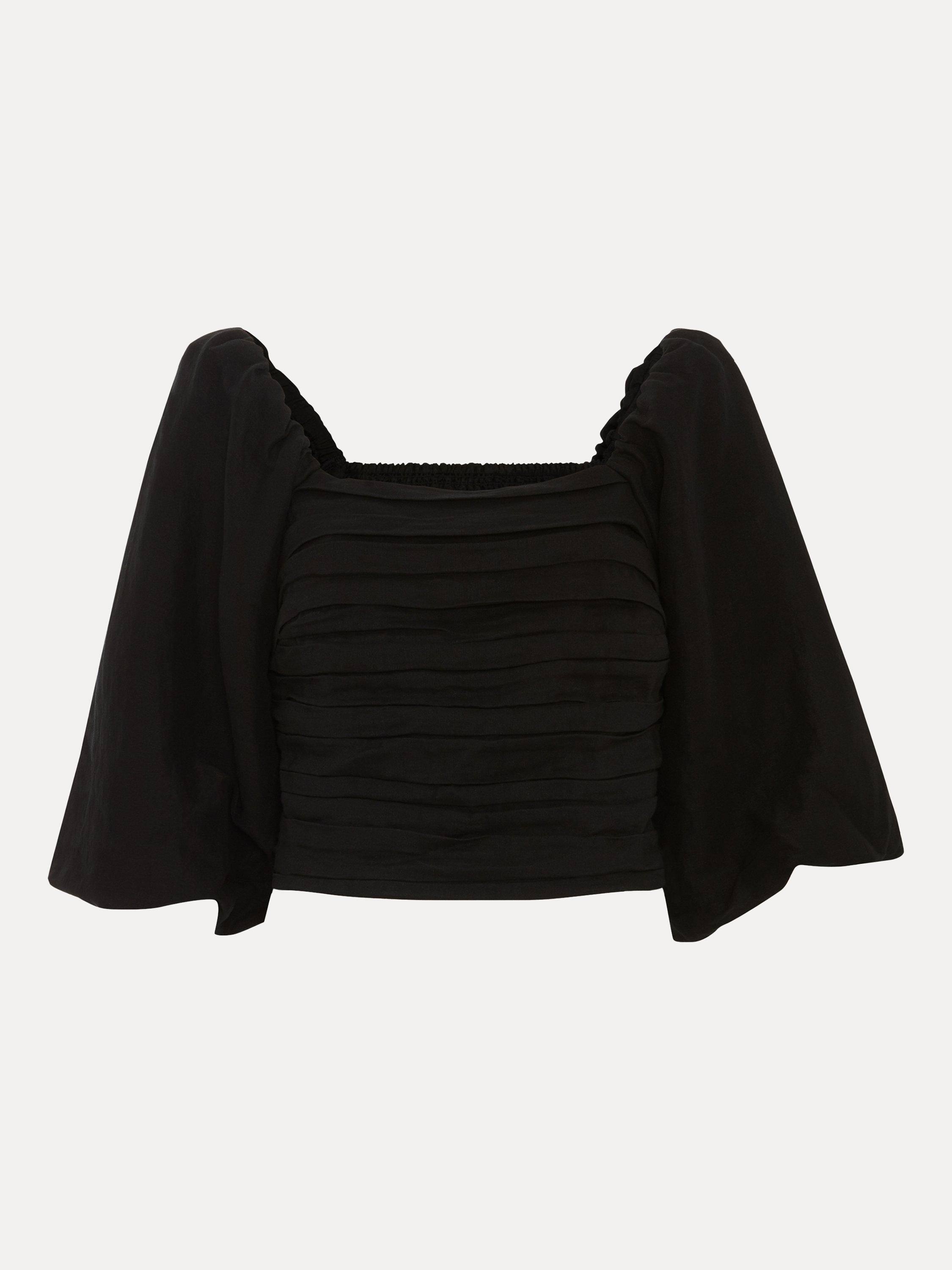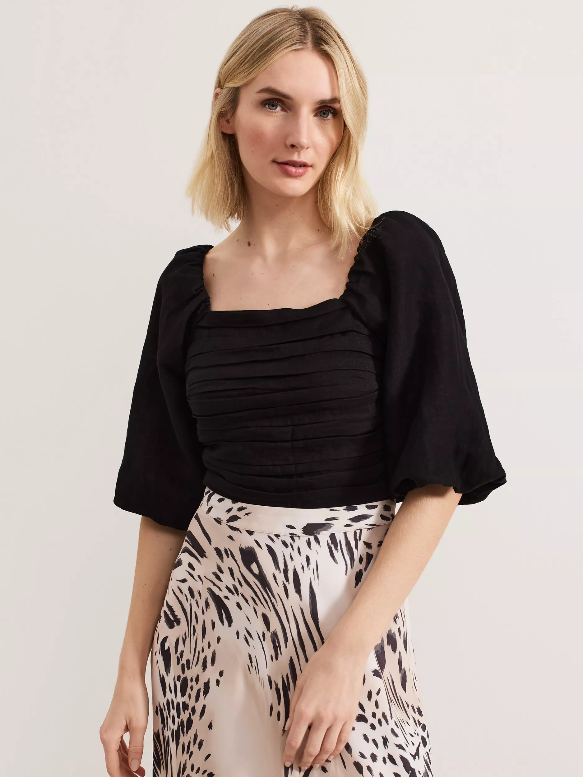 Designed for day to night versatility, this linen rich top is a must-have in your wardrobe. Ruching at the bodice and the shirred back ensure a flattering fit whilst exaggerated puff sleeves add volume to the silhouette. For versatile outfitting, wear as a bardot style for a contemporary look.