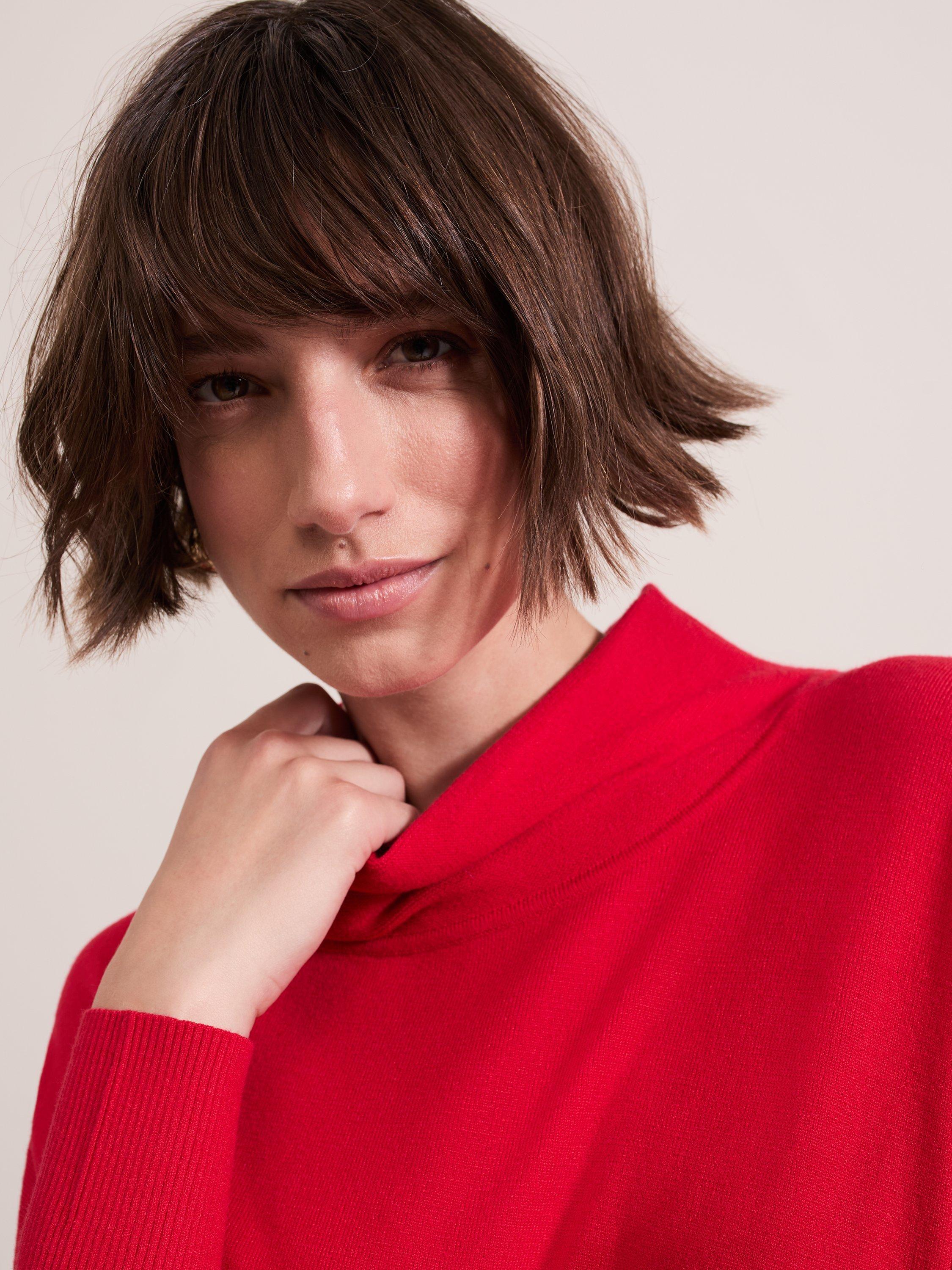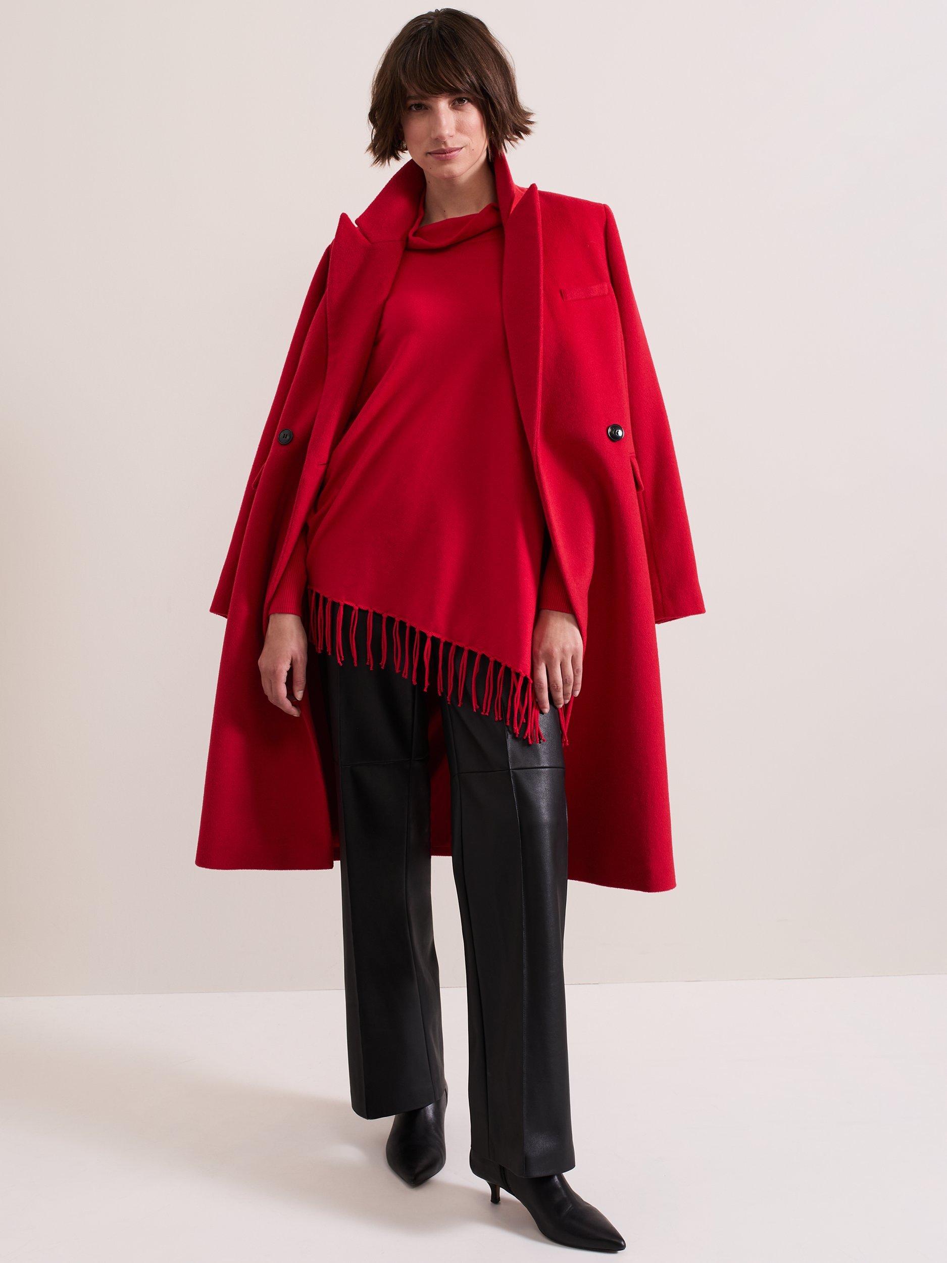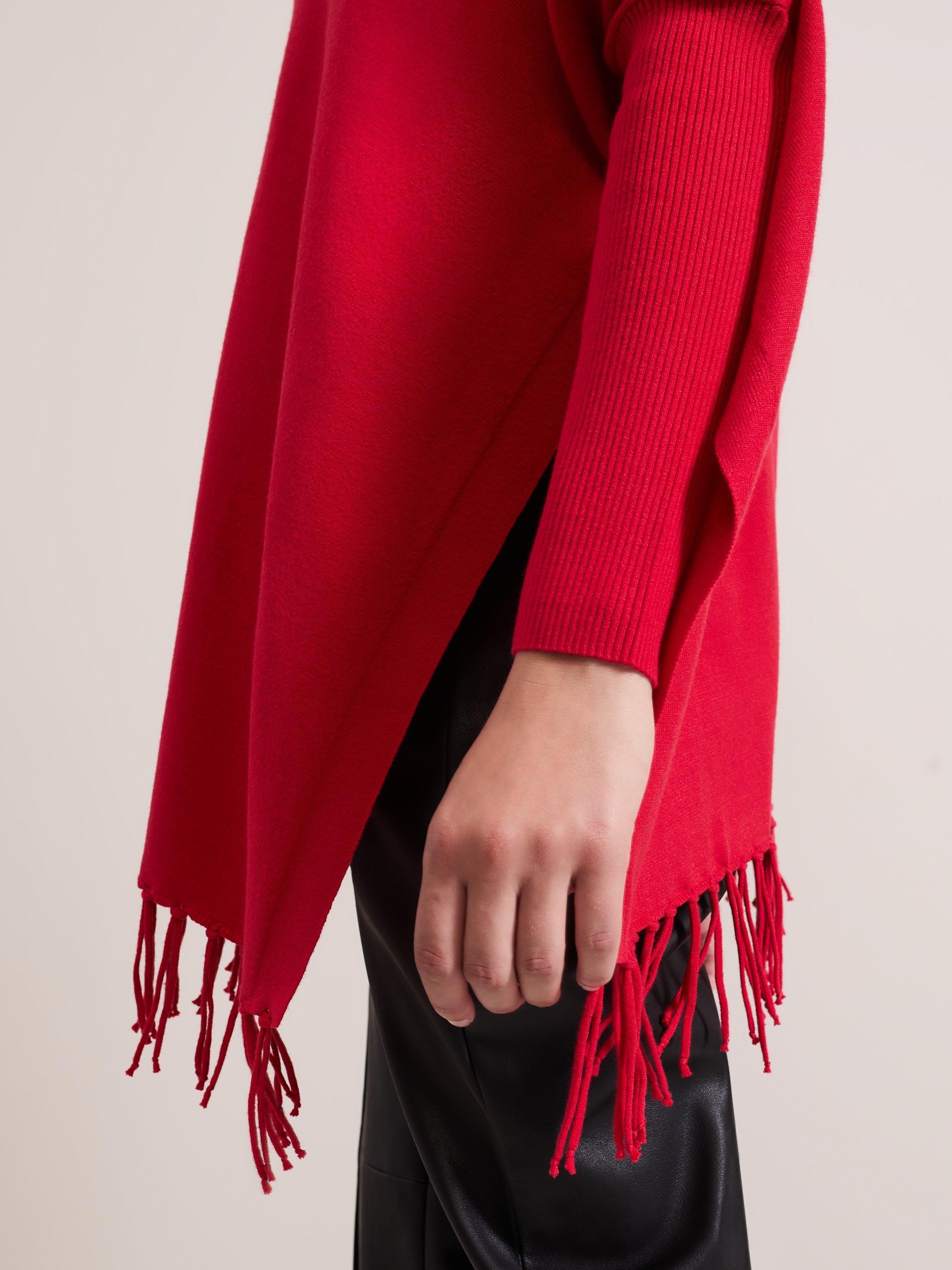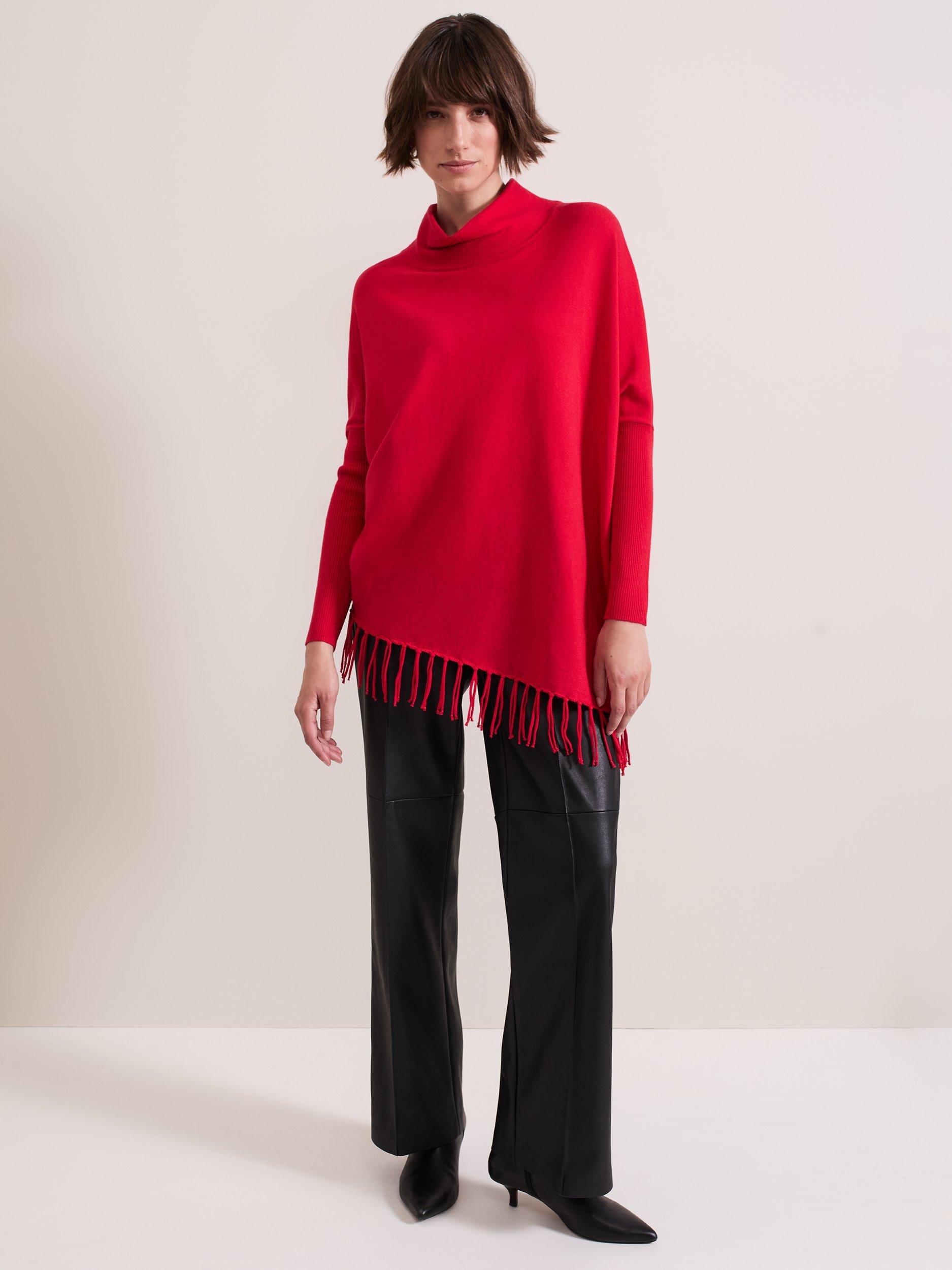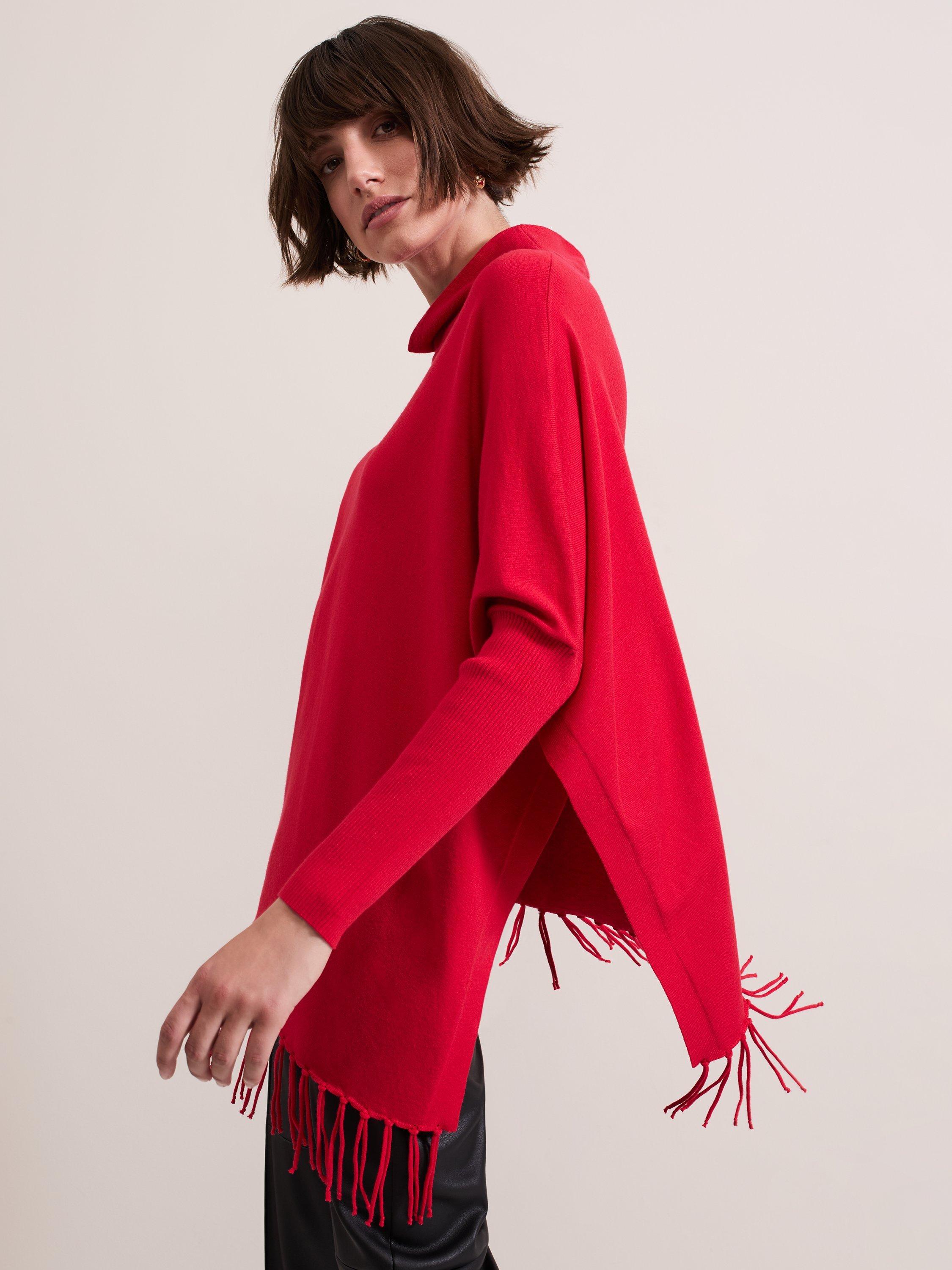 Designed in a vibrant colour the Athena knit is poncho inspired and features an asymmetric split hem with fringe detailing. The soft cowl neck and skinny sleeves create the perfect statement outerwear essential.