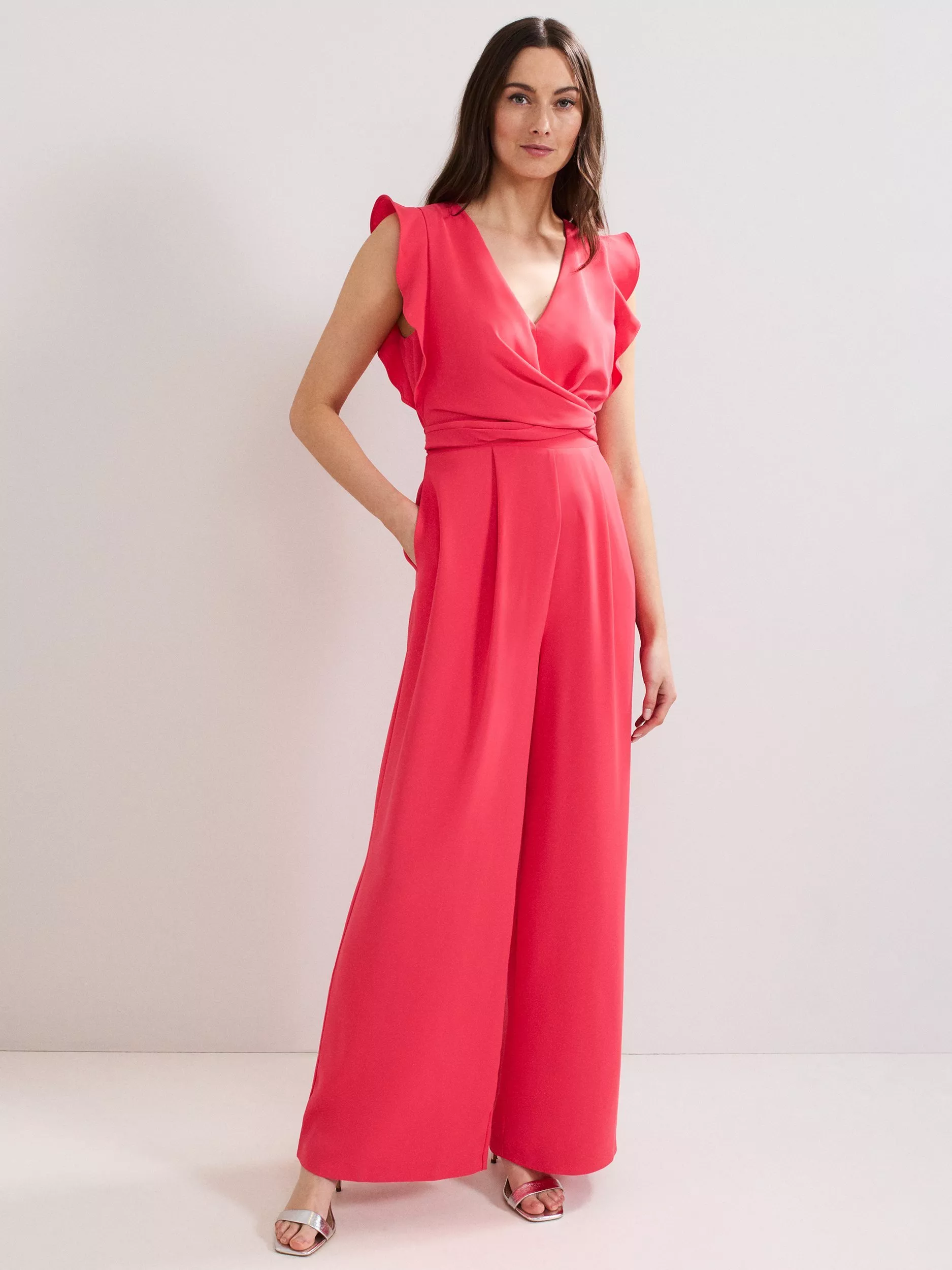 The Ayla jumpsuit from Phase Eight arrives is ideal for summer events. The V-neckline is framed by frill detailing, falling to an easy to wear wide leg silhouette. Finished with a bow detail at the back.