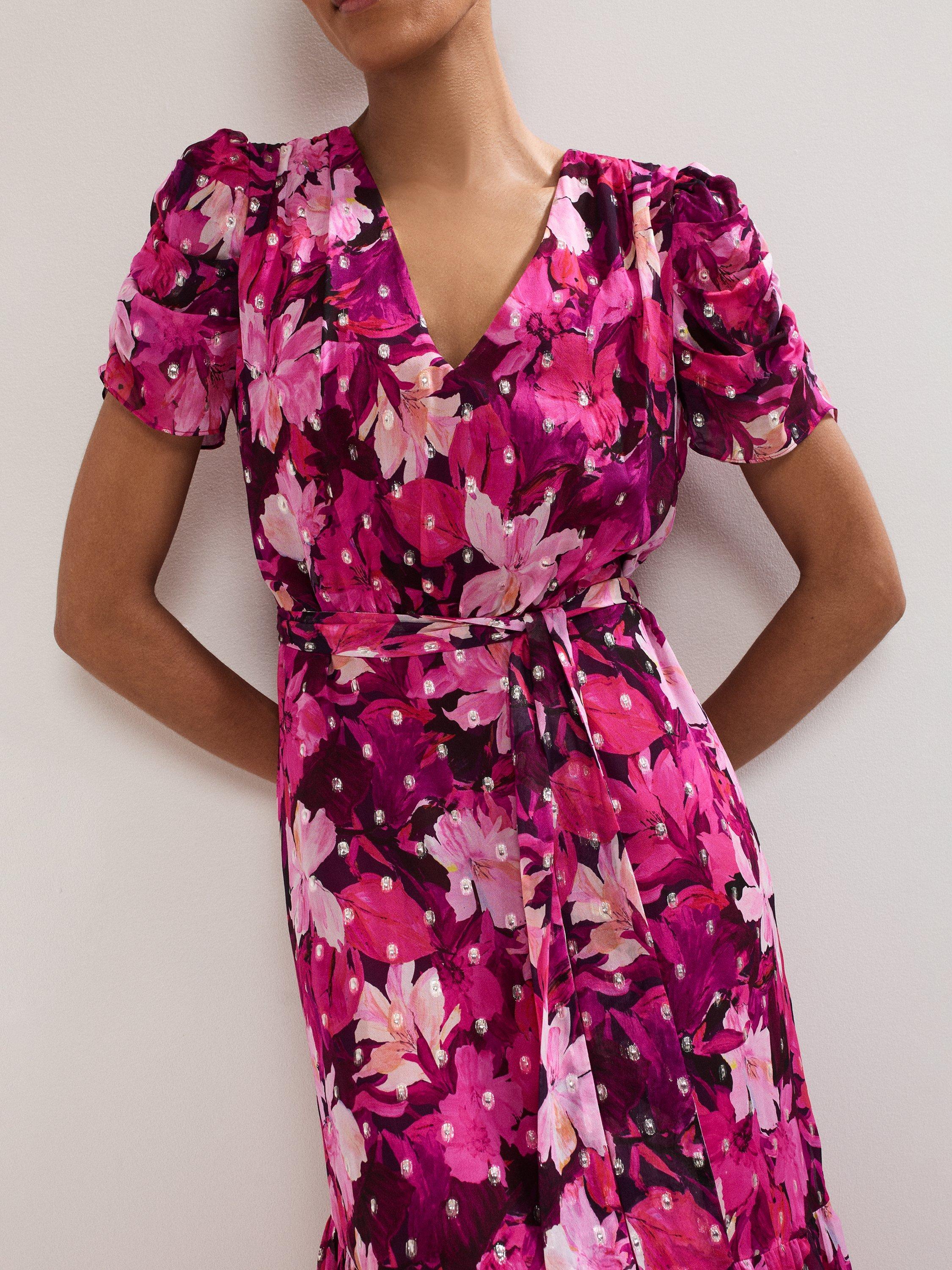 This floral midi dress is the perfect style for taking you from day to night. With a feminine V neckline, tie belt and classic skirt defining elegance and versatility. Style with your favourite trainers for the daytime then switch to heels for a polished evening look.