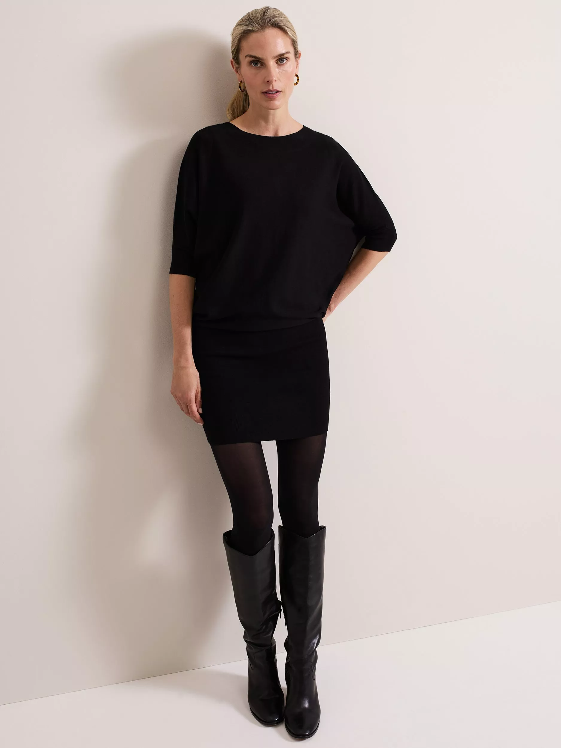 Designed with a ribbed tight knit bodycon skirt and a relaxed fitting jumper top, the knitted Becca dress features cropped sleeves and a feminine slash neck for the elegant style that is the perfect addition to your capsule wardrobe.