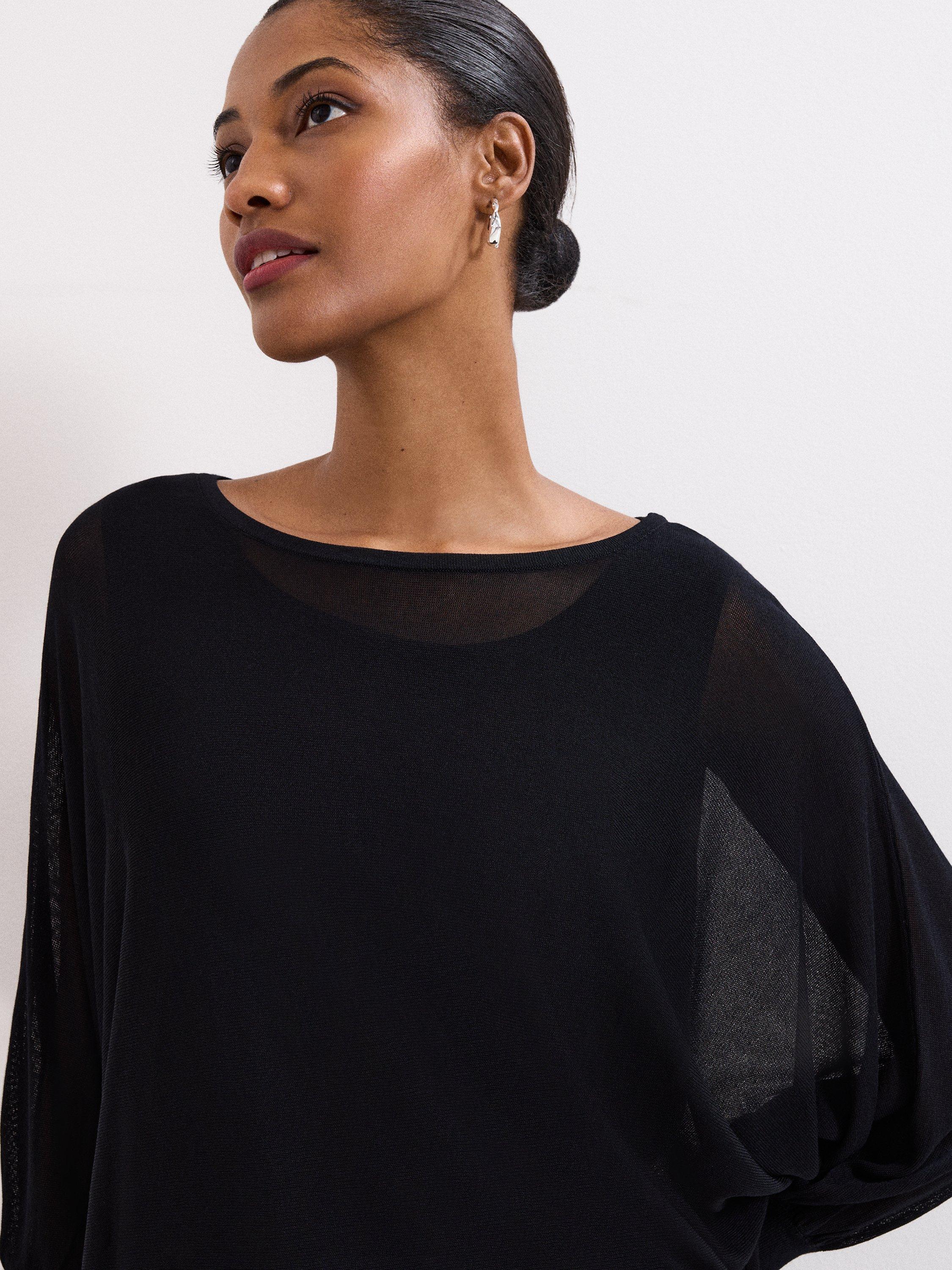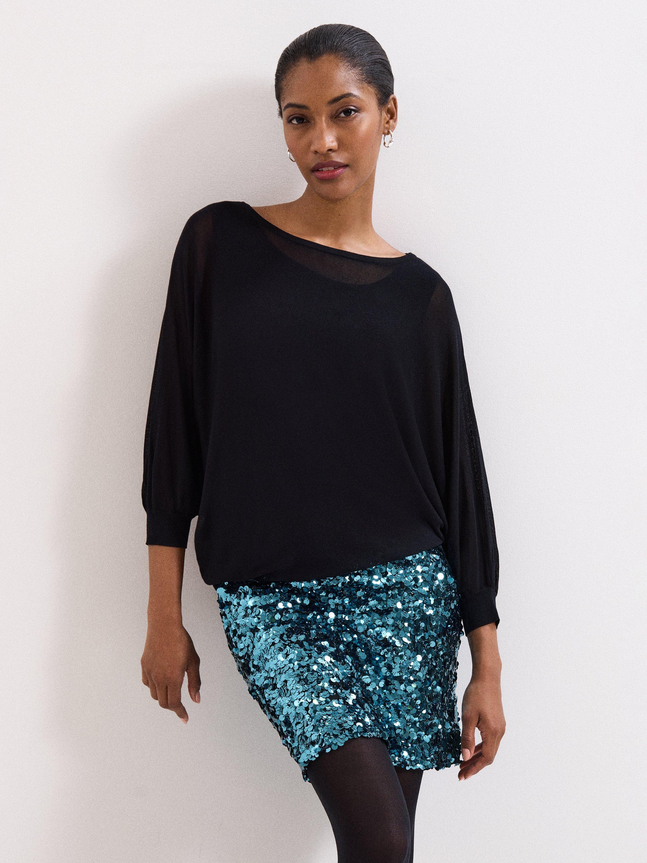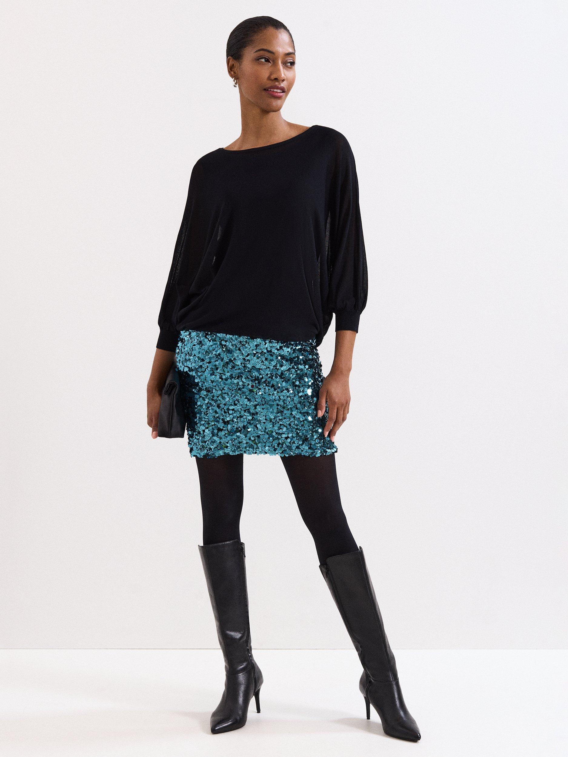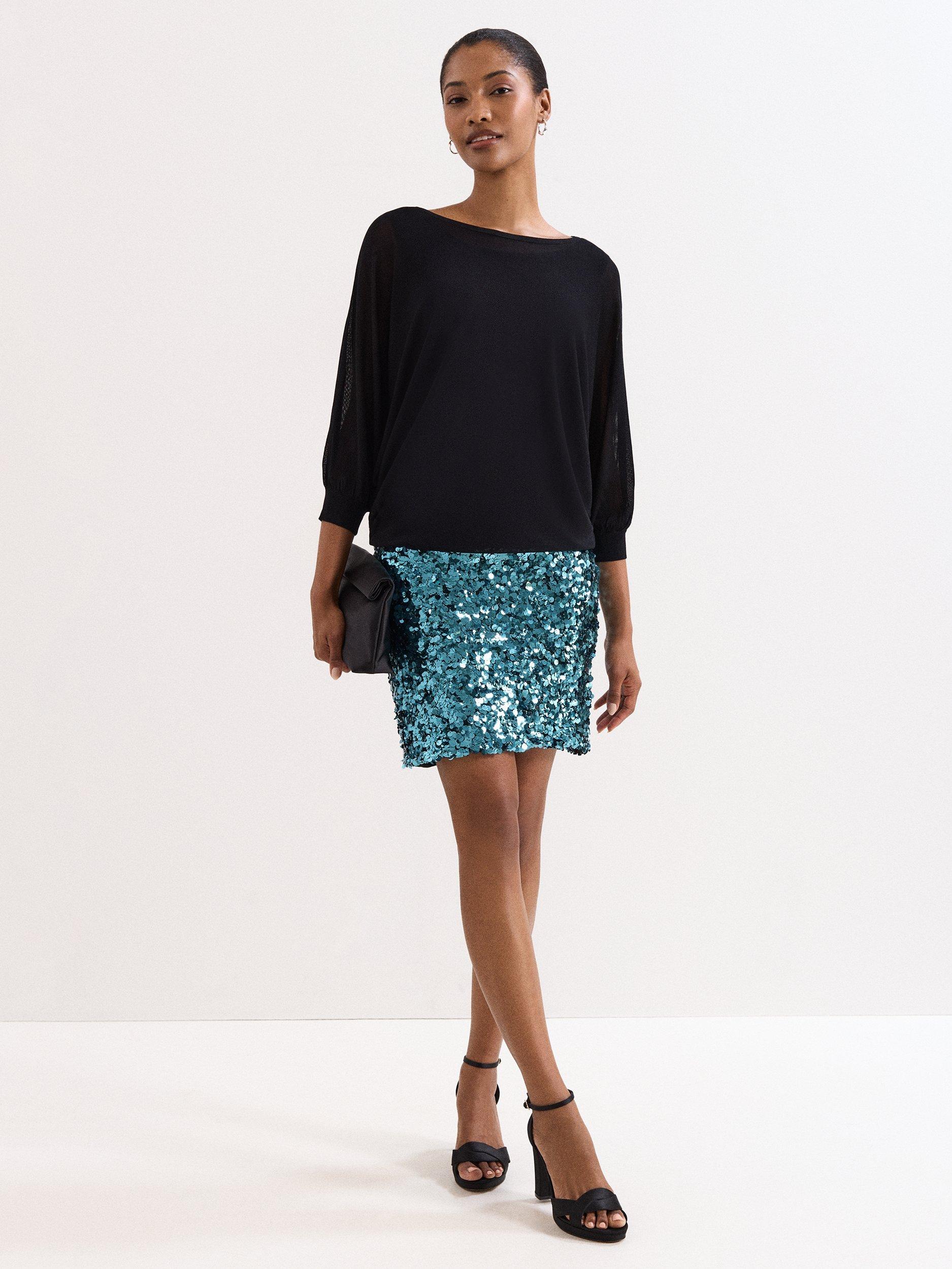 A mini shift party dress, featuring shimmering sequins, a flattering boat neck, and three-quarter sleeves. Offering a comfortable yet striking look for any celebration.