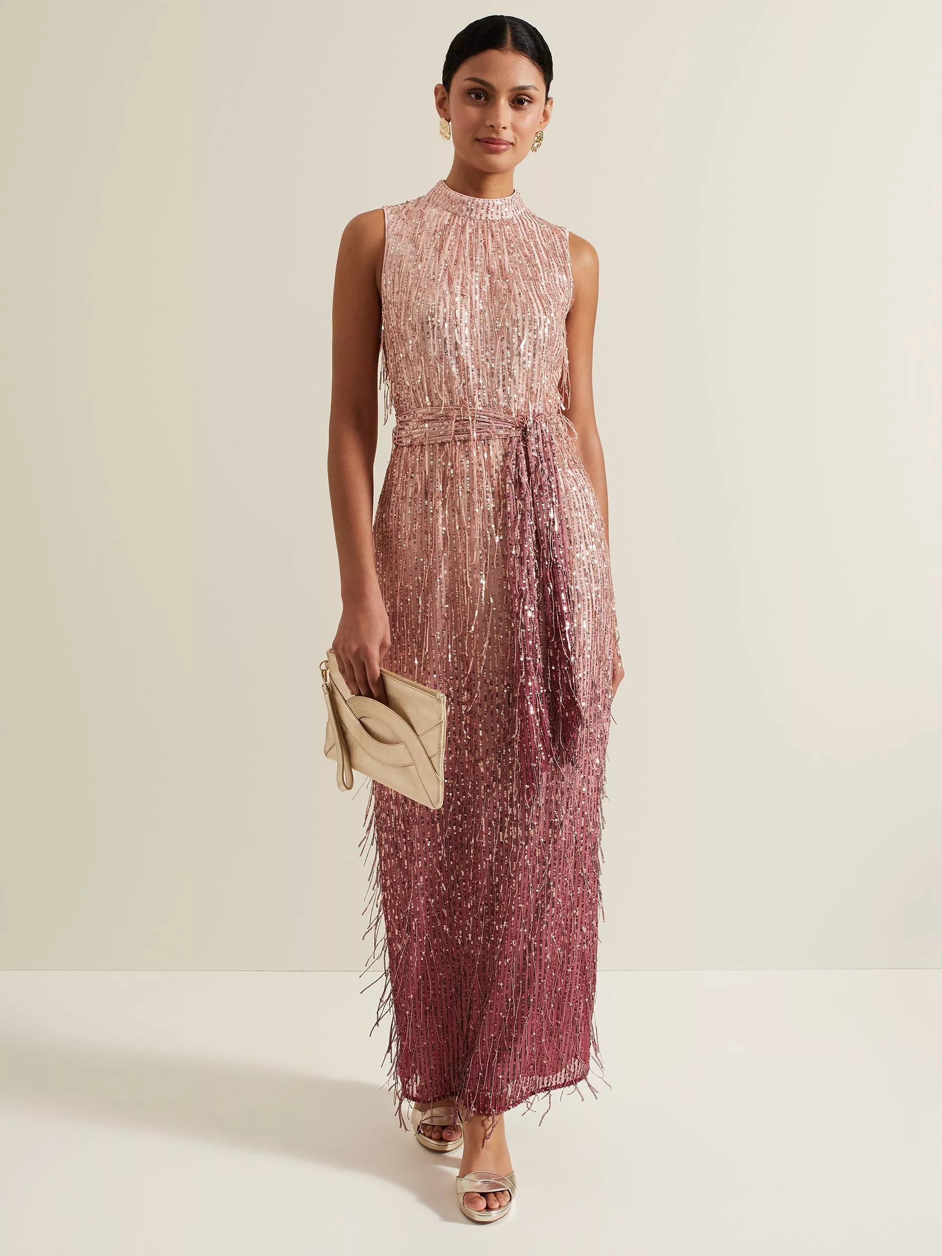 Go all out this party season with the Becka maxi dress. Designed in all-over sparkles, this dress features all-over fringing and a matching belt for added interest.