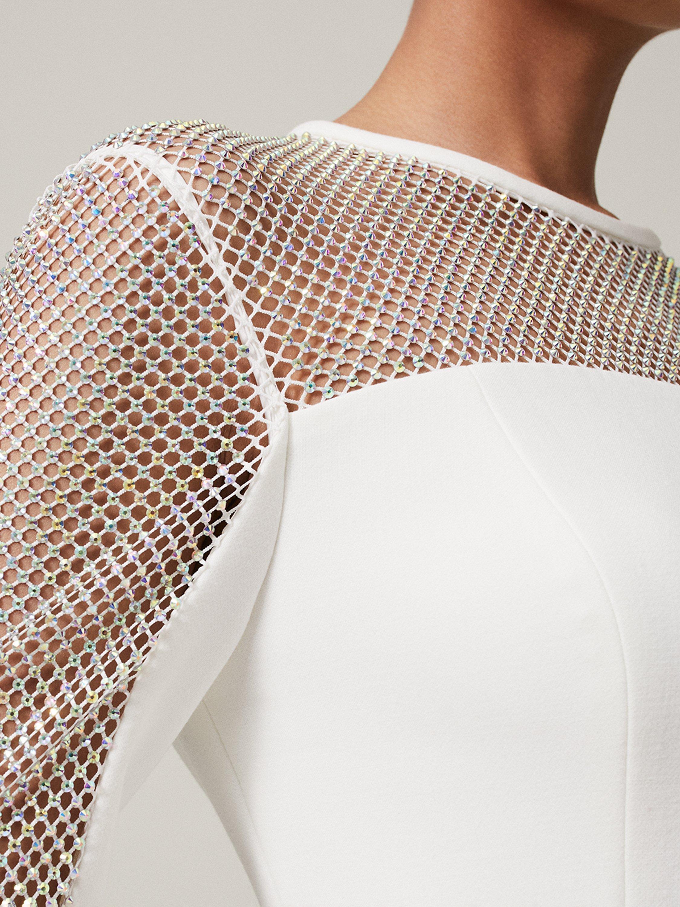 With a mesh style round neckline and three-quarter length sleeves, it gives your evening wardrobe a refresh.